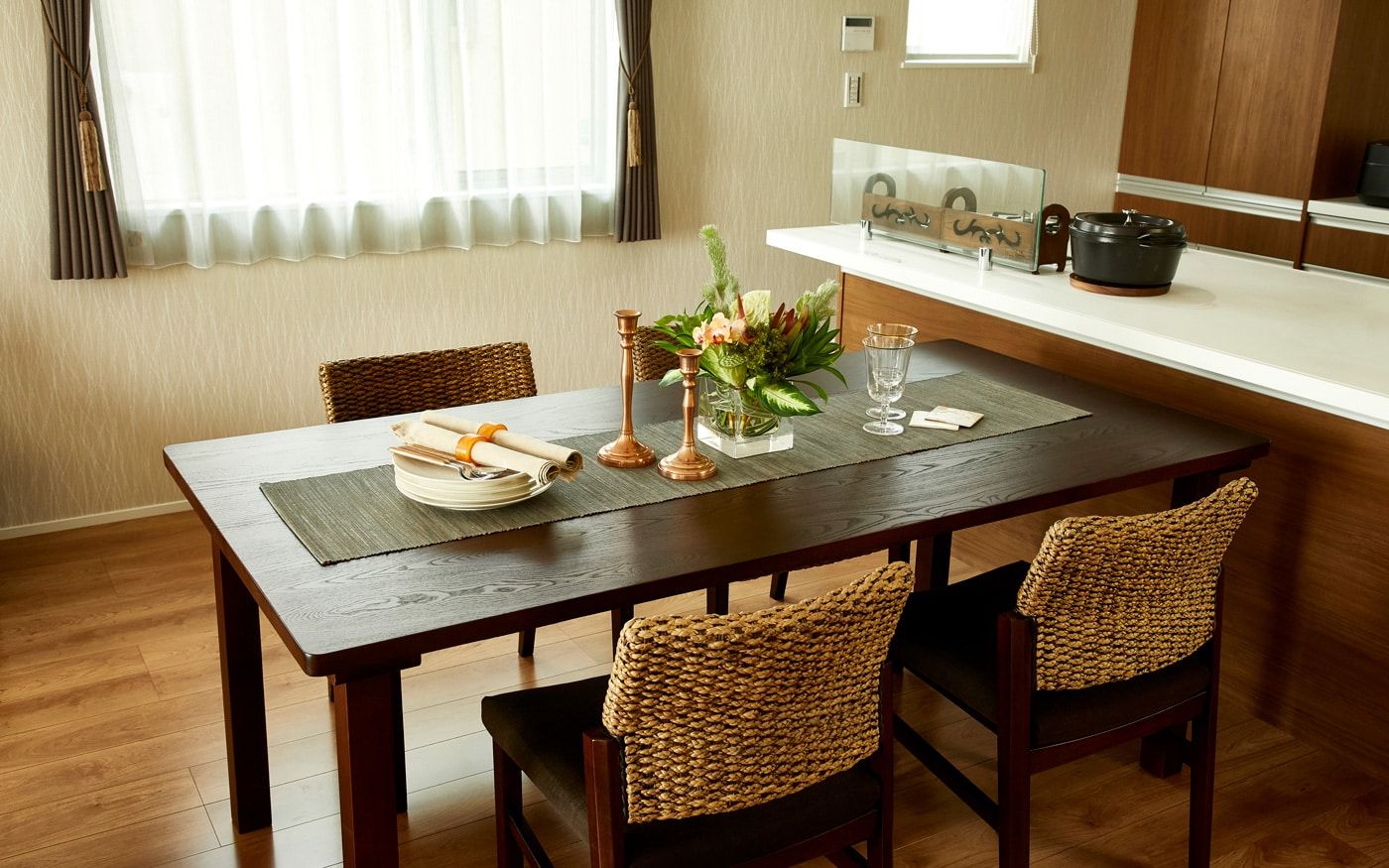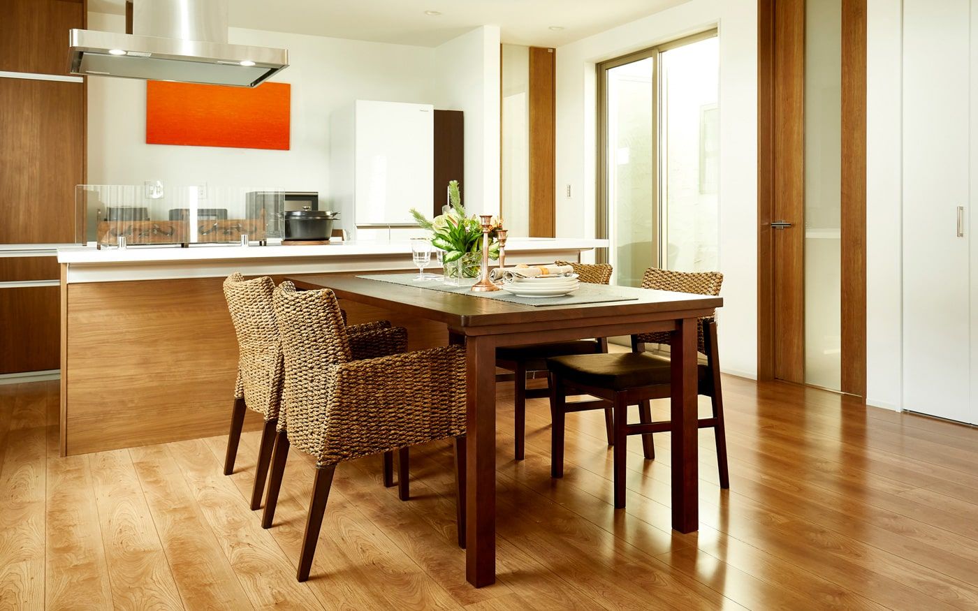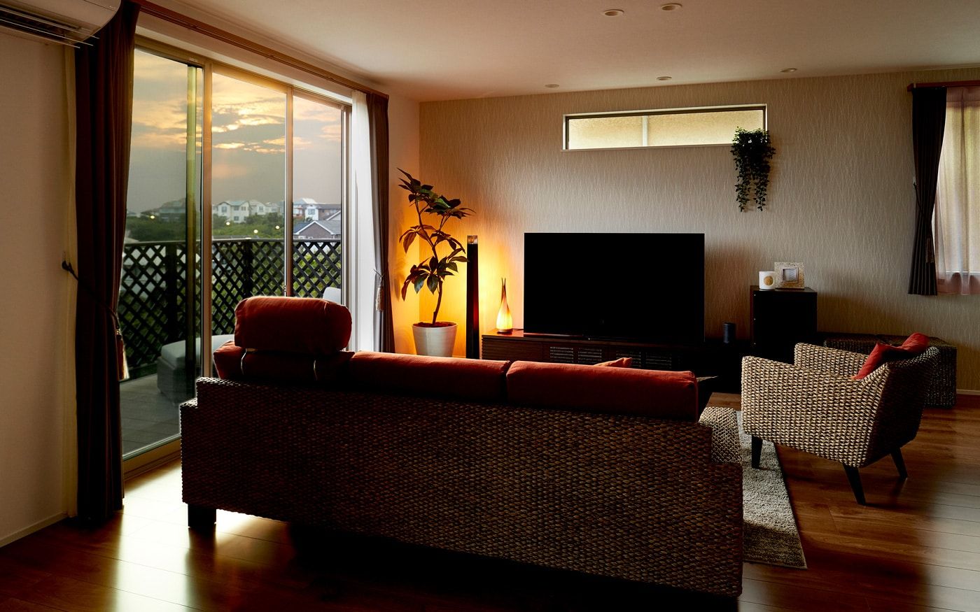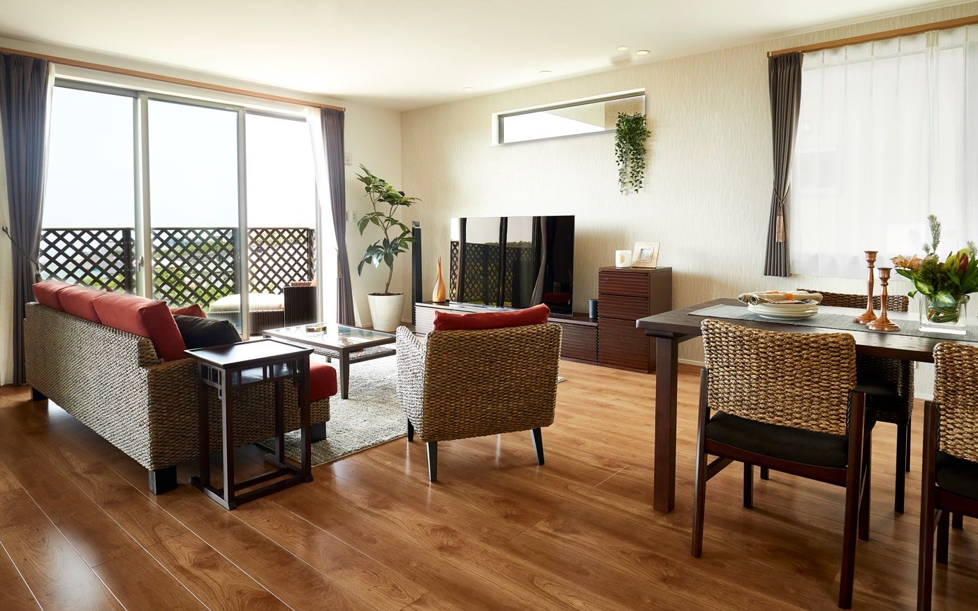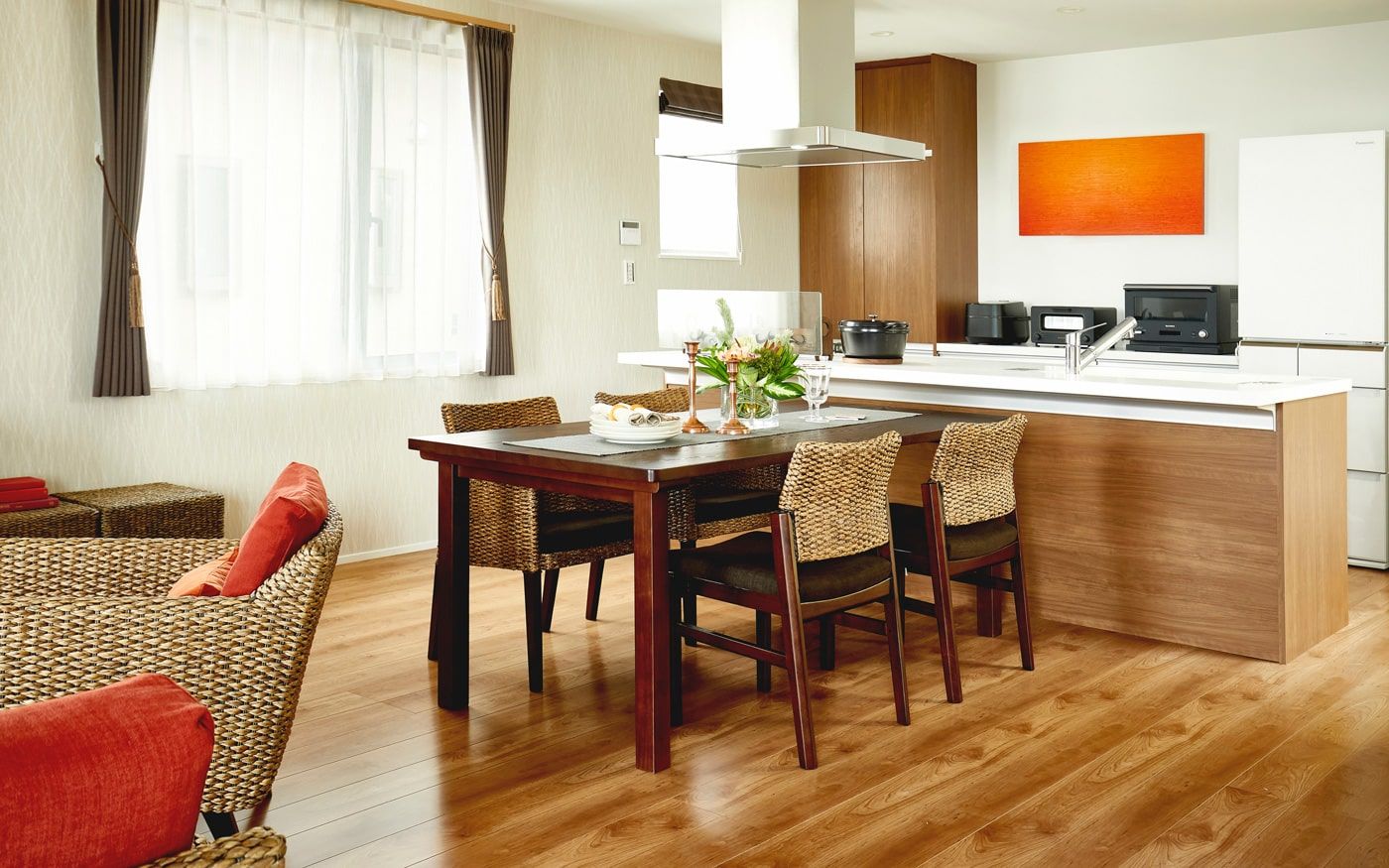 リビングダイニングキッチンには、湘南の「サンセット」をイメージしたカラーコーディネートを取り入れました。レッド・オレンジ・ブラウン・ベージュを丁寧に重ねたカラーコーディネートは、まるで刻一刻と移り変わる夕空のように、ゆったりとした空気感を部屋に纏わせてくれます。