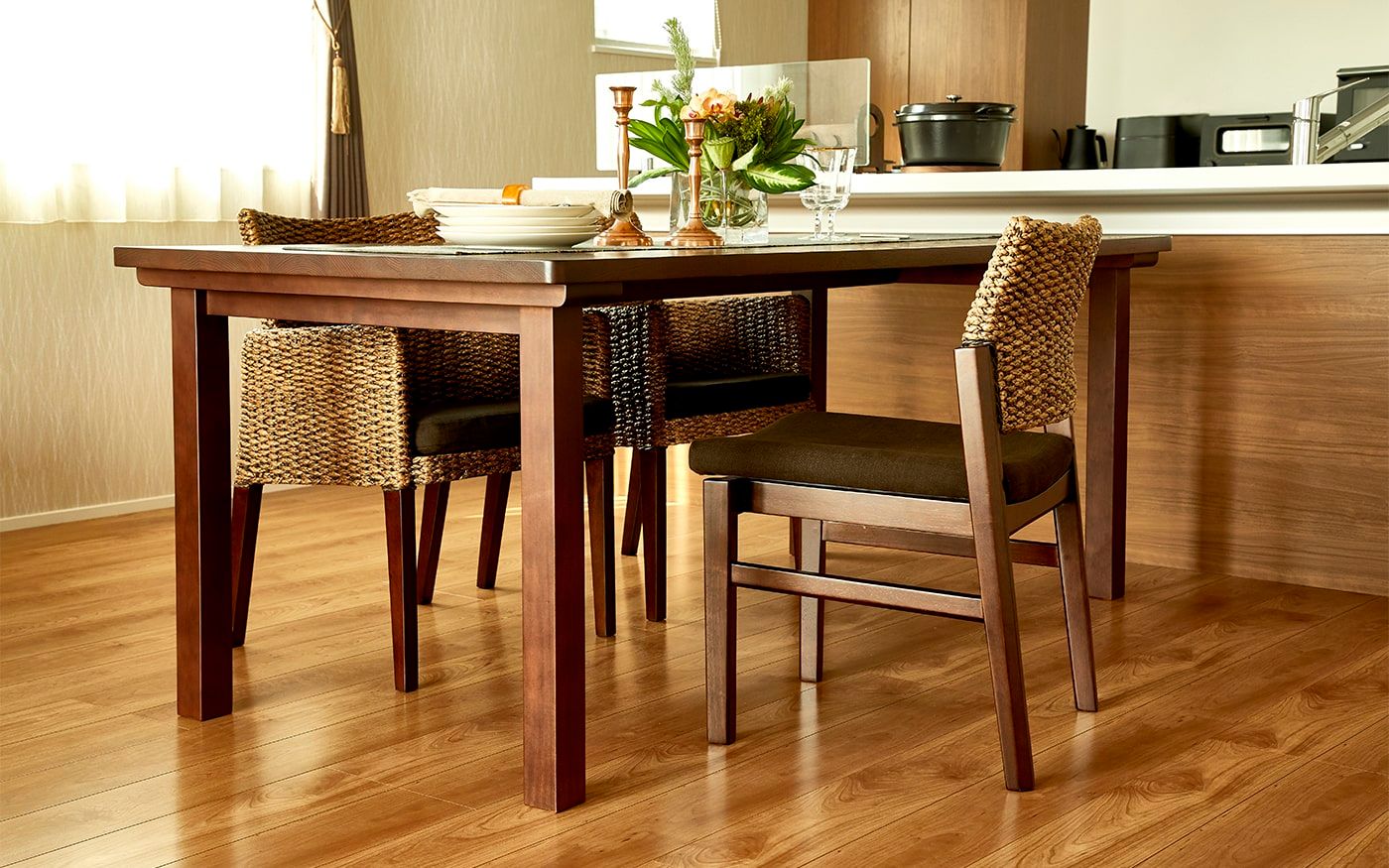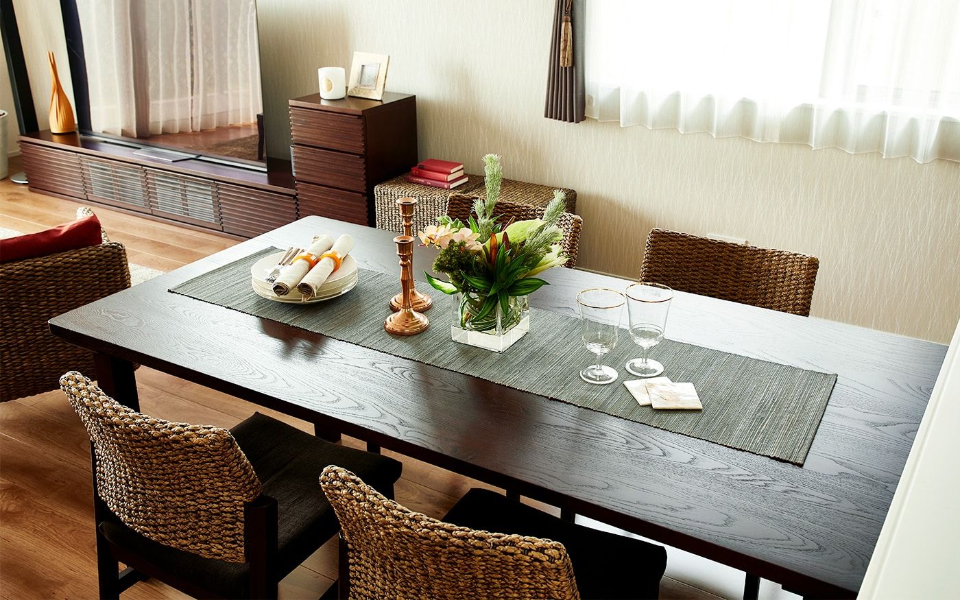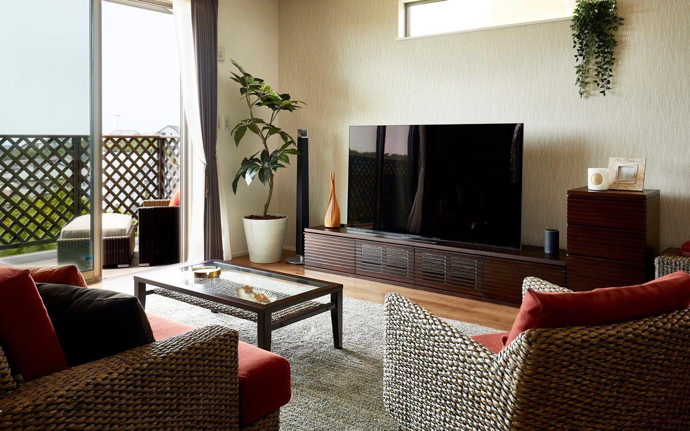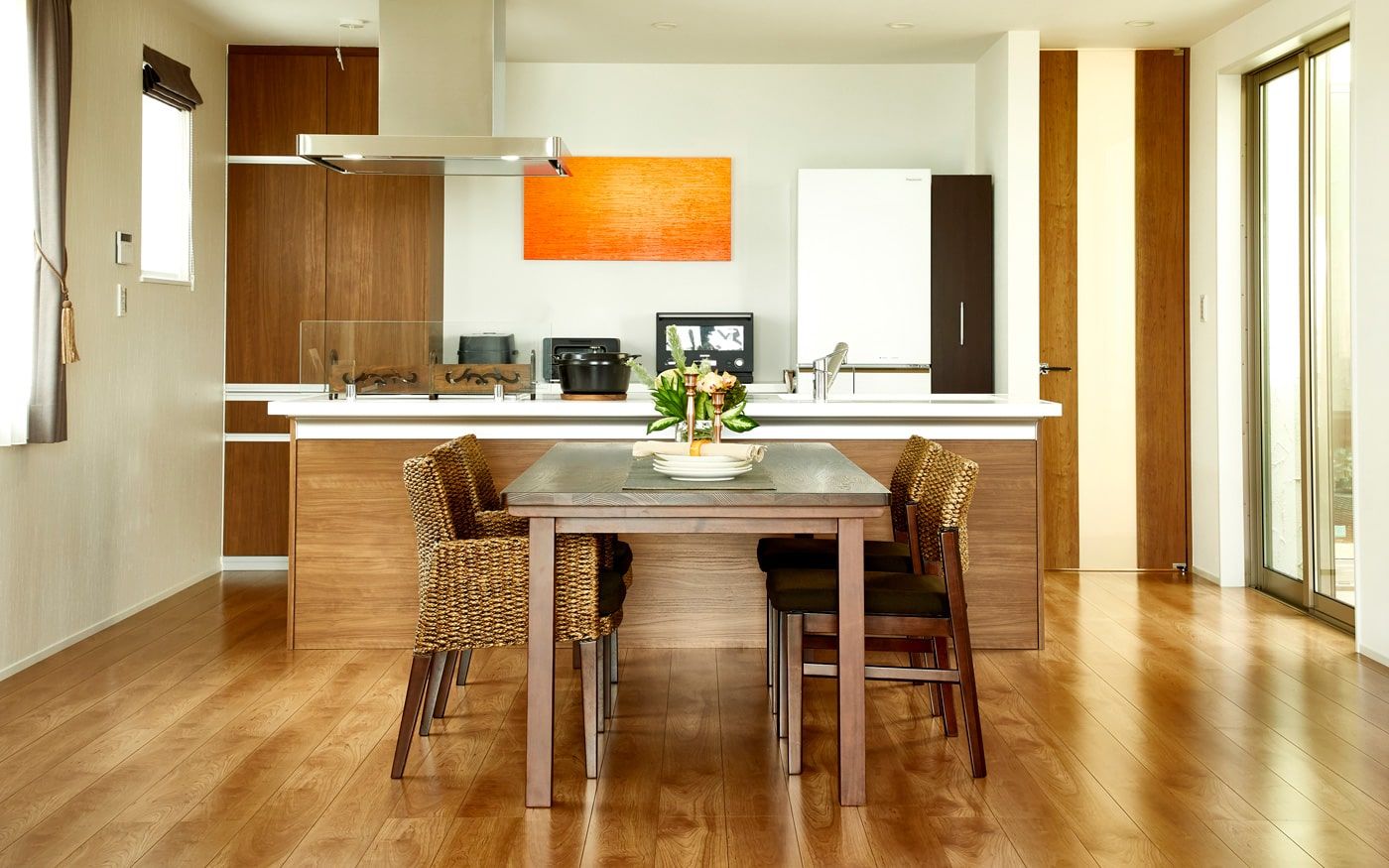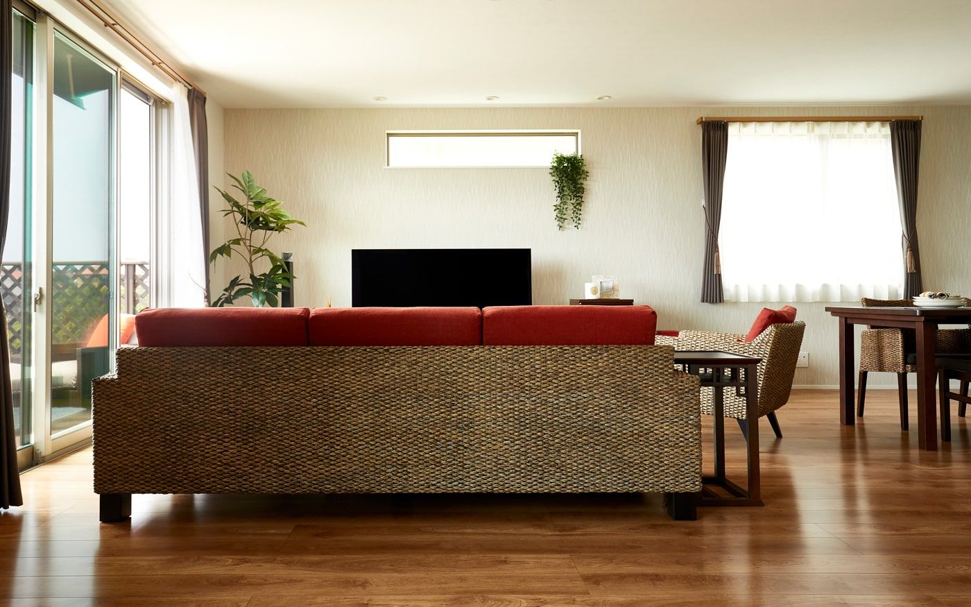 リビングダイニングキッチンには、湘南の「サンセット」をイメージしたカラーコーディネートを取り入れました。レッド・オレンジ・ブラウン・ベージュを丁寧に重ねたカラーコーディネートは、まるで刻一刻と移り変わる夕空のように、ゆったりとした空気感を部屋に纏わせてくれます。