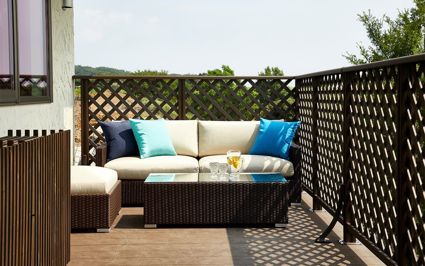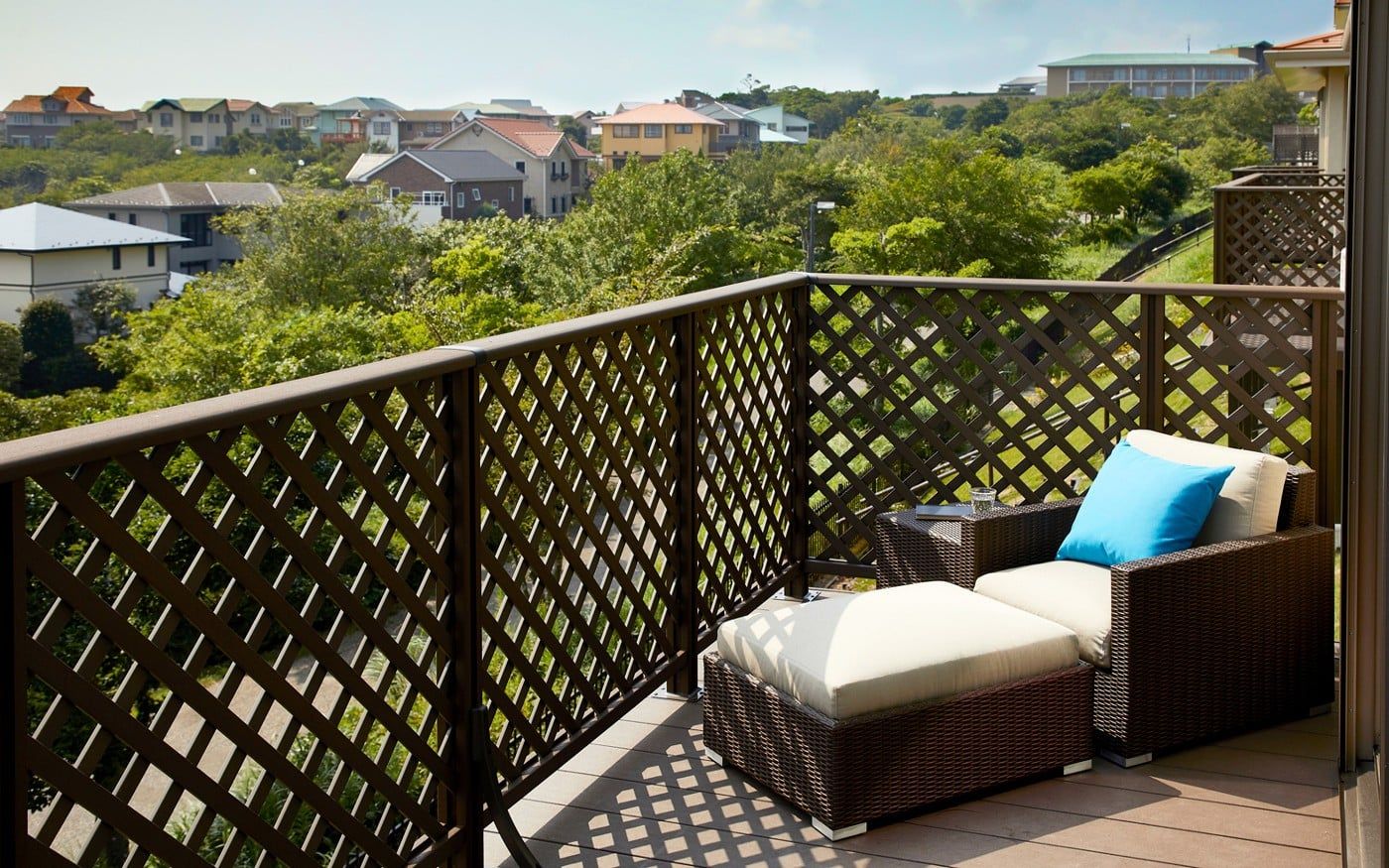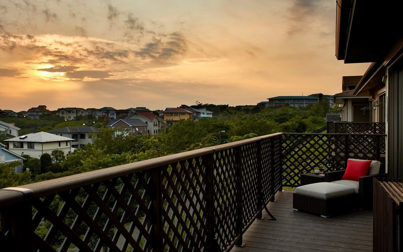 バルコニーでは、湘南の海をイメージしたブルーとホワイトで爽やかなカラーコーディネートを行いました。目を瞑り、光を浴び、風を感じながら自然と一体になって寛ぐ時間。別荘という非日常的な空間だからこそ叶えられる究極の贅沢です。