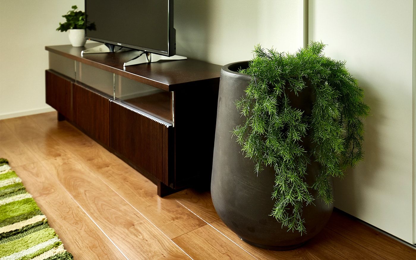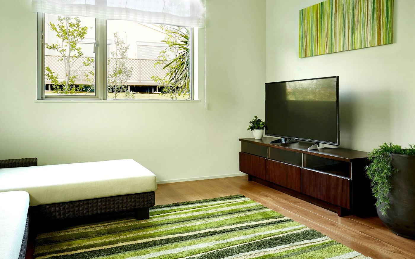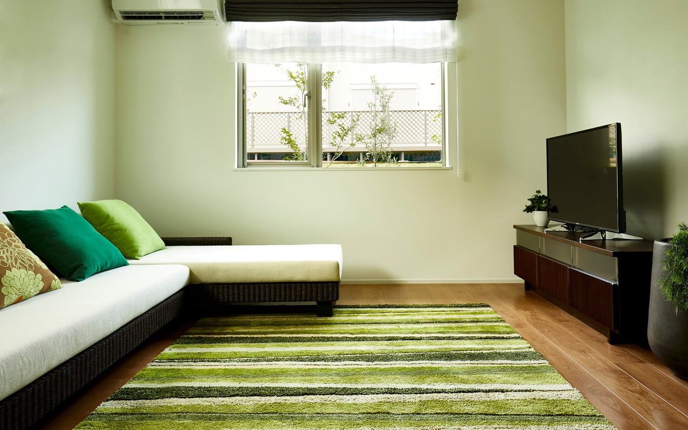 セカンドリビングでは、湘南の雄大な自然の源である山々をイメージして、グリーンのカラーコーディネートを行いました。また、リビングダイニングとは使用目的が異なり、さらにゆったりと過ごせるように、あえてセンターテーブルは置かず、大きなラグを敷いて自由に寛げるレイアウトにした点もポイントです。