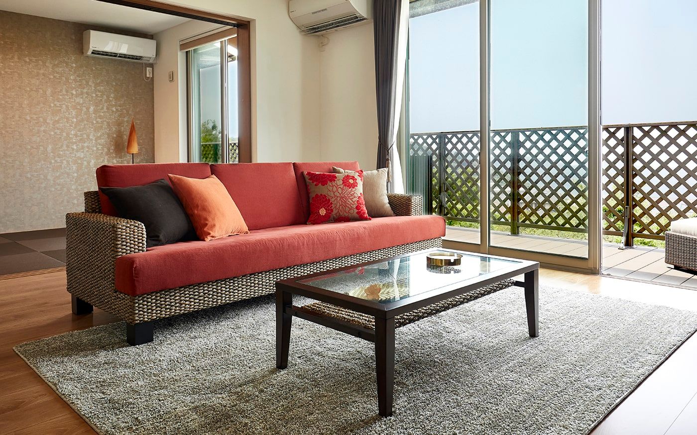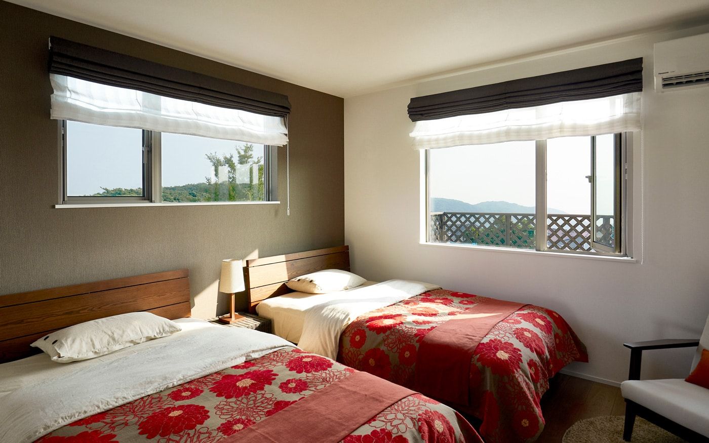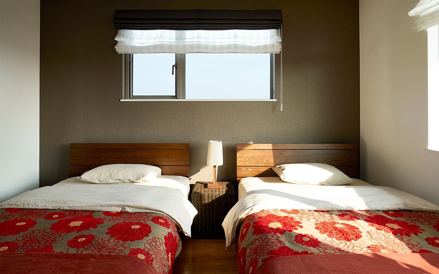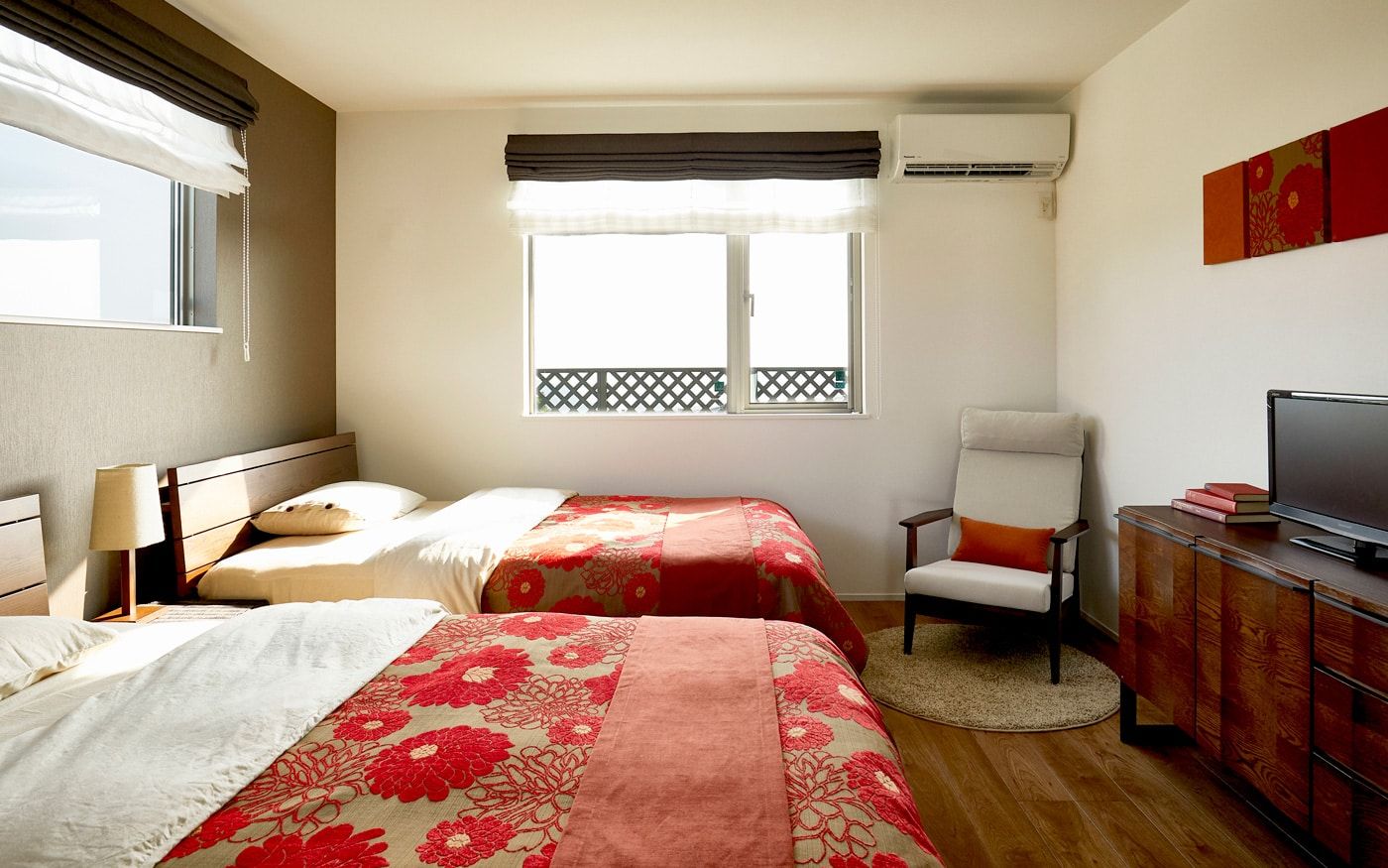 ベッドルームは、リビングダイニングと同様のレッド・オレンジというサンセットカラーでコーディネートを行いました。別荘の中のメインルームであるLDKとベッドルームを同じテイストにすることで、別荘全体に統一感が生まれ、まるでリゾートのヴィラのような感覚に。