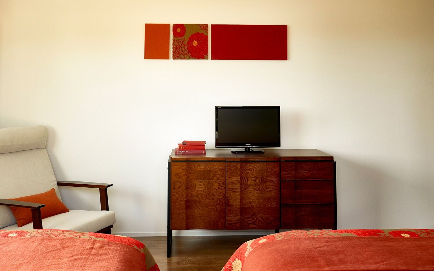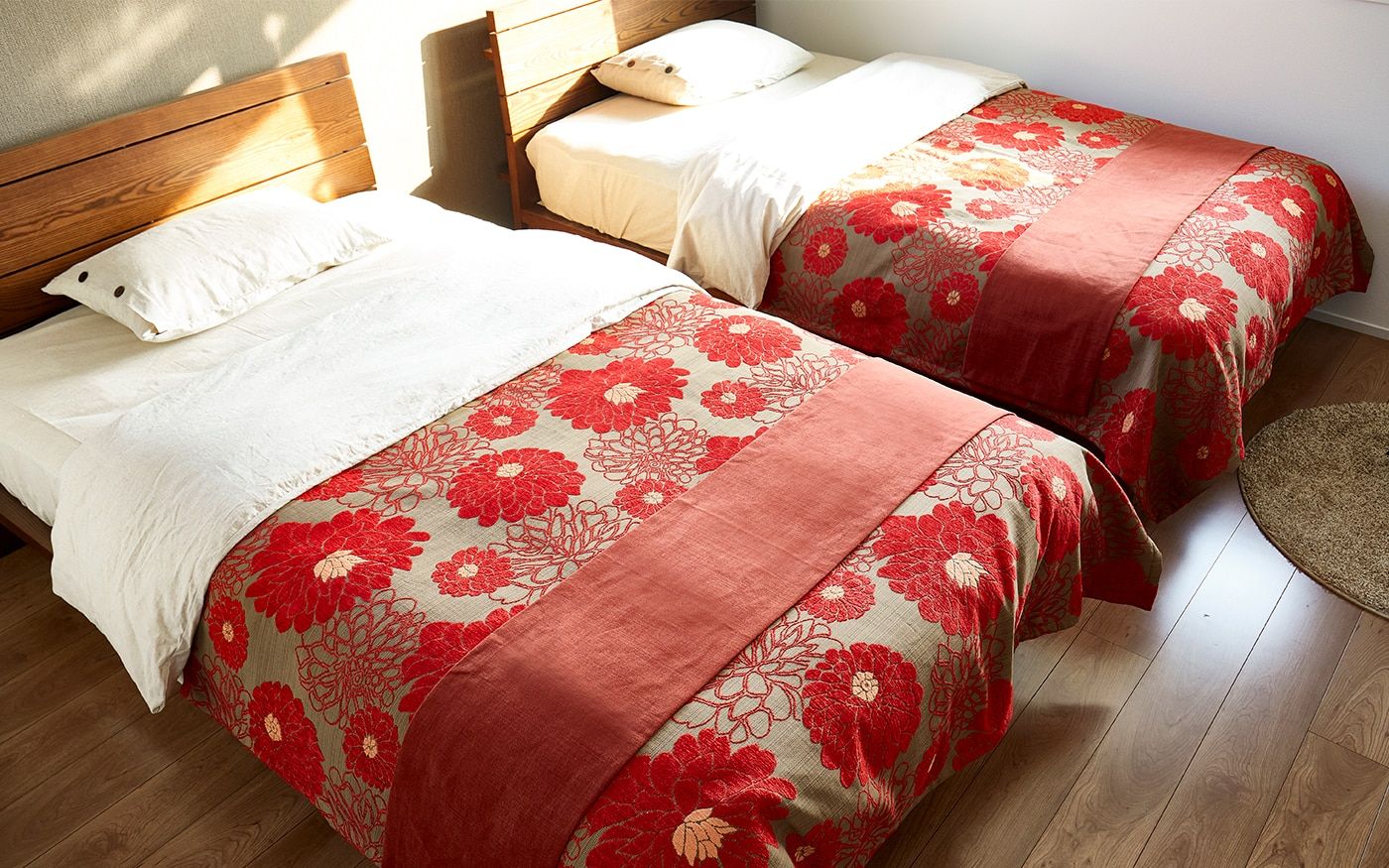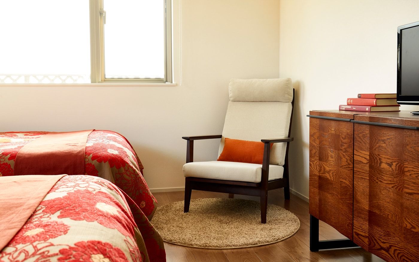 ベッドルームは、リビングダイニングと同様のレッド・オレンジというサンセットカラーでコーディネートを行いました。別荘の中のメインルームであるLDKとベッドルームを同じテイストにすることで、別荘全体に統一感が生まれ、まるでリゾートのヴィラのような感覚に。