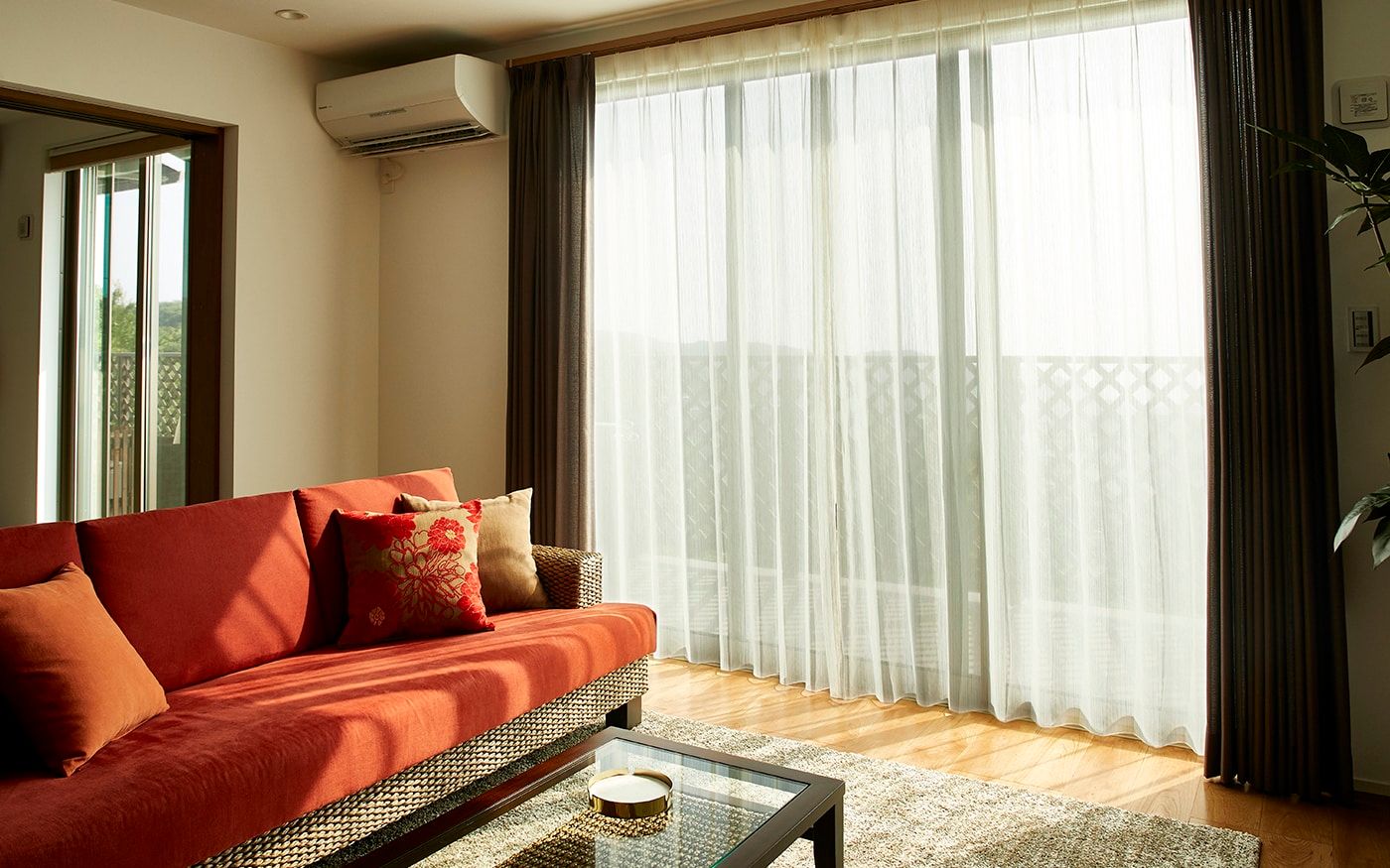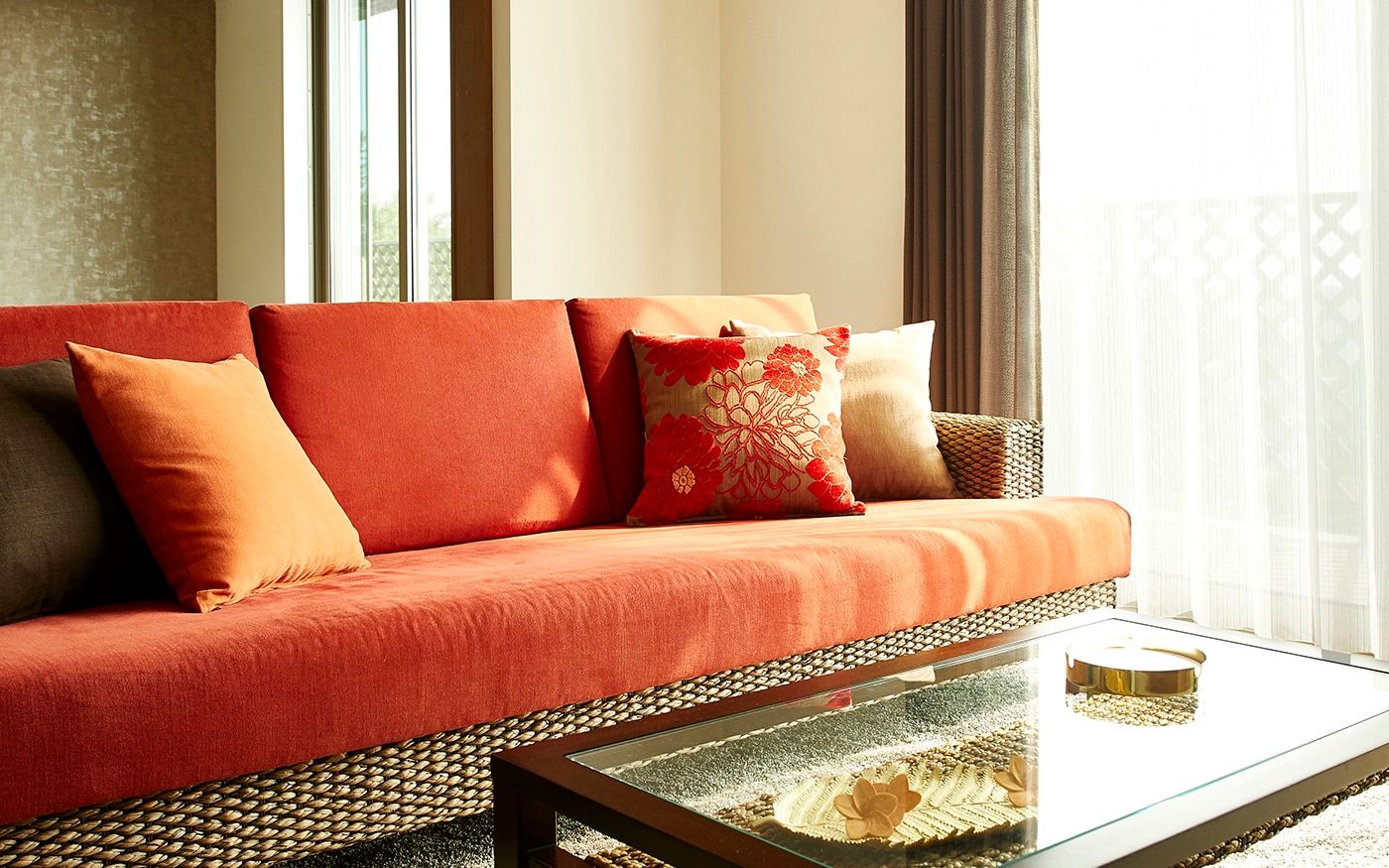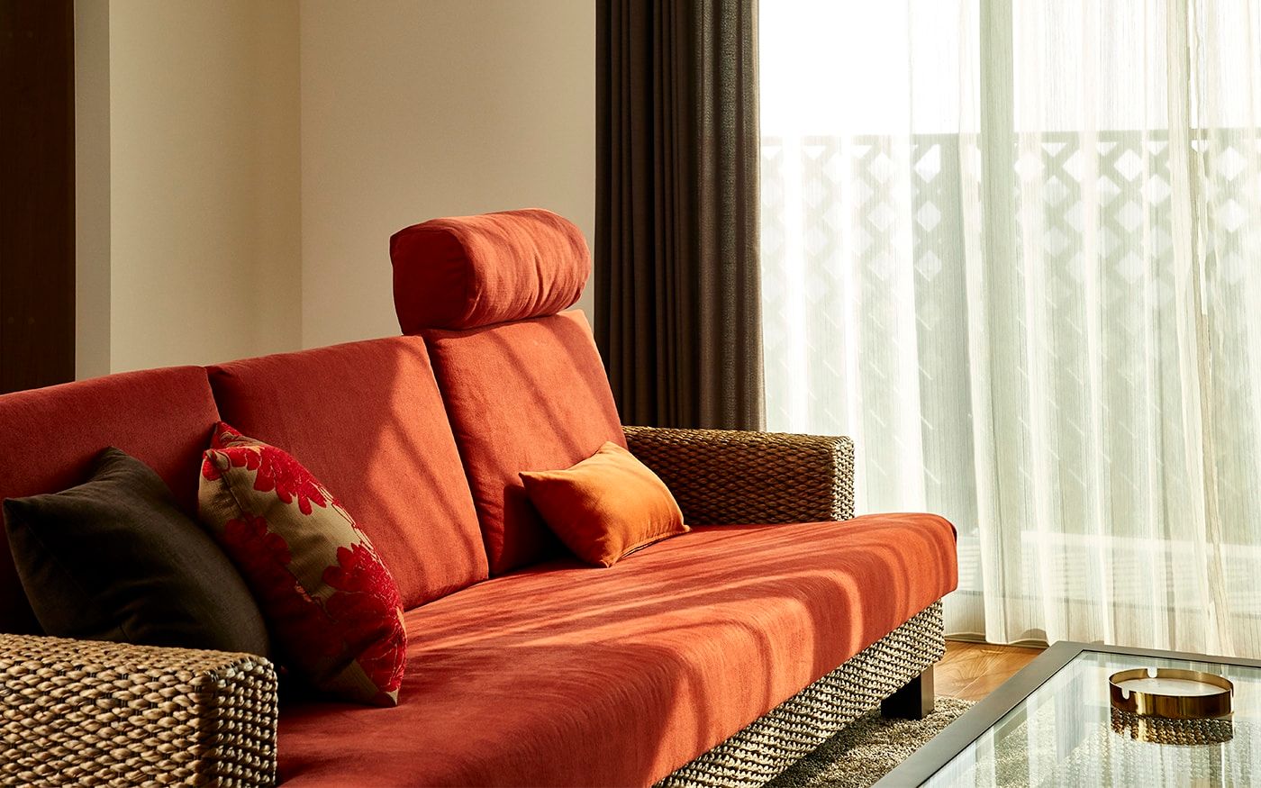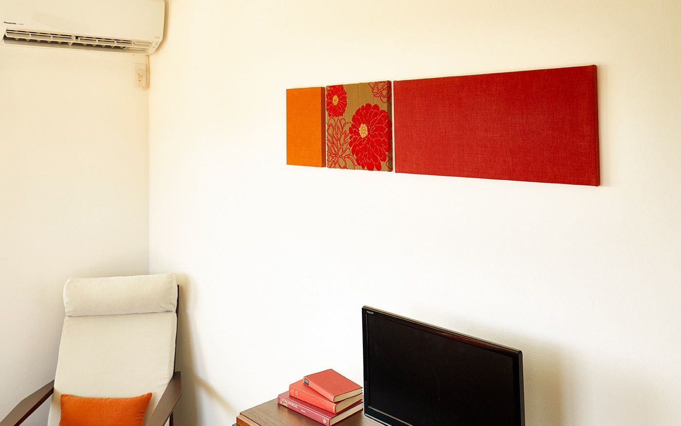 ベッドルームは、リビングダイニングと同様のレッド・オレンジというサンセットカラーでコーディネートを行いました。別荘の中のメインルームであるLDKとベッドルームを同じテイストにすることで、別荘全体に統一感が生まれ、まるでリゾートのヴィラのような感覚に。