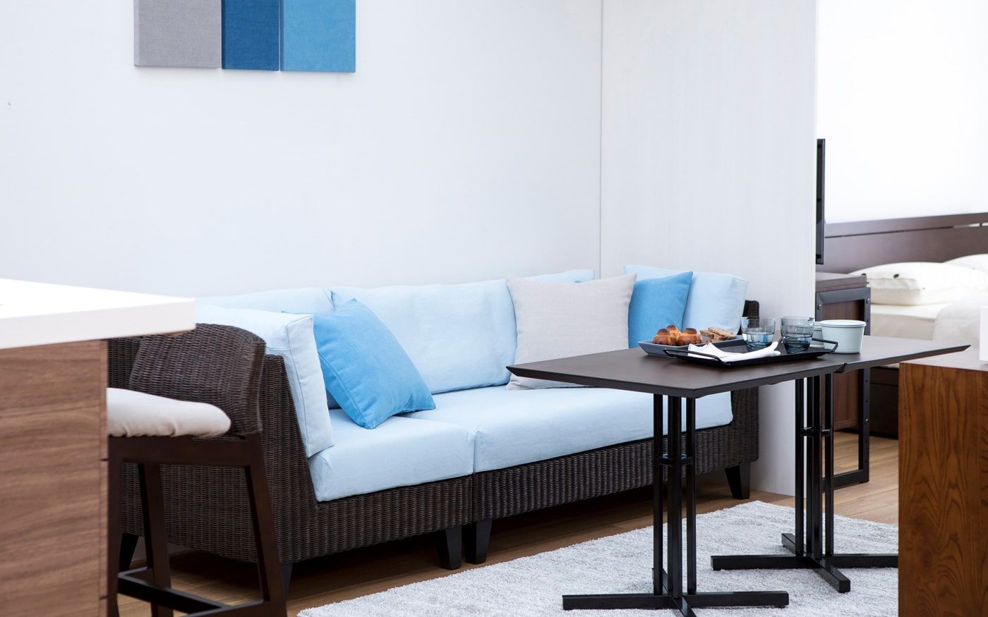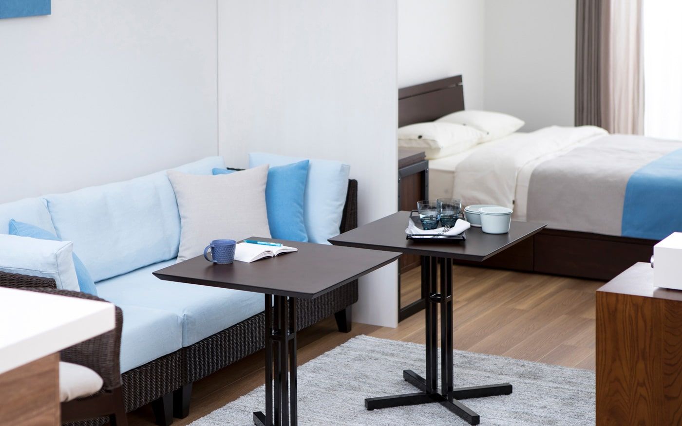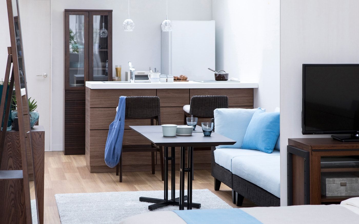 1LDKでLD8畳の場合、ソファとダイニングを両方配置するとレイアウトが窮屈になる可能性が有ります。もし、両方の家具を置きたい時は、コンパクトなソファ+カフェテーブルを置くレイアウトがお薦めです。生活動線を確保しながら、二人でもゆったり寛ぎながら食事もできる部屋になります。