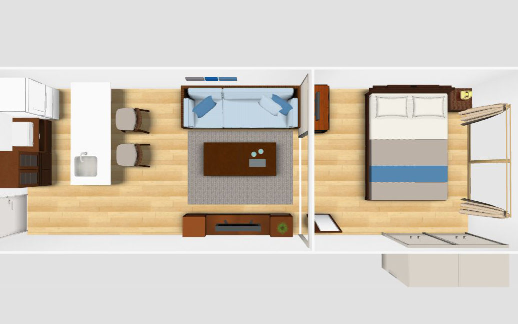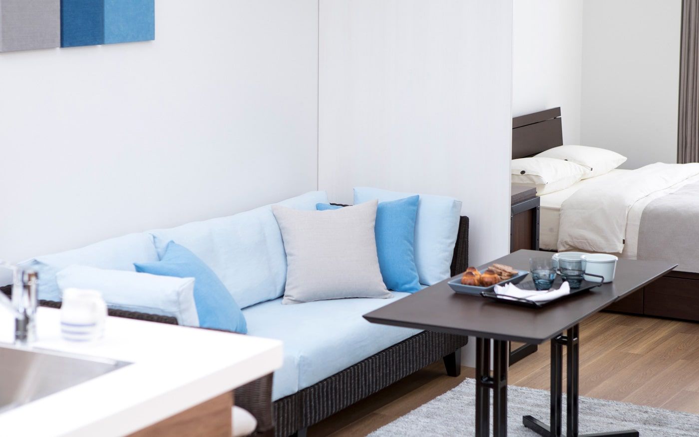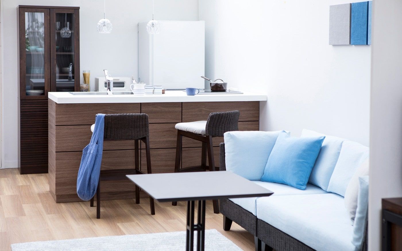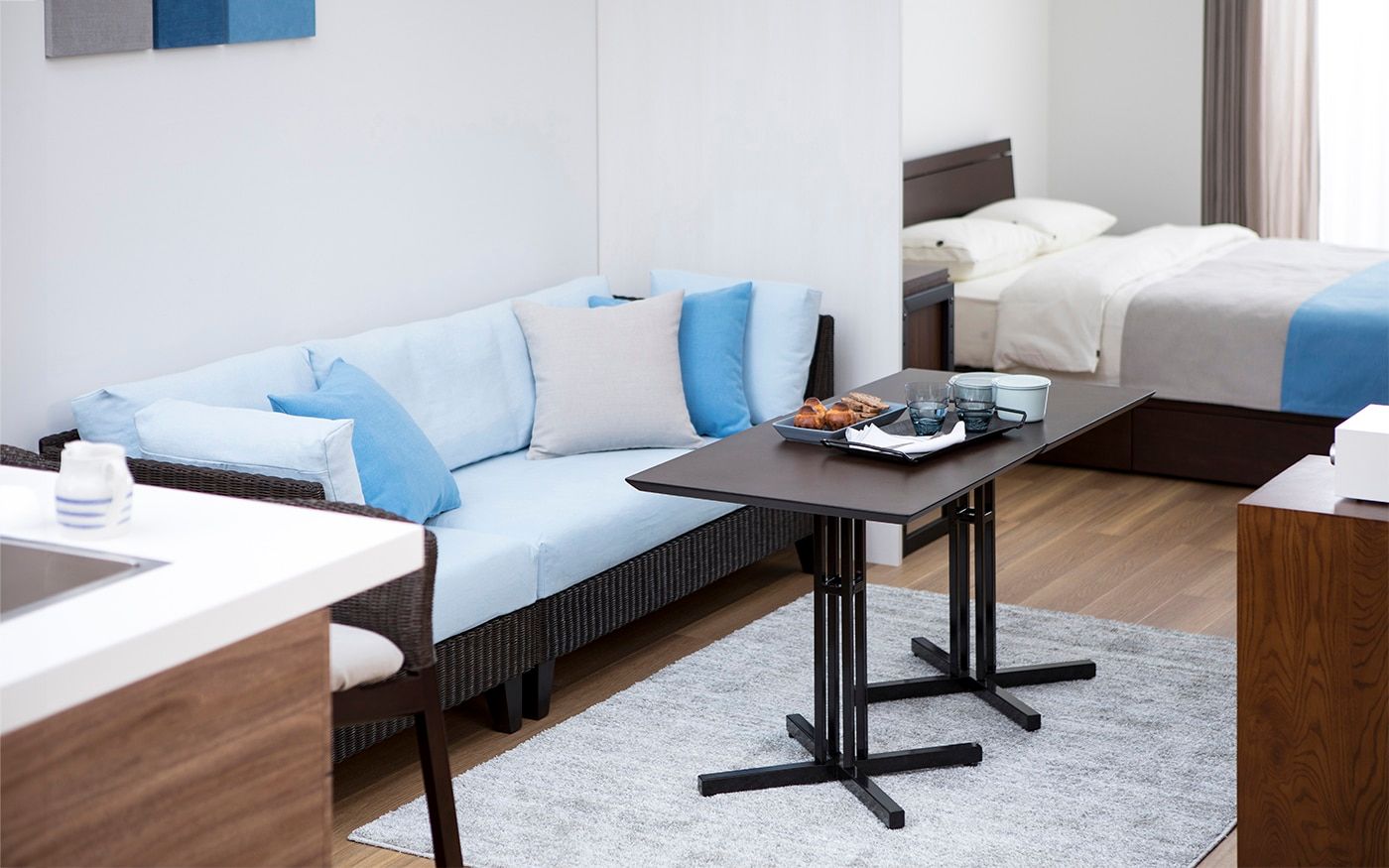 1LDKでLD8畳の場合、ソファとダイニングを両方配置するとレイアウトが窮屈になる可能性が有ります。もし、両方の家具を置きたい時は、コンパクトなソファ+カフェテーブルを置くレイアウトがお薦めです。生活動線を確保しながら、二人でもゆったり寛ぎながら食事もできる部屋になります。