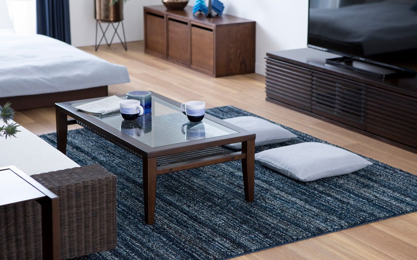圧迫感の無いローソファを中心に家具を揃えることで、ソファで寛ぐ以外にも床座生活がしやすくなります。正方形の大きいラグマットや座布団をソファ前に置けば、友人が来た際などに皆で団欒しやすい部屋を作ることも可能です。
