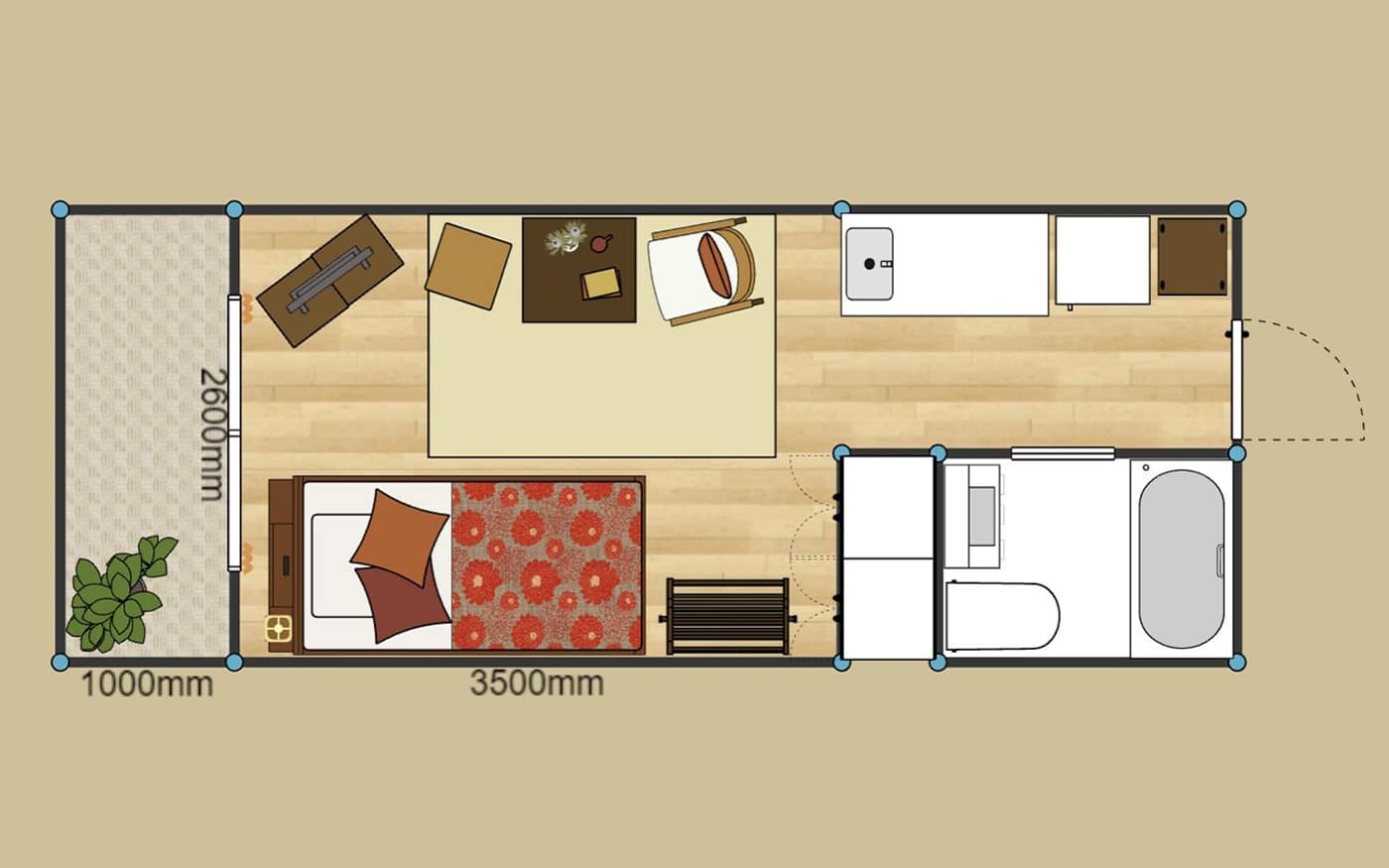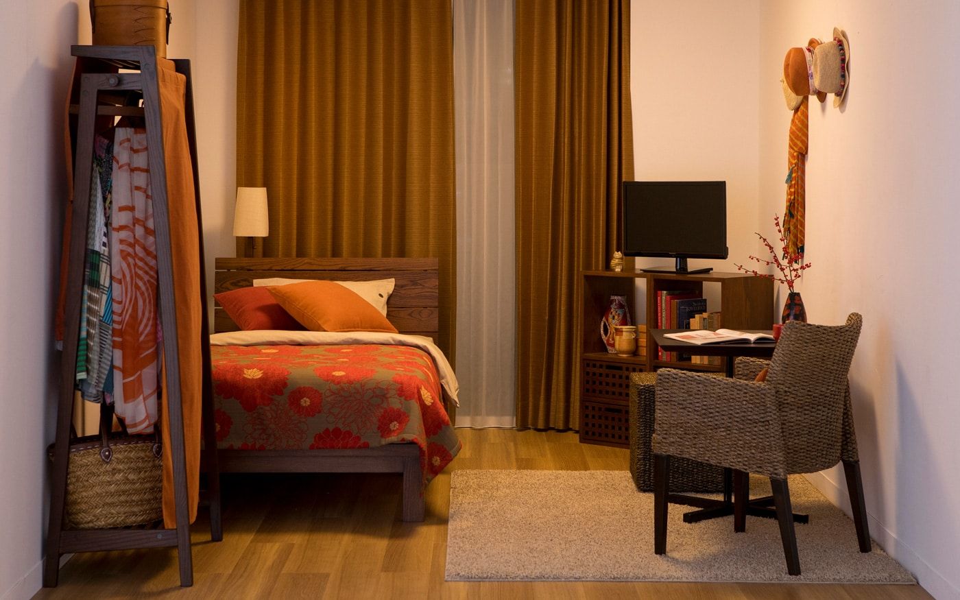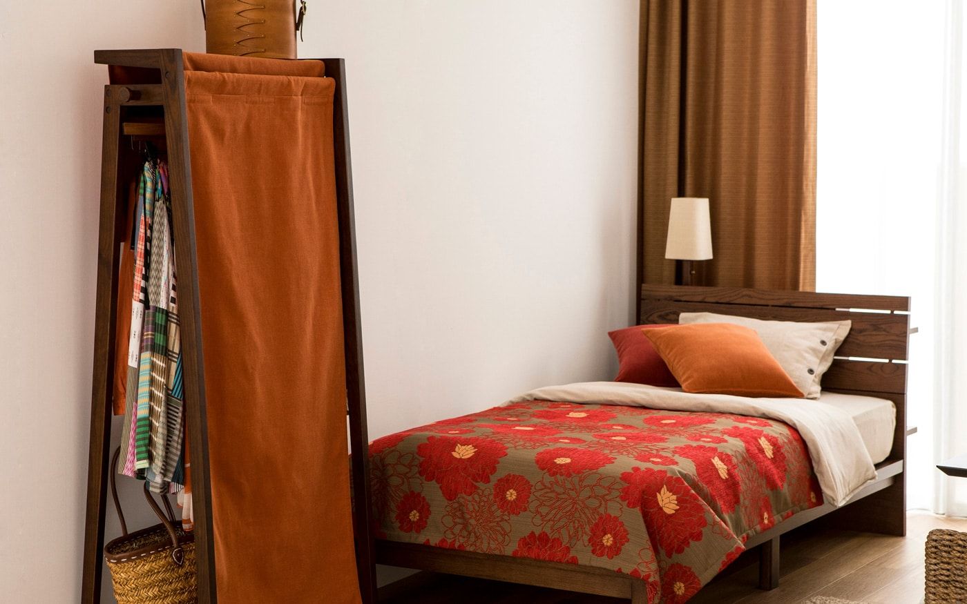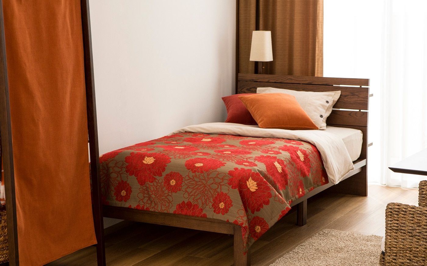 ハワイや南国に咲く、色とりどりの鮮やかな花などをイメージして、暖色系のオレンジとレッドを中心にカラーコーディネートしてみましょう。一人暮らしのワンルームでは、クッションやベッドスプレッド、カーテンにビビットな色を入れるのがおすすめです。