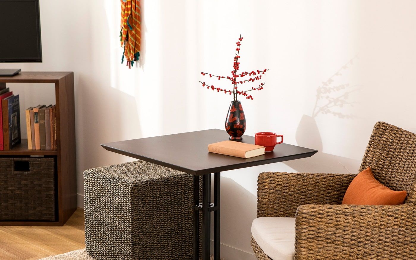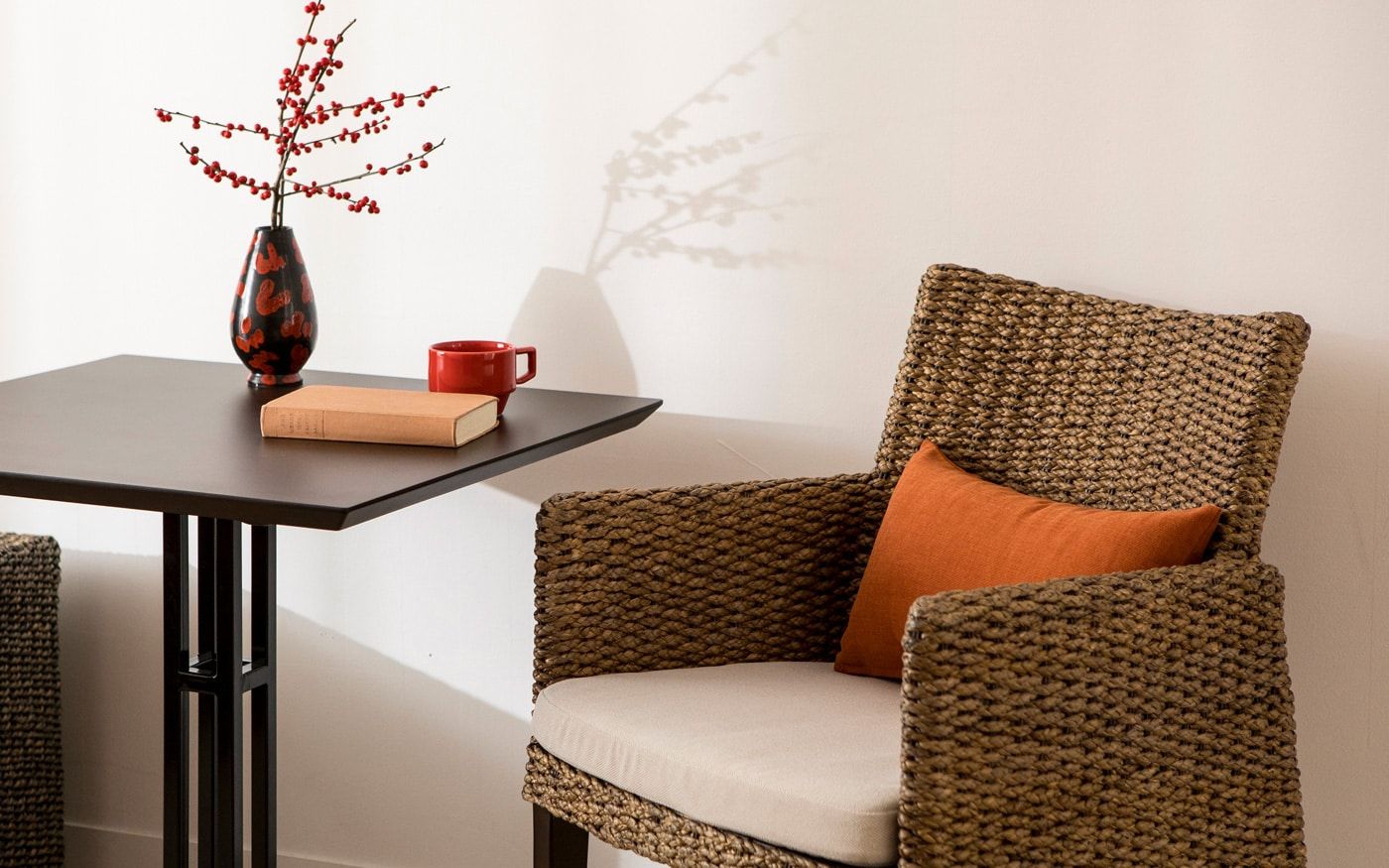 ワンルームなどコンパクトな空間でもポイントを押さえれば、ハワイアンインテリアは楽しめます。まず、ベースの家具は素材感、ぬくもり感のあるものを選びましょう。編み込みが特徴的なヒヤシンス素材のチェアはワンルームでも取り入れやすいアイテムです。