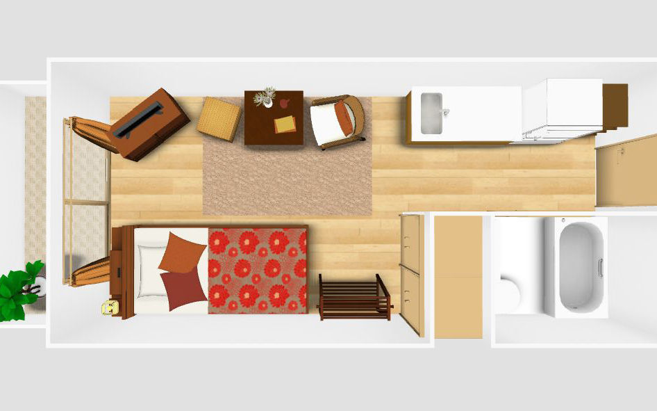 ハワイや南国に咲く、色とりどりの鮮やかな花などをイメージして、暖色系のオレンジとレッドを中心にカラーコーディネートしてみましょう。一人暮らしのワンルームでは、クッションやベッドスプレッド、カーテンにビビットな色を入れるのがおすすめです。