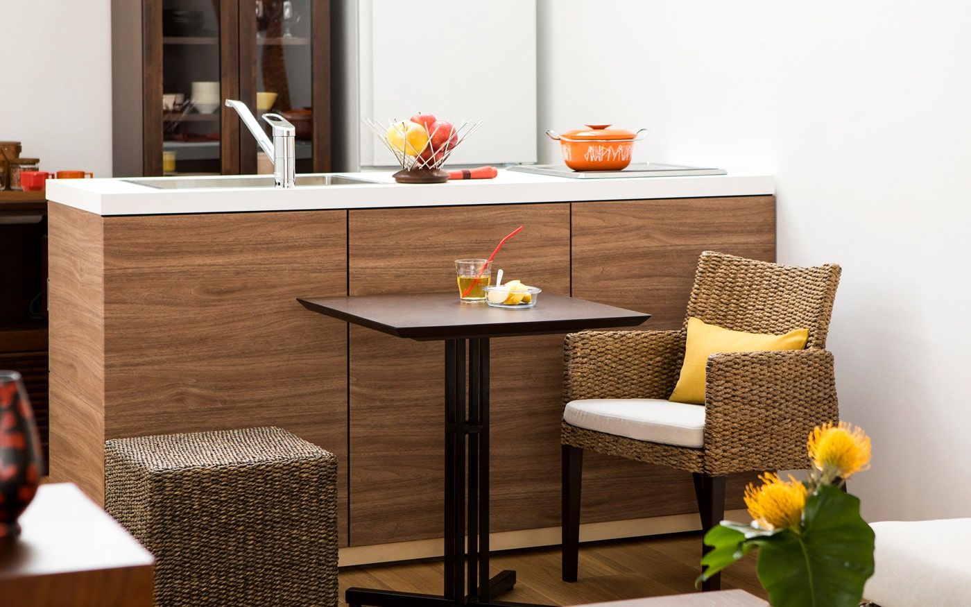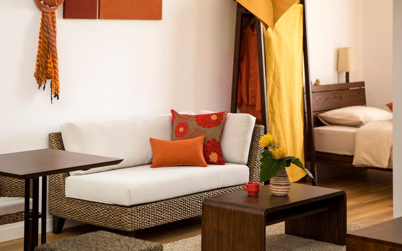 一人暮らしのお部屋に非日常を取り入れたい方へ。南国リゾートを思わせる温もりのあるカラーパレットを基調としたインテリアで、日々の生活に彩りを。ベッドスプレッドを変えるだけで、部屋の雰囲気は一新。間接照明を加えれば、やわらかな光が空間に深みを与えます。