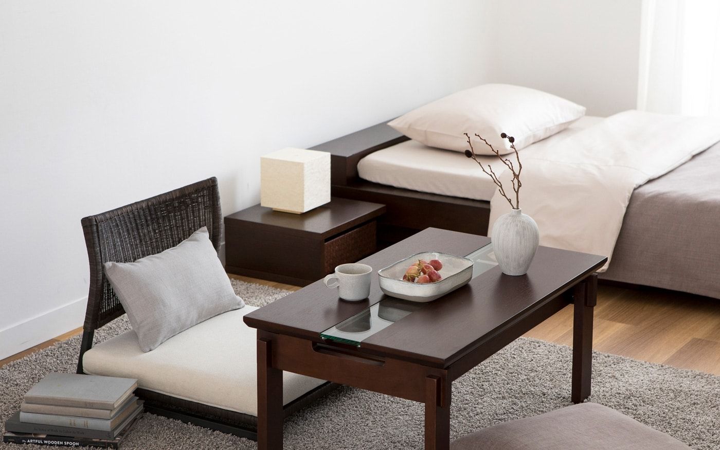限られた間取りの約1/3面積を占めるベッドをローベッドにすれば、床座のロースタイル空間が楽しめると言っても良いでしょう。布団を敷く形も有りますが、万年床になってしまったり見た目も生活感が出てしまう可能性が有ります。例えば、低めのローベッド+硬めのウレタンマットレスにすれば見た目も良く、ベッドの上でも胡坐座りなどして、床座暮らしがより楽しめるでしょう。