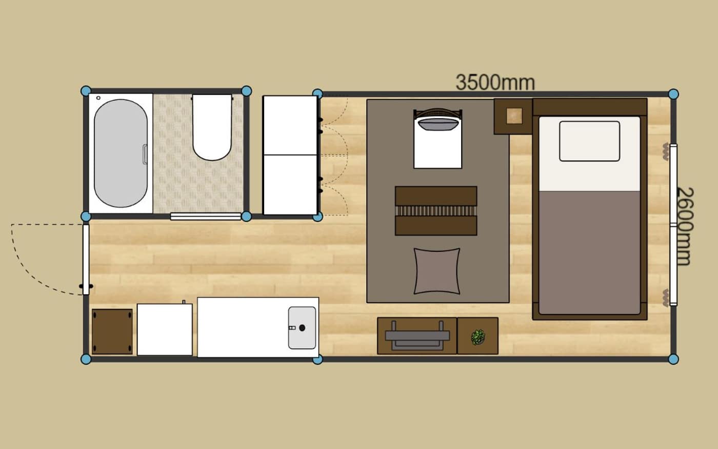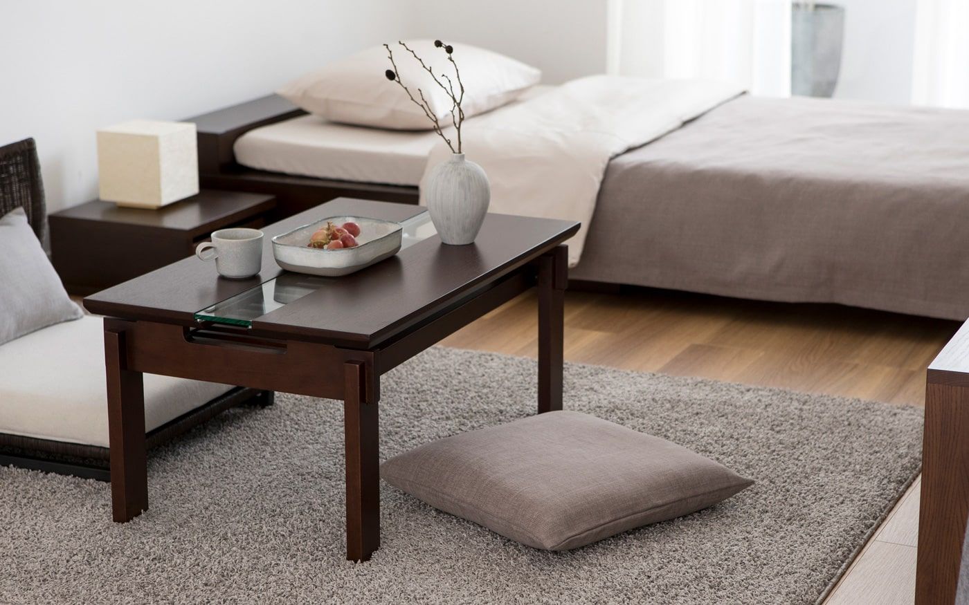 コンパクトな間取りで床座暮らしする場合、高さのある家具は出来るだけ置かず、低めのロースタイルで統一するのが基本の家具選びです。ワンルーム6畳の場合、ベッド、テーブル、テレビボードを最低限の家具として配置する傾向に有ります。それらを出来るだけ低い家具で揃えて、床で過ごせるためのラグを敷けば、床での生活がスタートできます。
