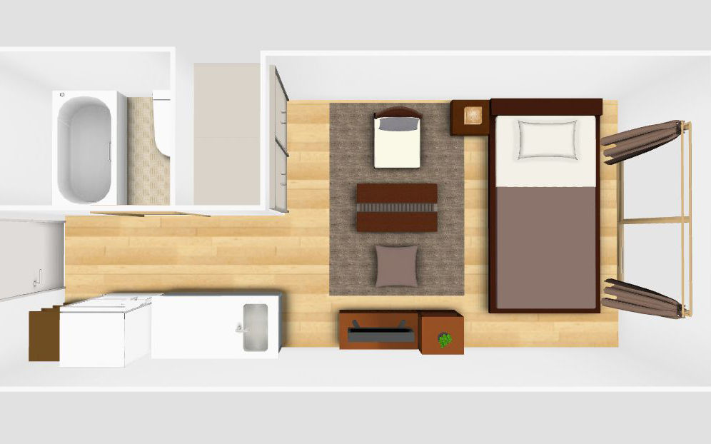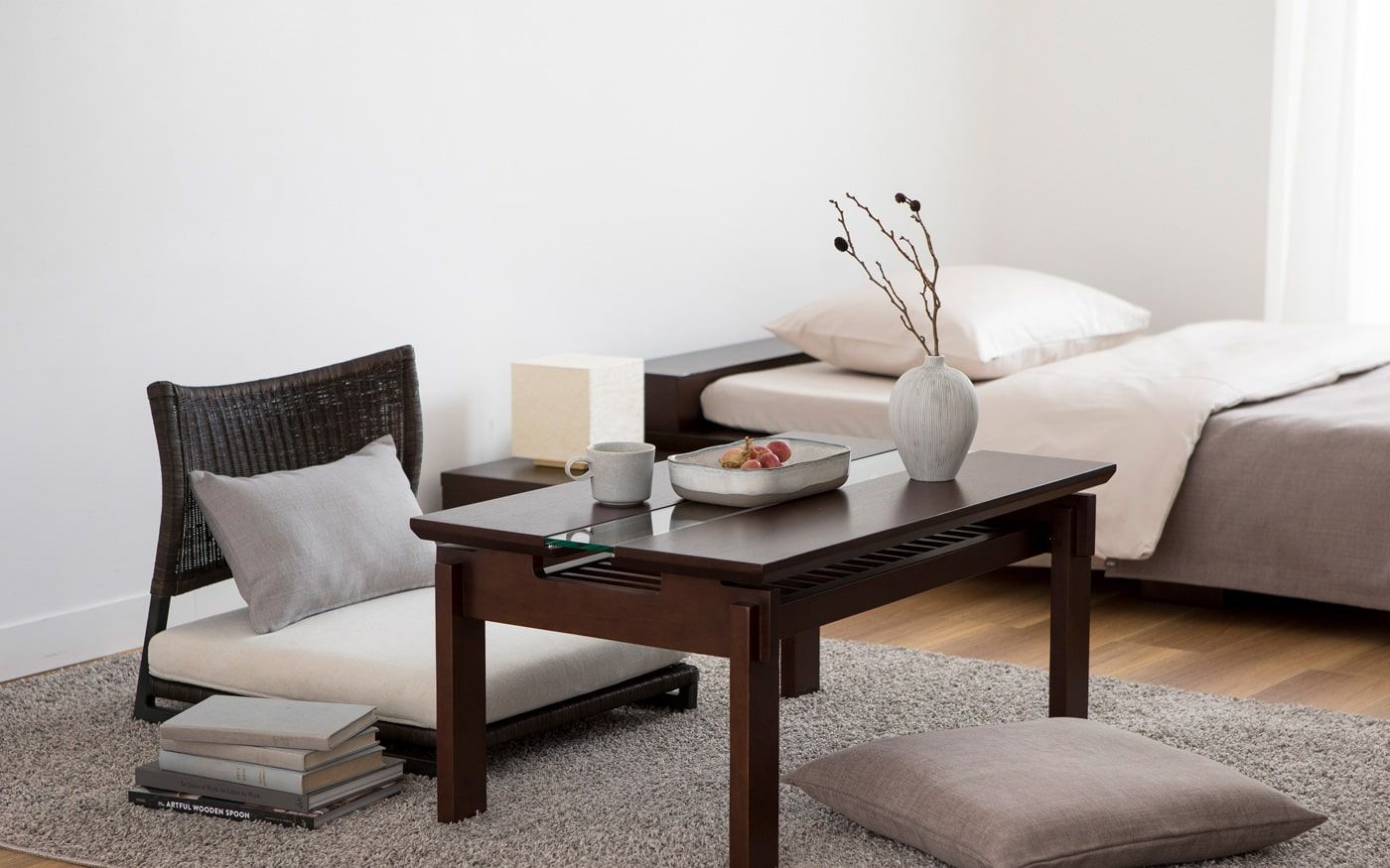 コンパクトな間取りで床座暮らしする場合、高さのある家具は出来るだけ置かず、低めのロースタイルで統一するのが基本の家具選びです。ワンルーム6畳の場合、ベッド、テーブル、テレビボードを最低限の家具として配置する傾向に有ります。それらを出来るだけ低い家具で揃えて、床で過ごせるためのラグを敷けば、床での生活がスタートできます。