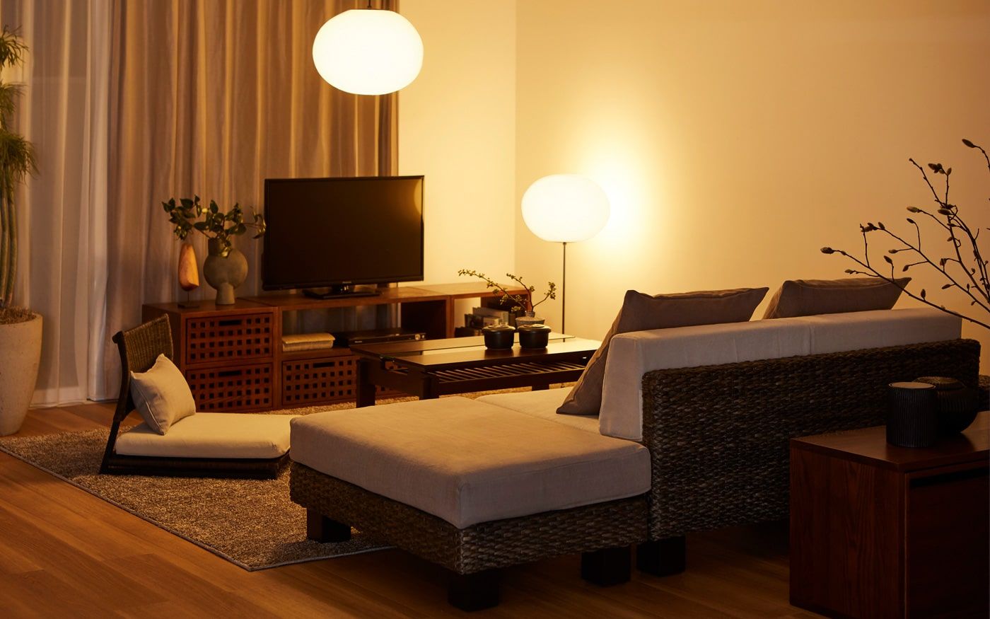 ベースが洋室の場合、部屋自体が現代的でモダンなため家具やカラーコーディネートだけでは和の要素がまだ少し足りません。そのため、照明やインテリア装飾で和のイメージをプラスしてみましょう。和紙の照明やアートパネルを加えてみたり、飾り棚やキャビネットで和っぽさをプラスするのもおすすめです。