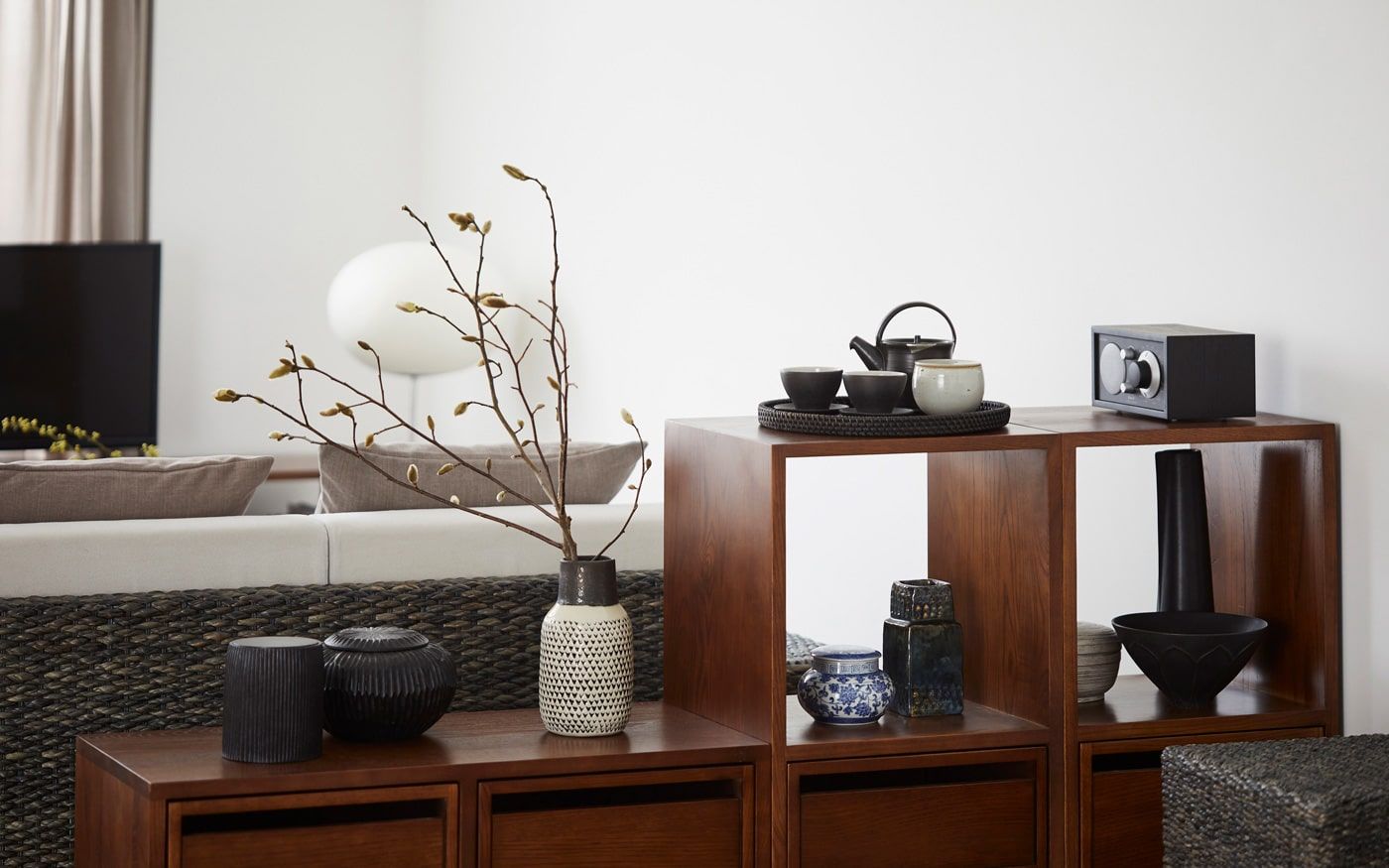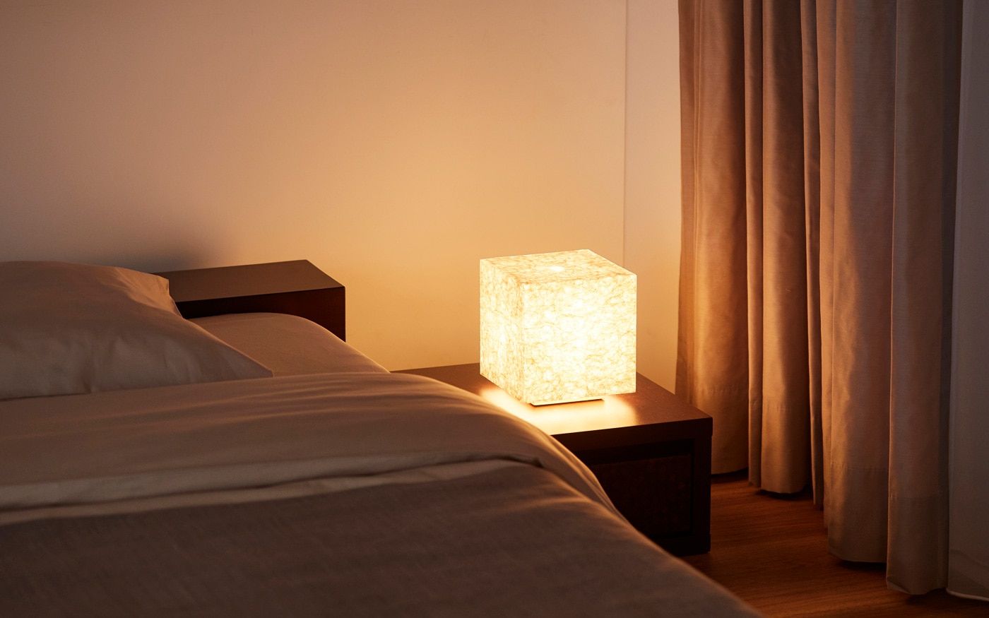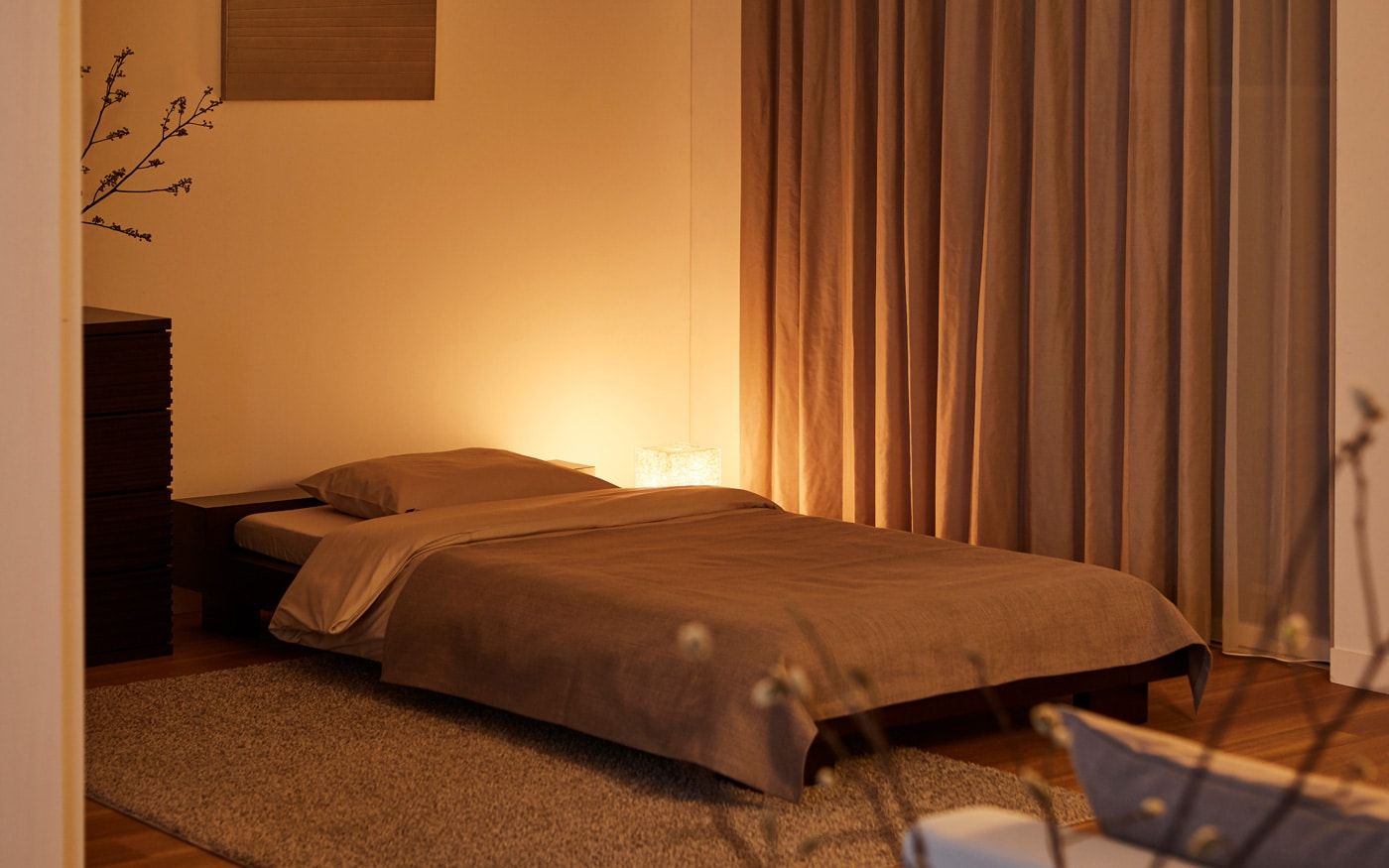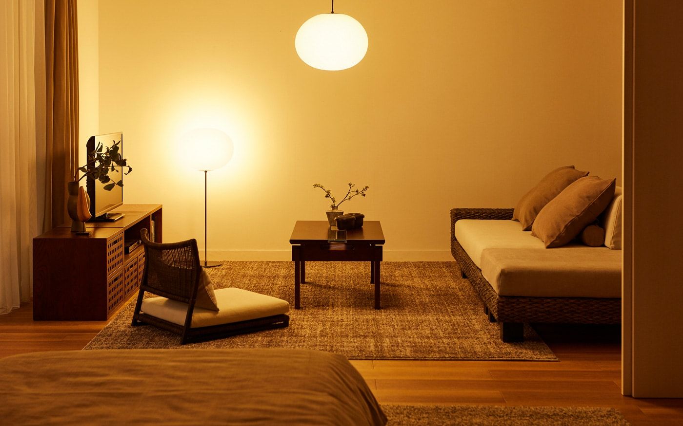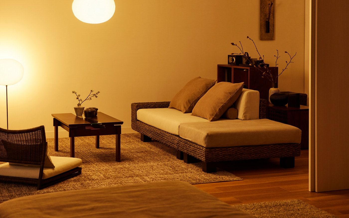 ベースが洋室の場合、部屋自体が現代的でモダンなため家具やカラーコーディネートだけでは和の要素がまだ少し足りません。そのため、照明やインテリア装飾で和のイメージをプラスしてみましょう。和紙の照明やアートパネルを加えてみたり、飾り棚やキャビネットで和っぽさをプラスするのもおすすめです。