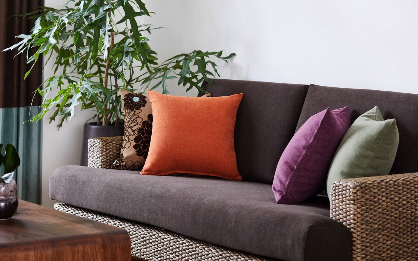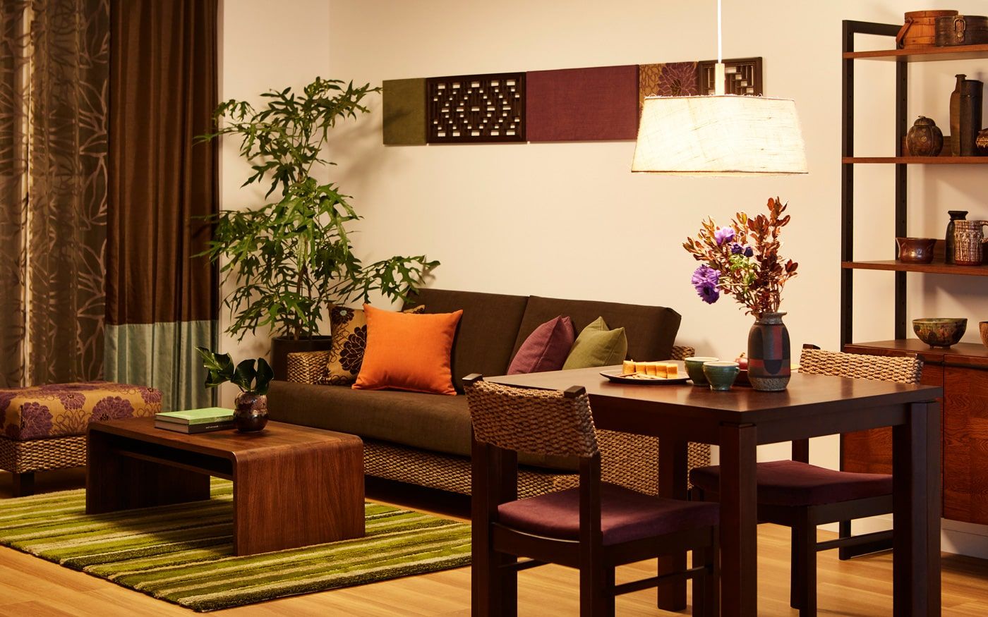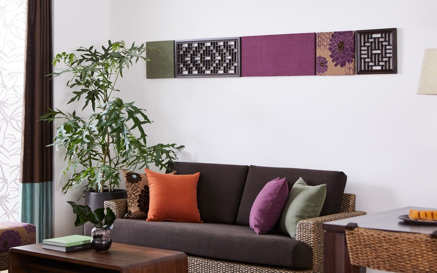 ホテルライクなイメージに変えやすいポイントがカラーコーディネートです。この事例ではバリの自然や花をテーマカラーに、ダークブラウン+グリーン・パープル・オレンジの3色をアクセントにして、アジアンテイストを取り入れたホテルライクな部屋に仕上げています。