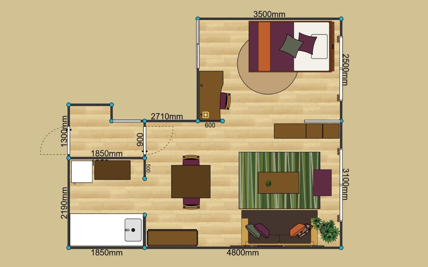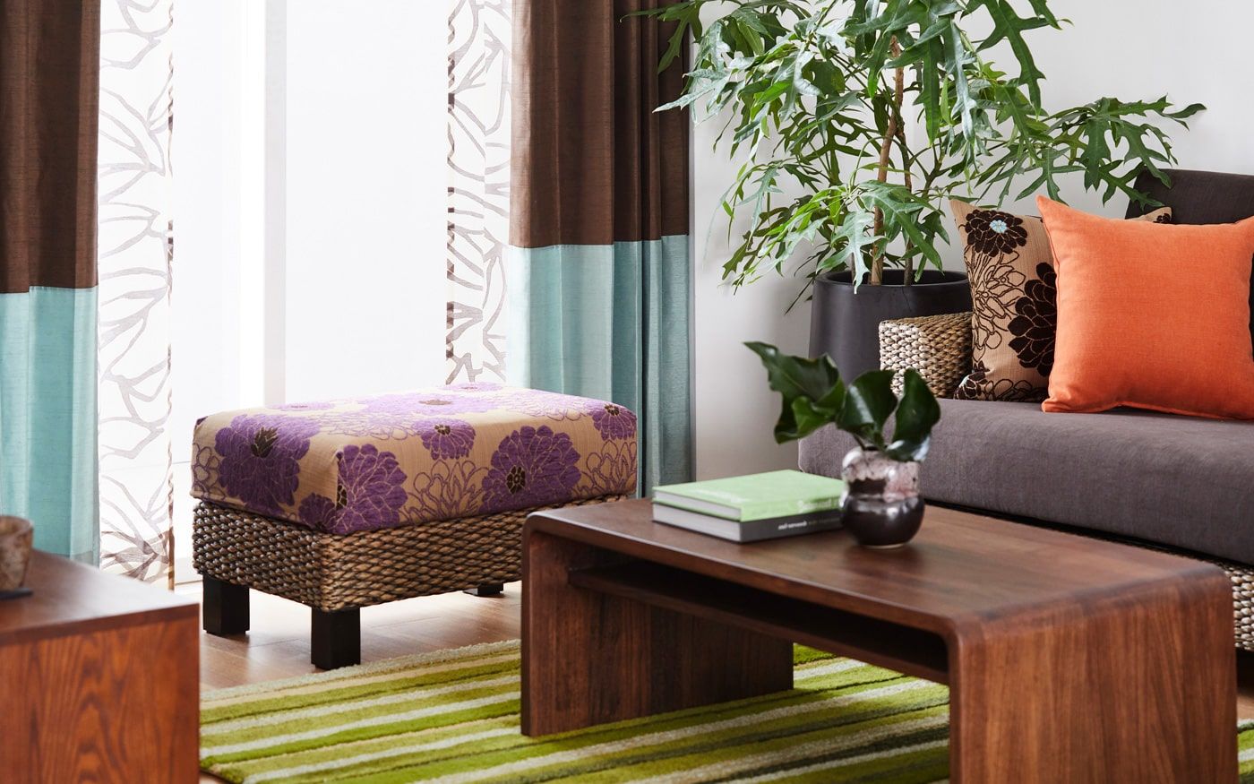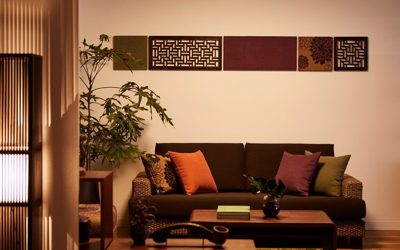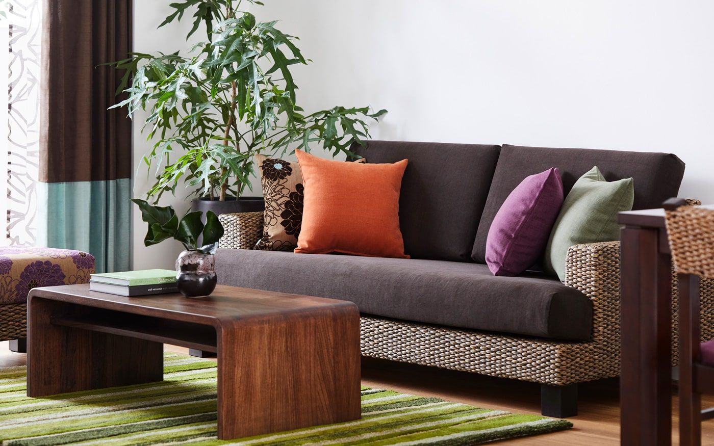ホテルライクなイメージに変えやすいポイントがカラーコーディネートです。この事例ではバリの自然や花をテーマカラーに、ダークブラウン+グリーン・パープル・オレンジの3色をアクセントにして、アジアンテイストを取り入れたホテルライクな部屋に仕上げています。
