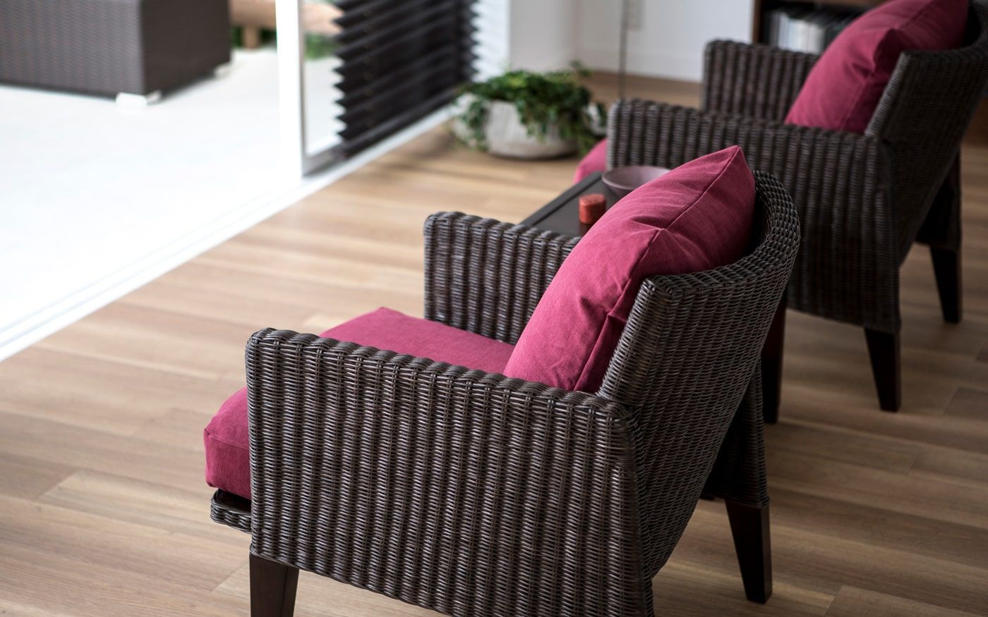 旅館の縁側のようにゆったり過ごせるラウンジチェアを置いて、チェアカバーにはCLプラムの落ち着きあるレッドに変えれば、縁側にも華やかさが生まれます。また、ユニット収納を飾り棚として配置し、その部分にも赤色の雑貨を飾ってみても良いでしょう。