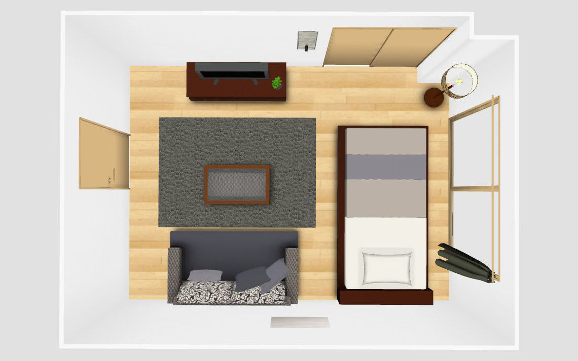 次は部屋全体を雲霞のようなイメージで包み込めるよう、グレーのラグやカーテン、ベッドスプレッドなどの広い面積にグレーをプラスしてみましょう。気持ちが静まり、落ち着いた印象が部屋に広がり始めます。