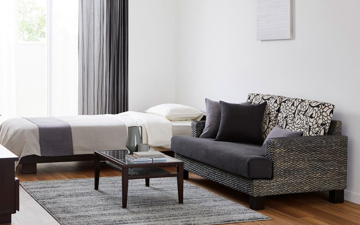 自然感のあるグレーのソファやファブリックがベースの空間に、ソファカバーやアートパネル、照明などを加えてみましょう。部屋にグレーの優しい濃淡や陰影が生まれ、自然の雲霞に覆われたような温もりと落ち着きのあるワンルームが完成します。