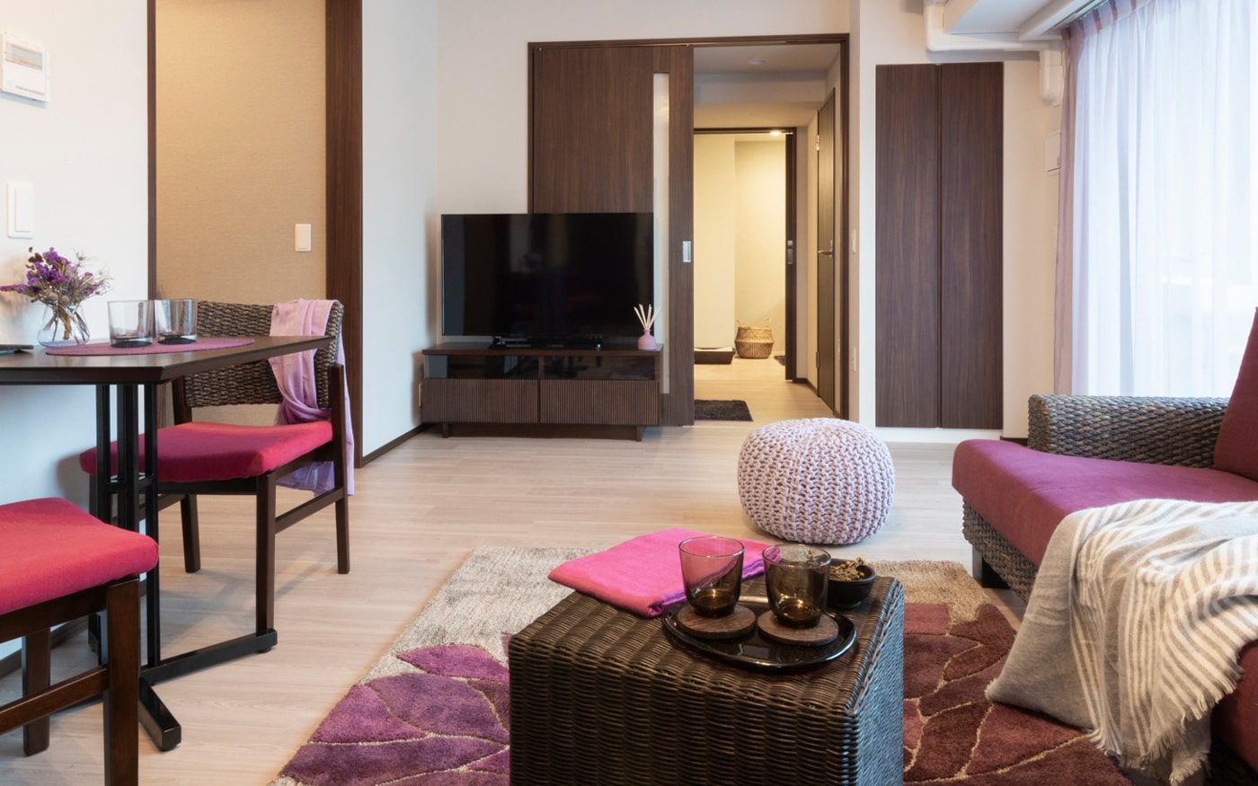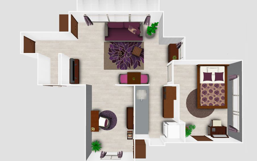 ダーク調の家具シリーズで統一した空間に、高級感漂うパープルカラー中心のカラーコーディネートを取り入れました。各部屋のファブリックに華やかなパープルやゴージャス感のある花柄、ポイントを彩るインテリア小物を添えて、どの部屋で過ごしてもラグジュアリーな雰囲気の空間で贅沢に過ごせるようにしています。