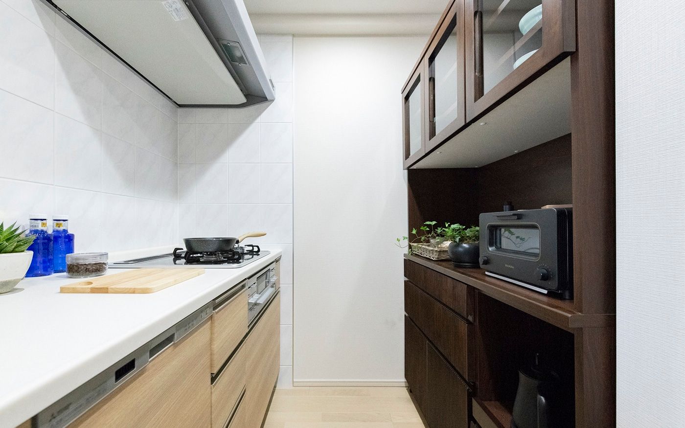 テーマの一つにある「開放感」を実現するため家具をロースタイルで統一することに加えて、レイアウトで広い生活動線や抜け感を作ることが重要です。ソファ脇の和室をシームレスに繋げて、和室とリビングで家族の会話が楽しめるレイアウトを採用しました。