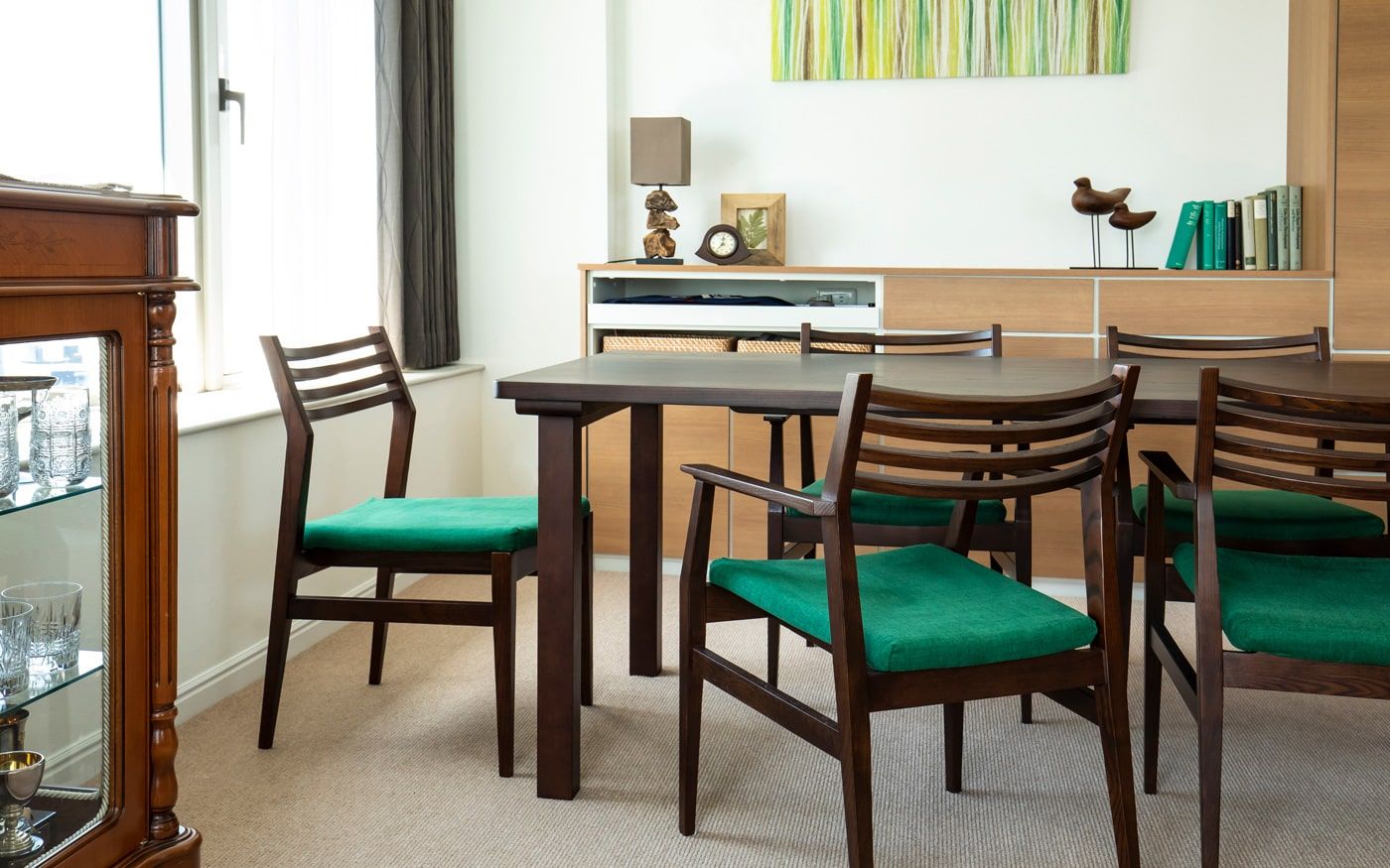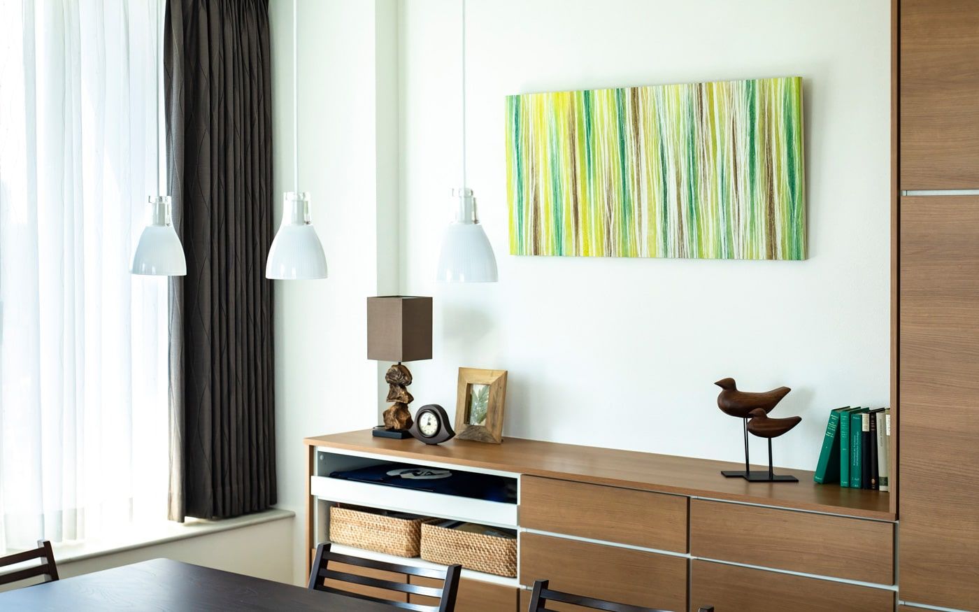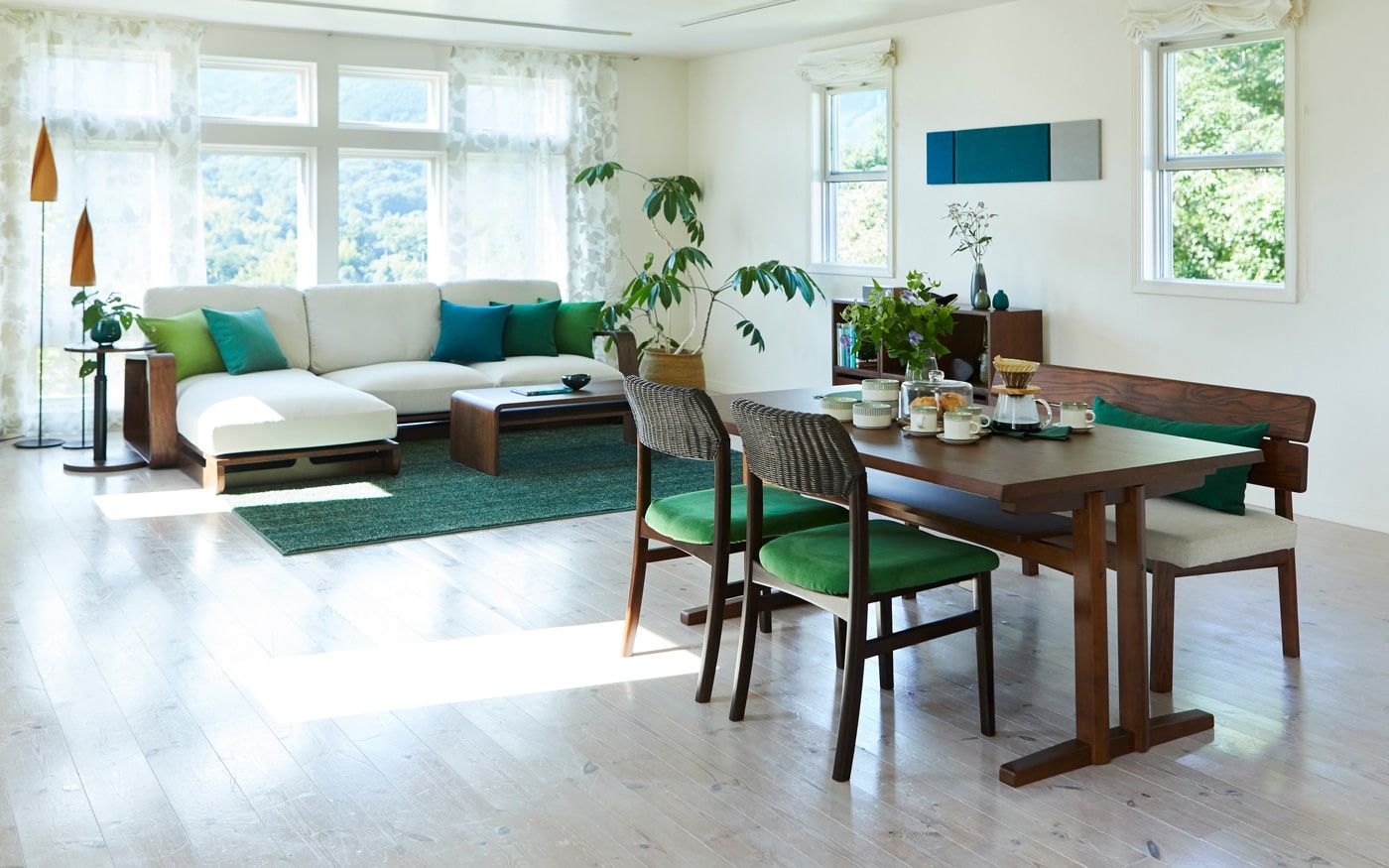 安らぎ感じるグリーンのファブリックと森や木々をイメージした無垢材家具、そこに天空の森をイメージさせる装飾を更に加えています。また、ダイニングテーブル奥の壁面には森の幻想的なイメージを作り上げた和紙のアートパネルを飾り、食卓周りをグリーンが持つ安らぎで包み込んでいます。