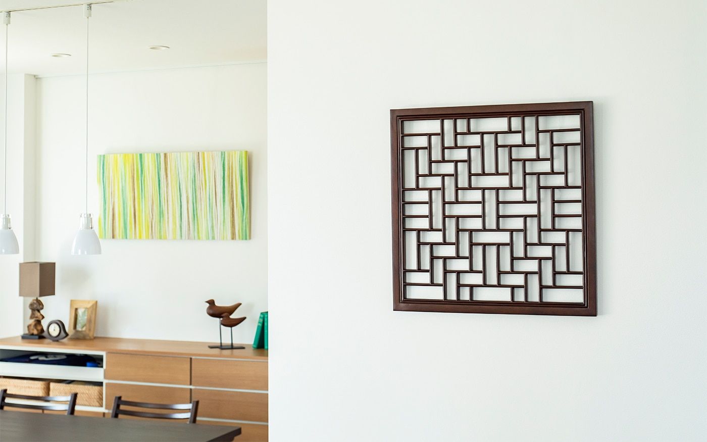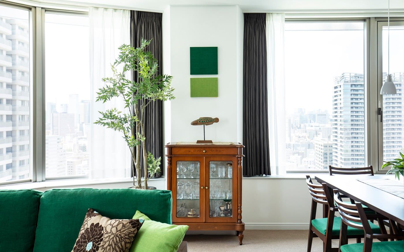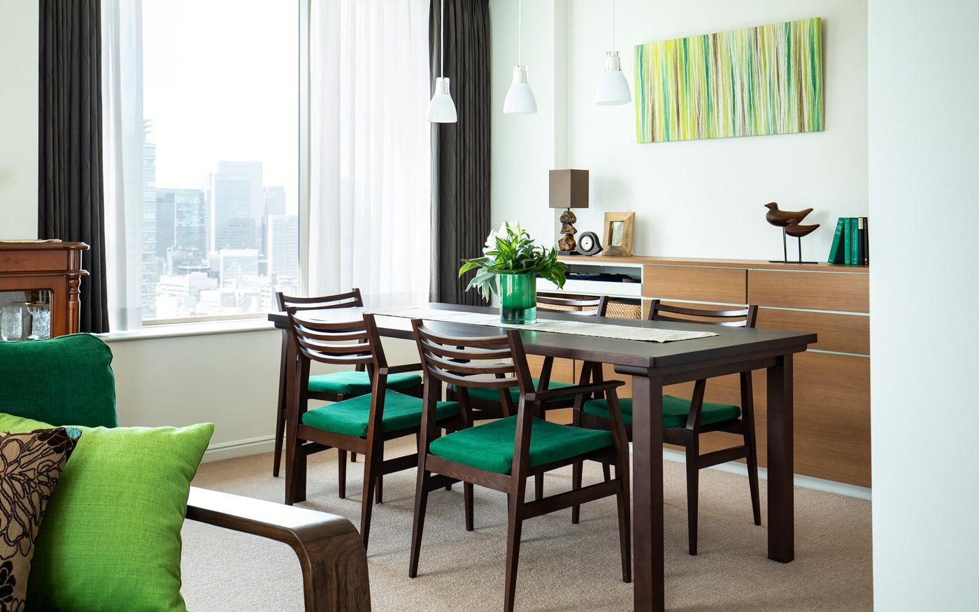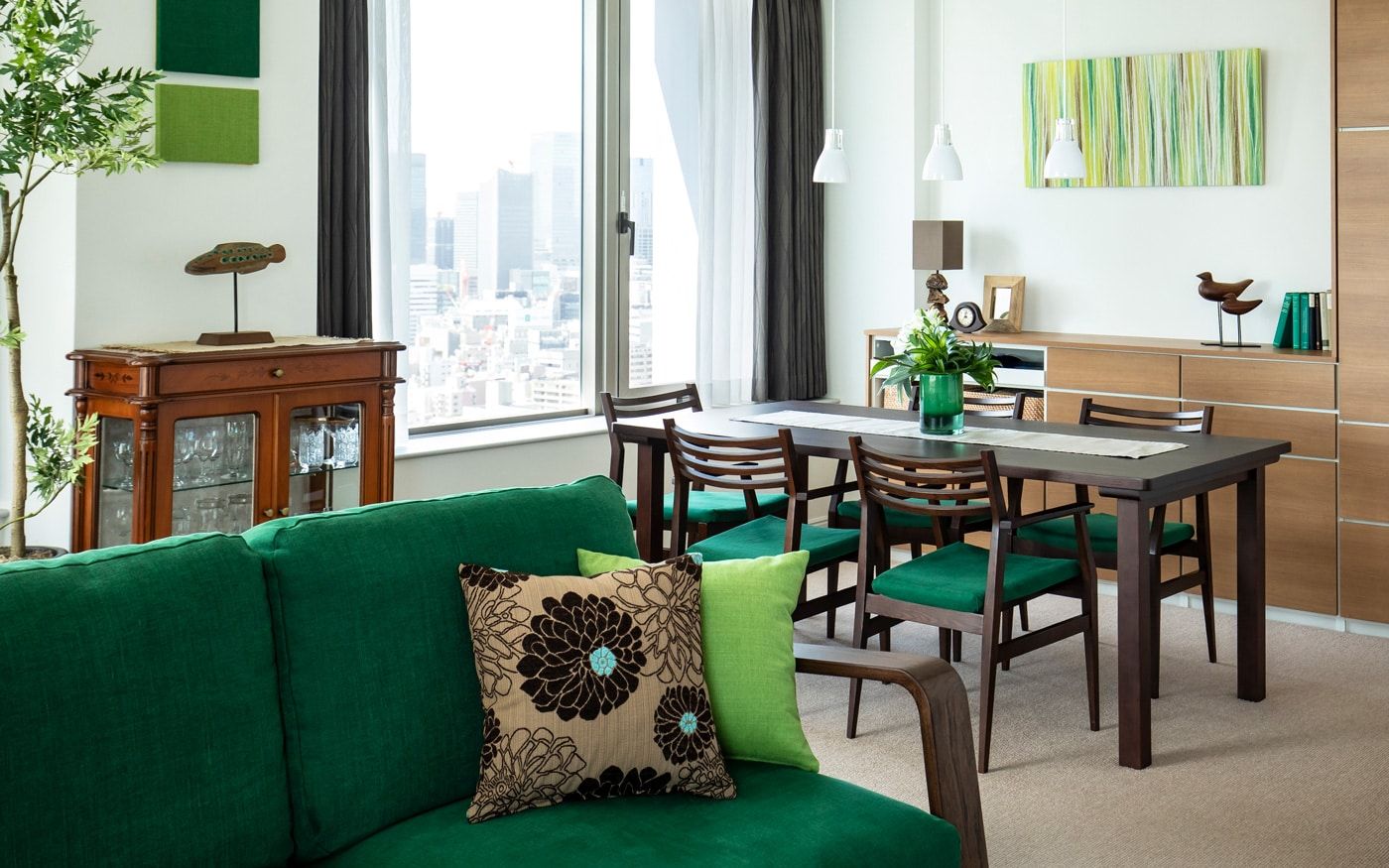 安らぎ感じるグリーンのファブリックと森や木々をイメージした無垢材家具、そこに天空の森をイメージさせる装飾を更に加えています。また、ダイニングテーブル奥の壁面には森の幻想的なイメージを作り上げた和紙のアートパネルを飾り、食卓周りをグリーンが持つ安らぎで包み込んでいます。