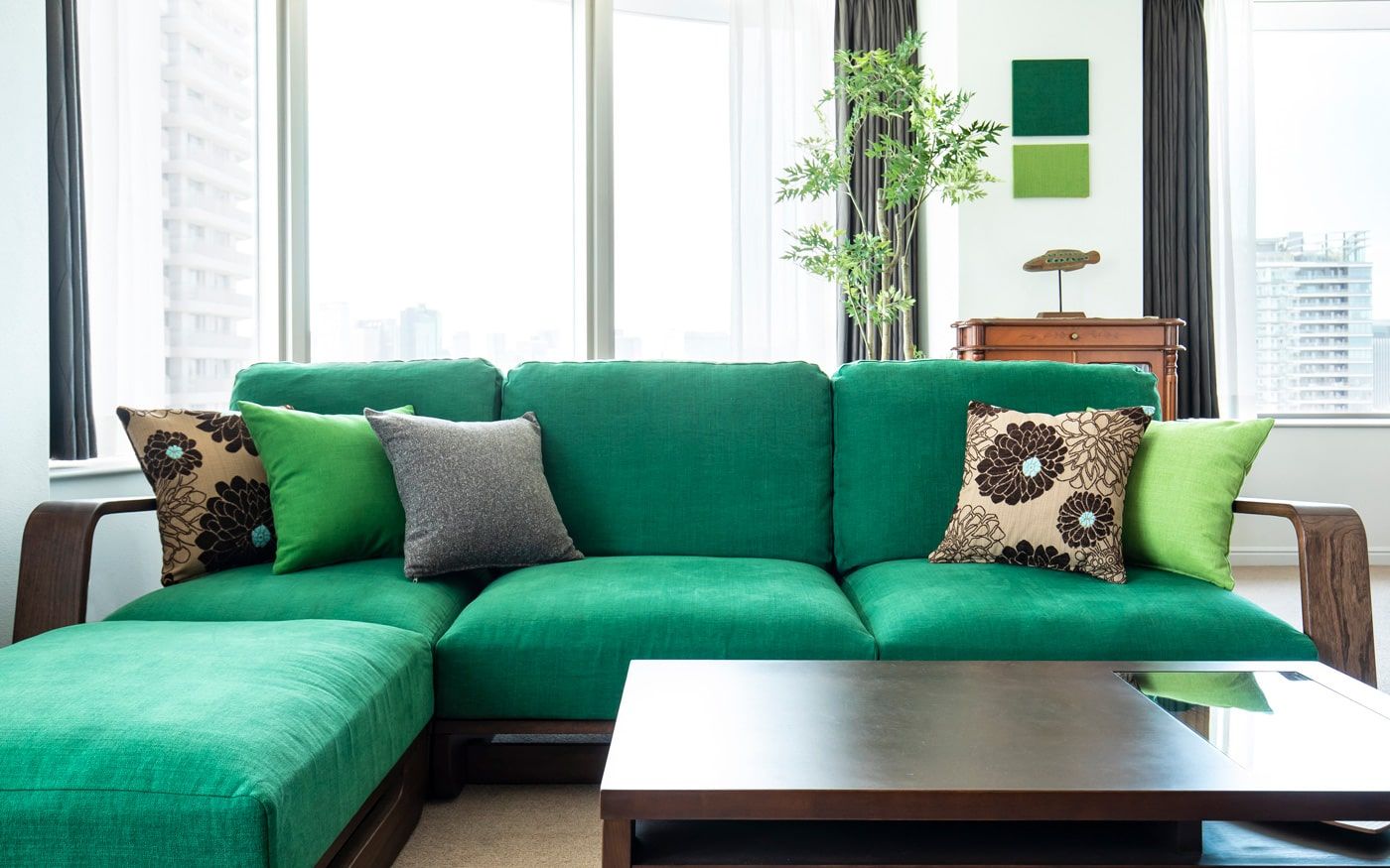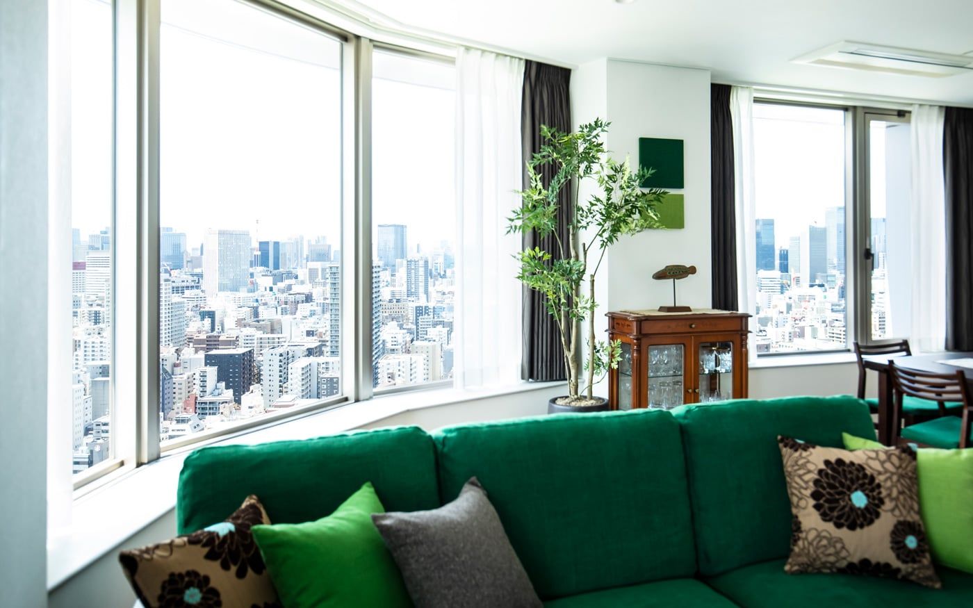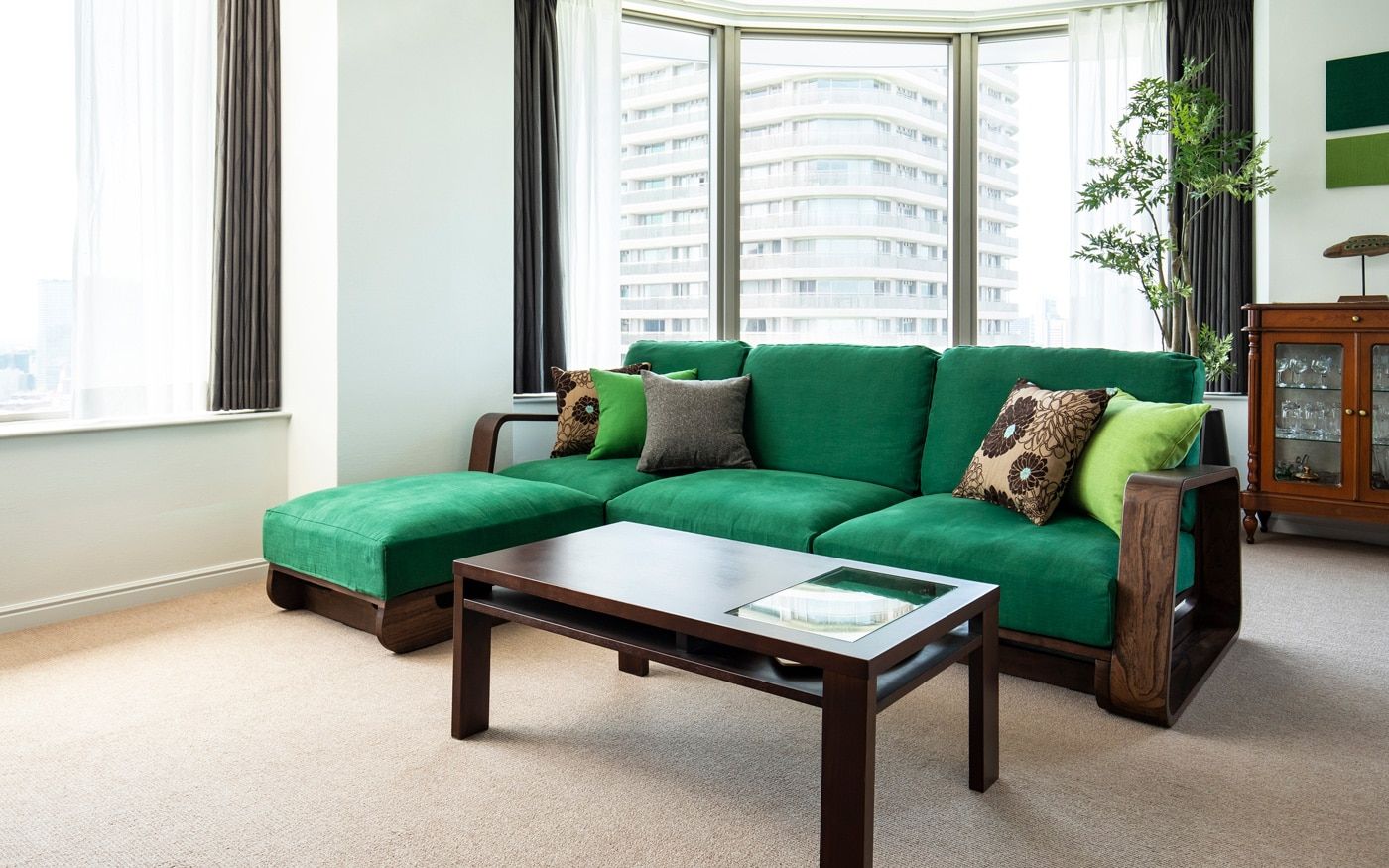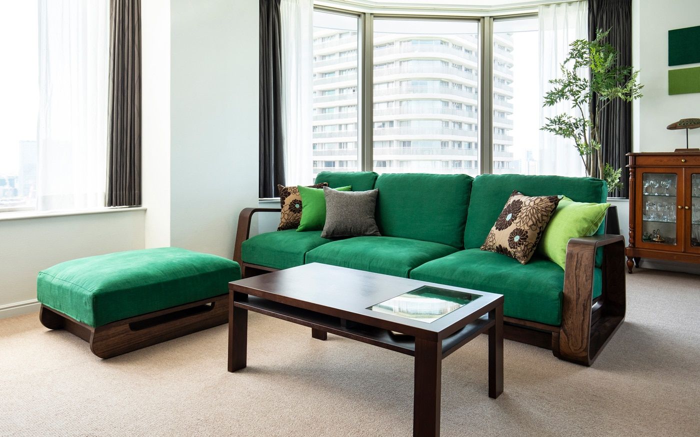 リゾート地の中でも森の中に佇むロケーションを部屋に取り入れるには、グリーン中心のカラーコーディネートが欠かせません。特に都会の高層マンションでは緑が目に入る光景は珍しいため、重要なポイントに。部屋の主役となるソファ・チェアのカバーに森のような深い色を用いて、クッションカバーには少し淡いグリーンや森の陰影をイメージしたブラウンを添えれば、安らぎ感じる森リゾートの空間を楽しめます。