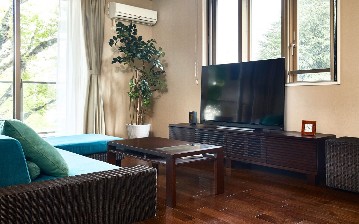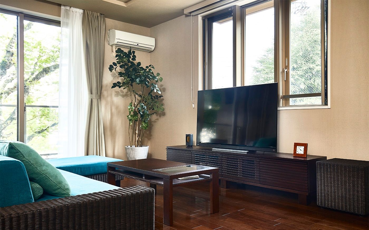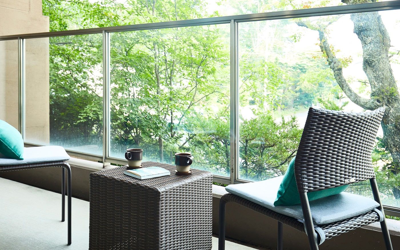 別荘の場合、テラスやバルコニーが有ることが多く、こちらの別荘でも木々が間近に見えるバルコニーがリビングと隣接しています。もし、外でも気軽に使える屋外用チェアやスツールを置けば、軽井沢の美味しい空気を吸いながら心からリラックスできる別荘ライフを送ることができるでしょう。