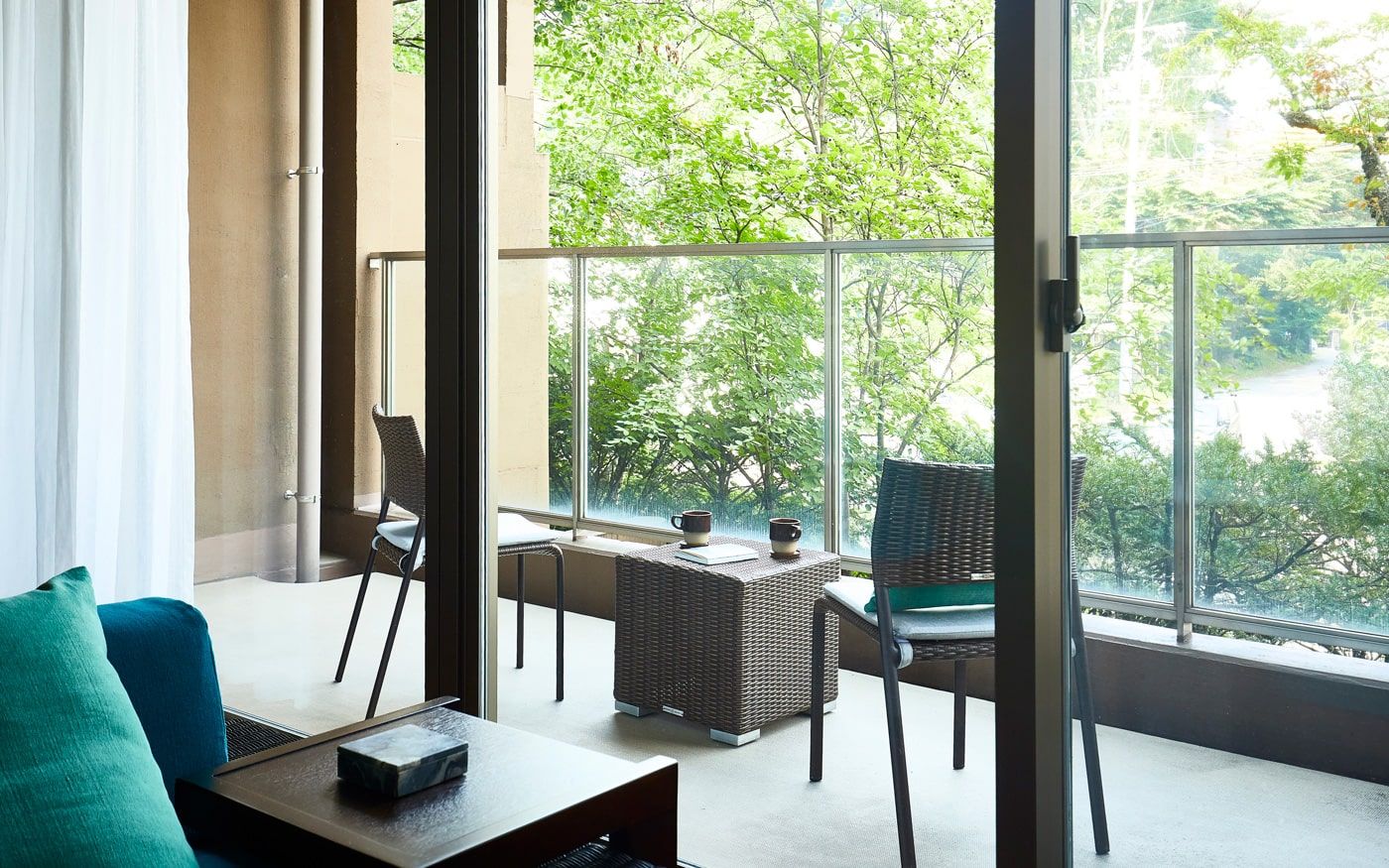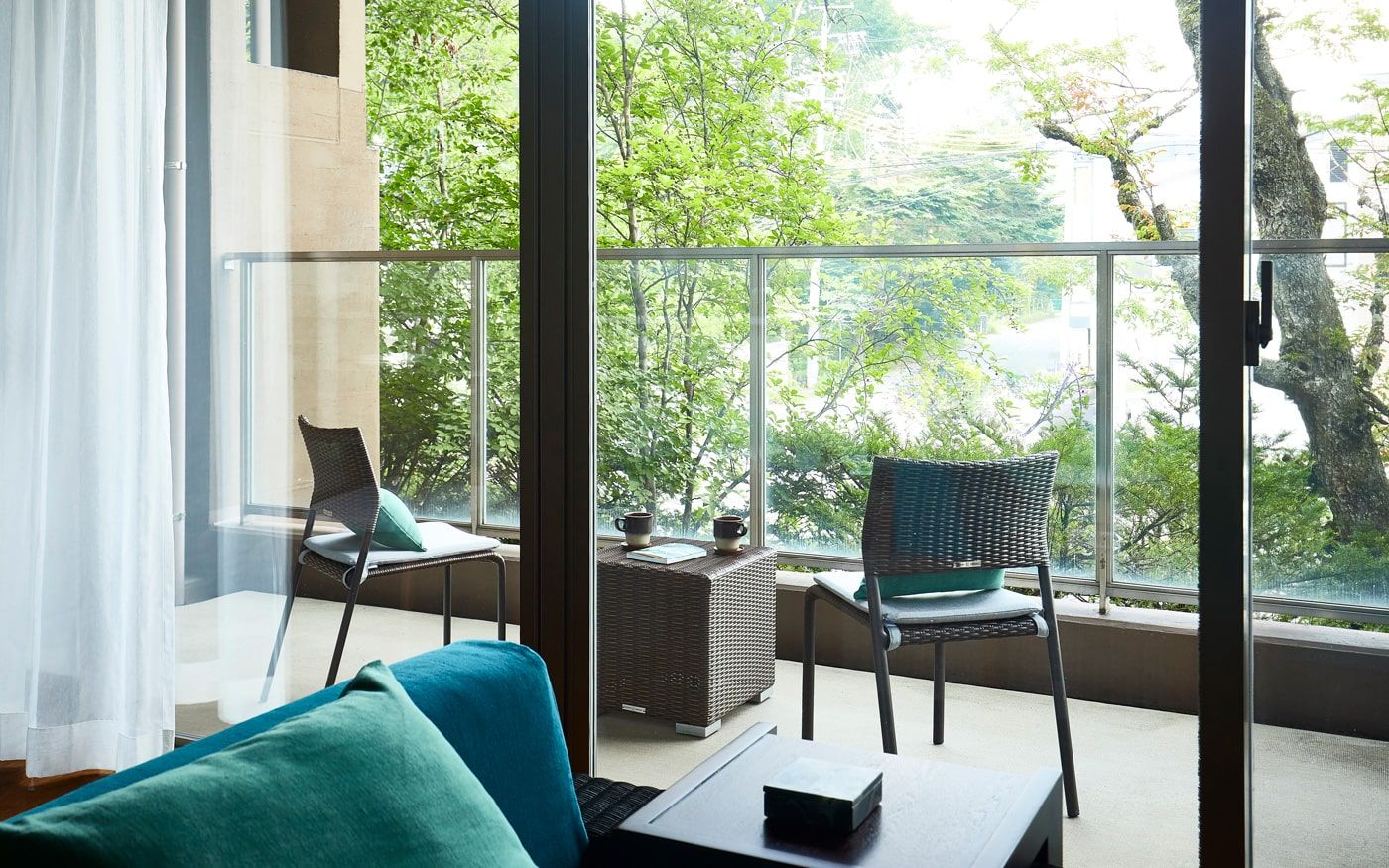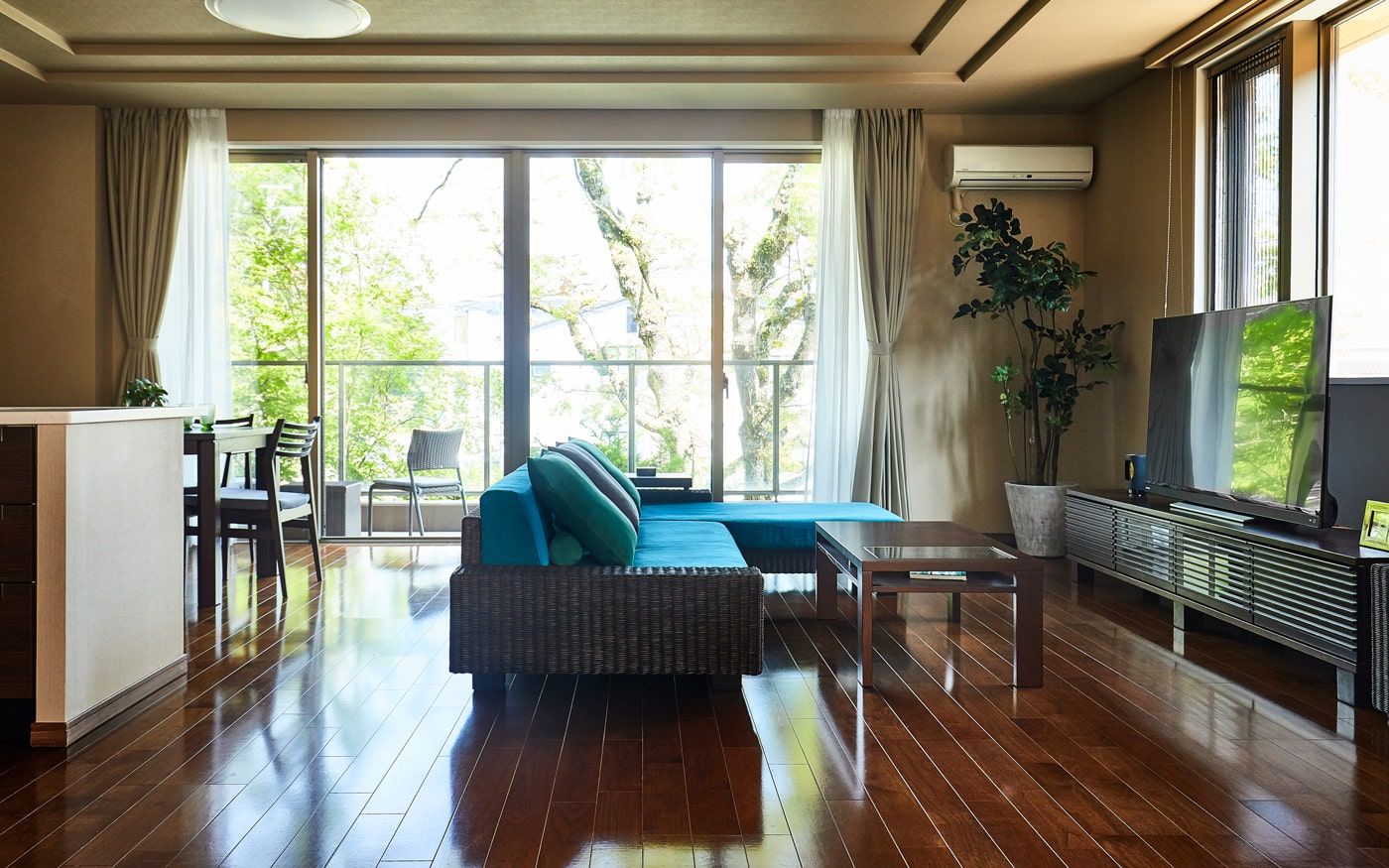 別荘の場合、テラスやバルコニーが有ることが多く、こちらの別荘でも木々が間近に見えるバルコニーがリビングと隣接しています。もし、外でも気軽に使える屋外用チェアやスツールを置けば、軽井沢の美味しい空気を吸いながら心からリラックスできる別荘ライフを送ることができるでしょう。