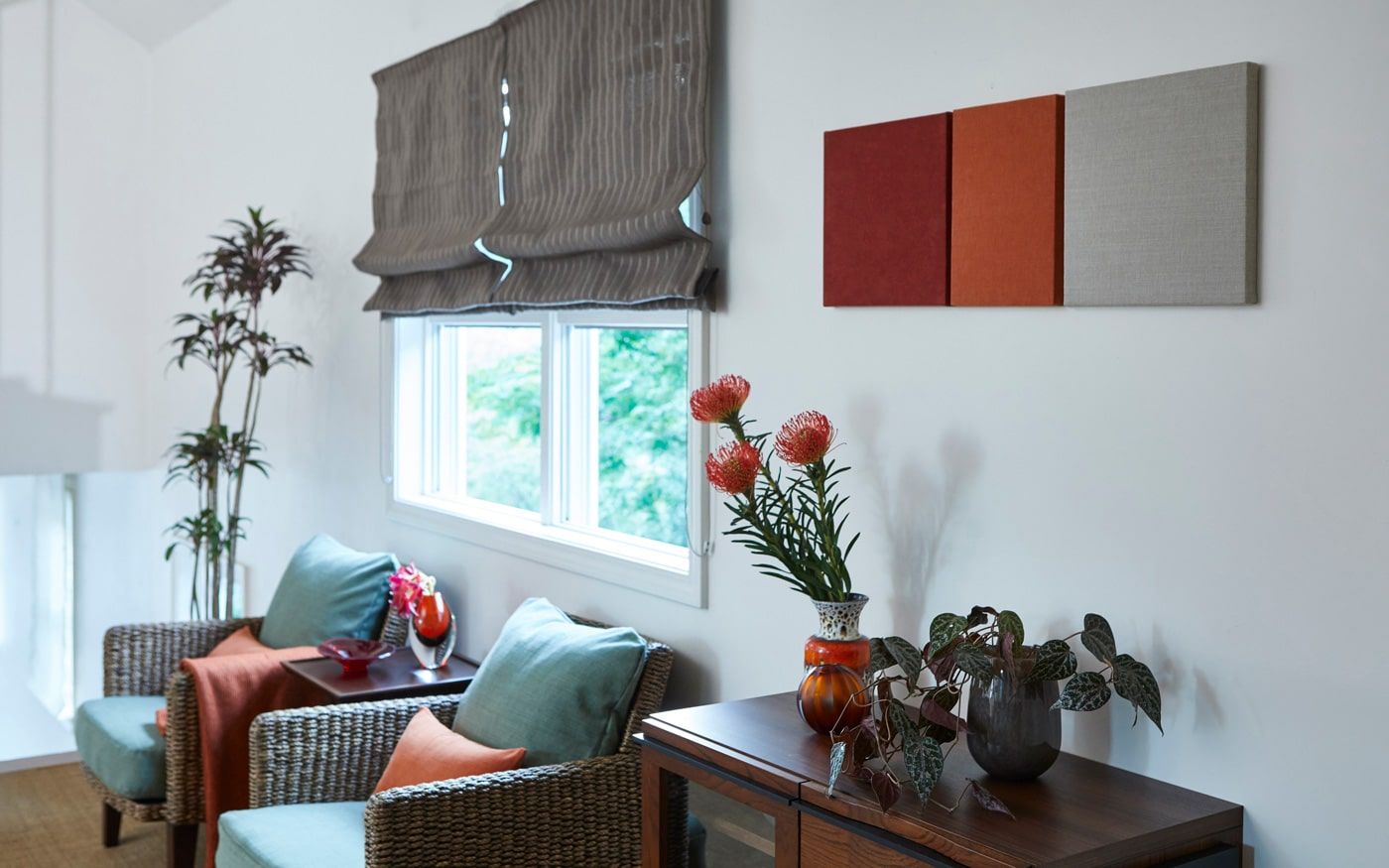 軽井沢に秋風が吹き始めるころには、少しづつ葉がオレンジなどの暖色系に様変わりしていきますが、そんな情景を別荘の寝室コーディネートに取り入れてみました。落ち着いたグリーンのCLハーブで彩ったラウンジチェアに、紅葉を思わせるオレンジのクッションカバーやファブリックパネルを添えれば、紅葉の色付く様を楽しむこともできるでしょう。
