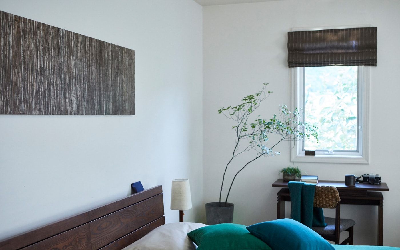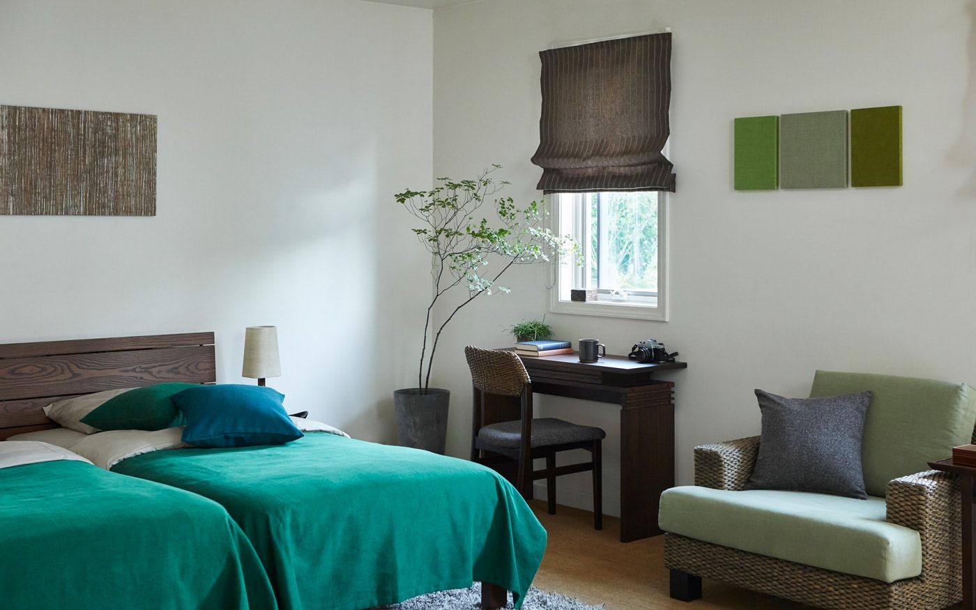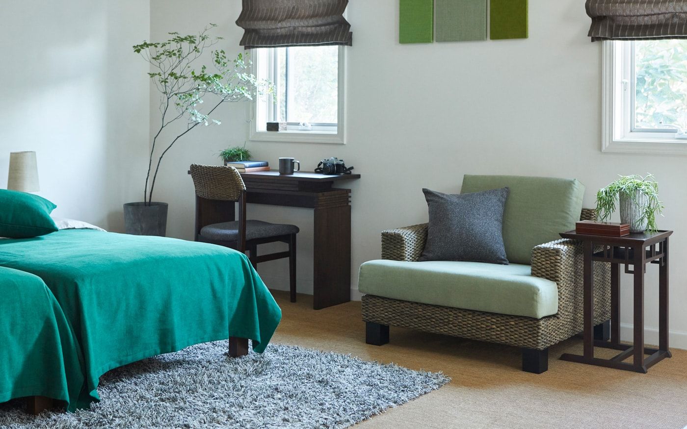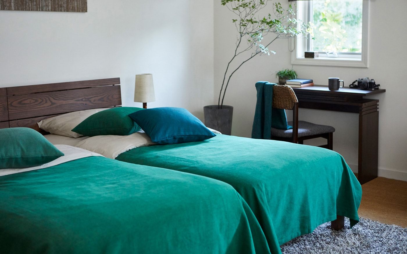 木の温もりが漂うムクベッドを主役に、森からインスピレーションを得たCLシンのベッドスプレッドや、木々の情景を取り込んだアートパネルでカラーコーディネートすれば、就寝の際も癒しの空気に包まれながら眠りにつけます。