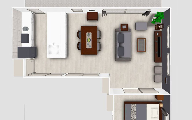 こだわりの詰まったモノトーンのお部屋を活かすために、グレーカラーの家具やファブリックを使用して、空間にまとまりを表現。寝室にもモノトーンカラーを取り入れるため、ベッドスプレッドを用いています。ベッドスプレッドにはCLスモークを使用して、リビングダイニングとは少し違うモノトーンで変化を付けました。
