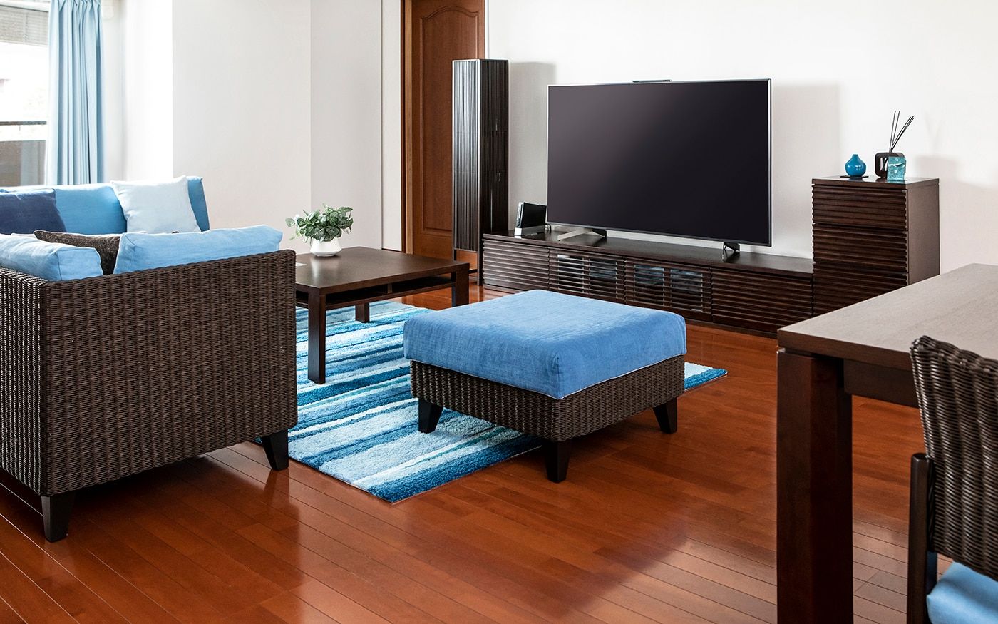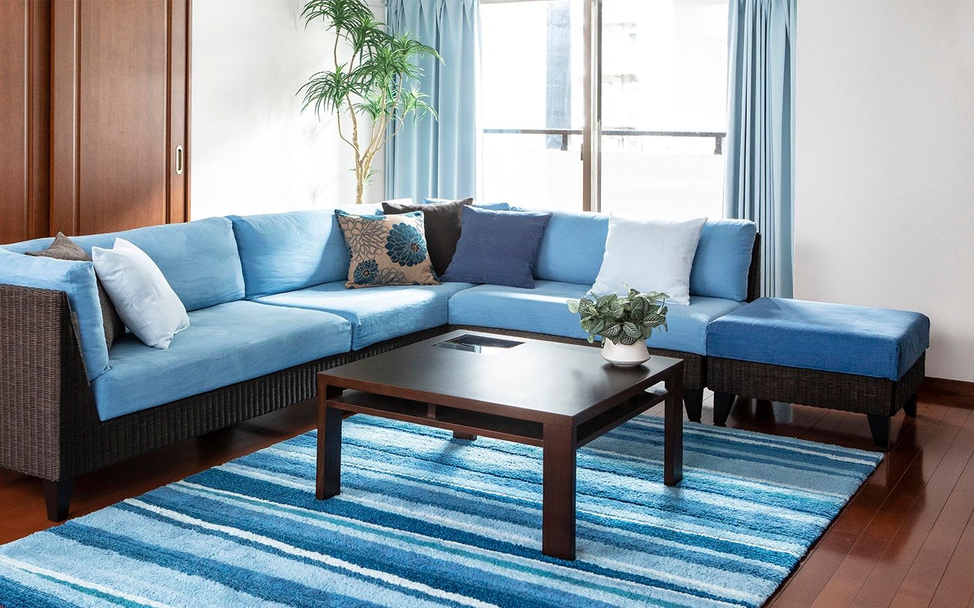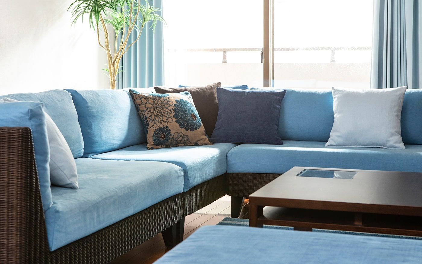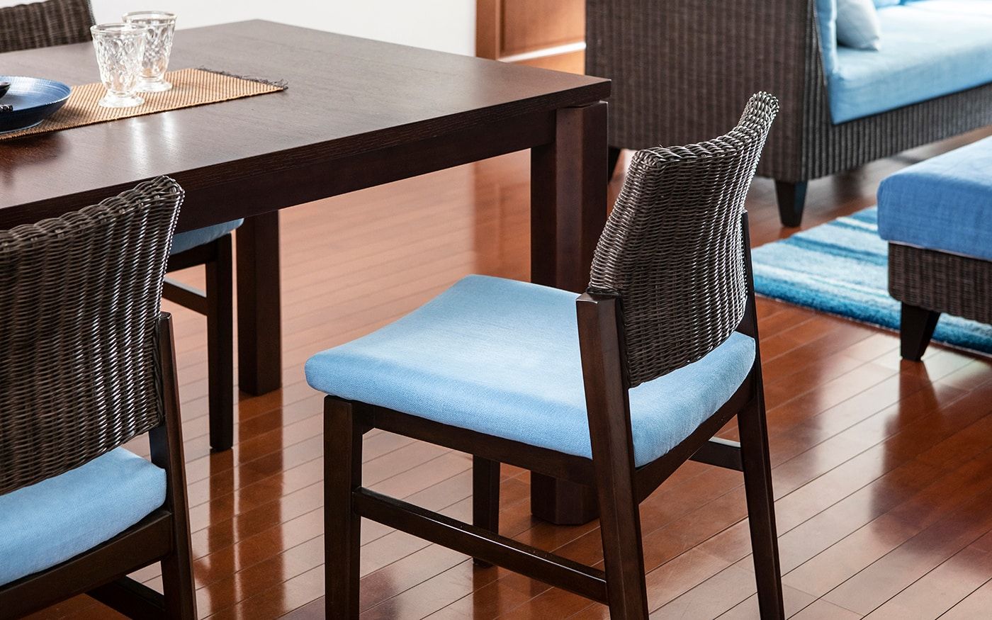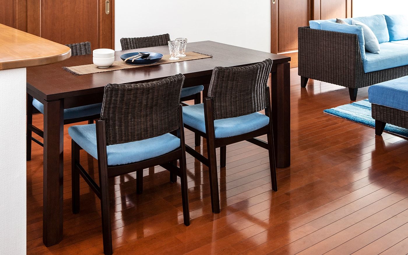 ブラウンとも相性の良いブルーでコーディネートされたお部屋は、落ち着きの中にも爽やかな印象を与えてくれます。ソファカバーとチェアカバーはCLウォーターブルーで、統一。明るめのブルーを使用して、ブラウンとのコントラストを演出しました。