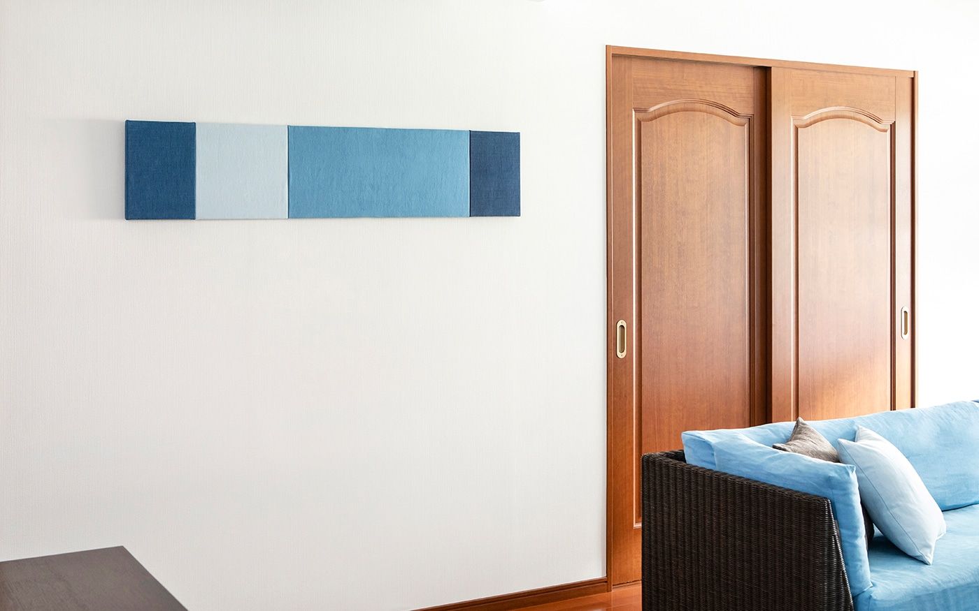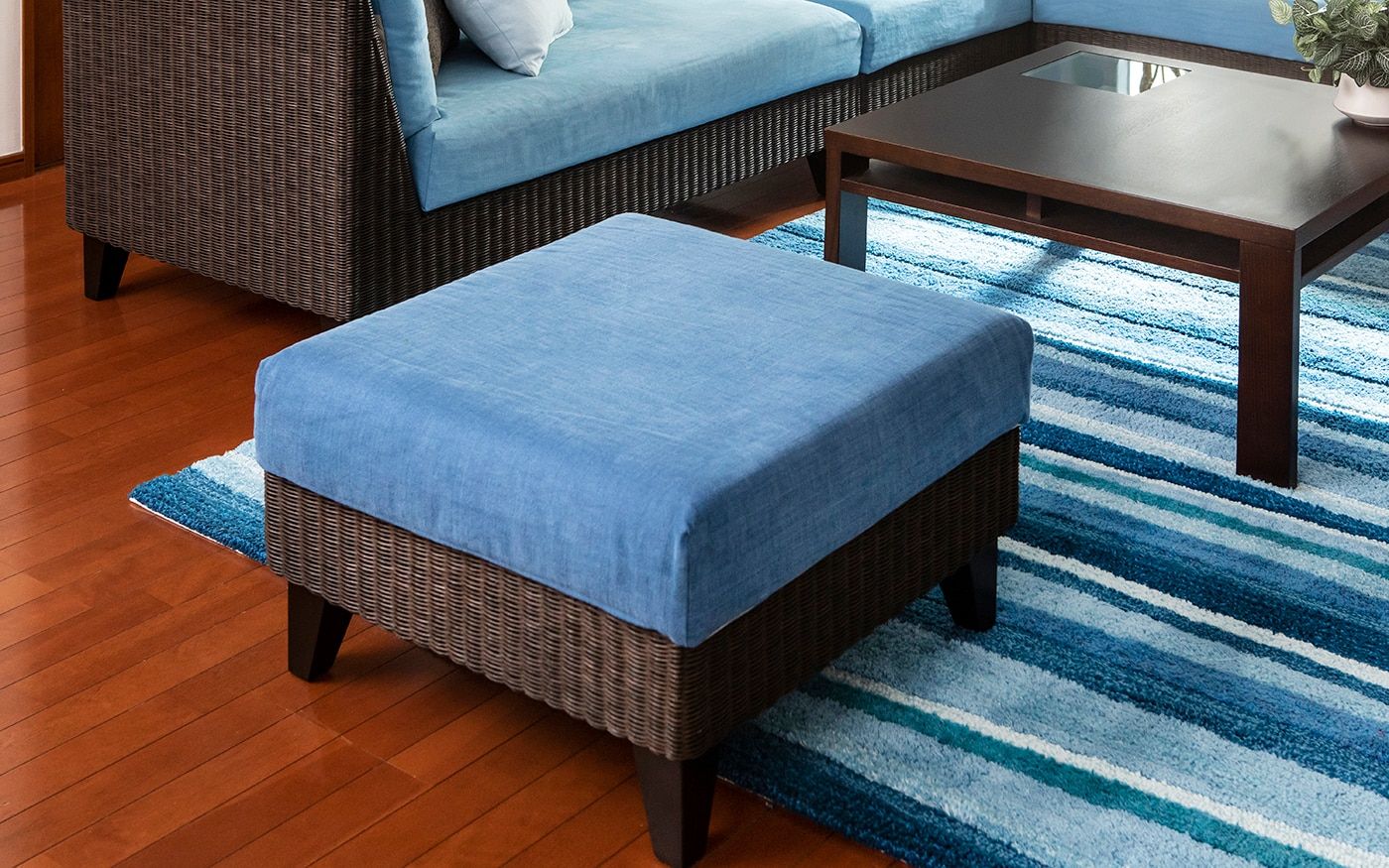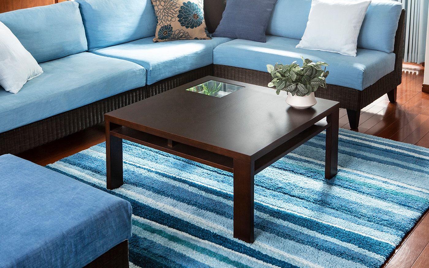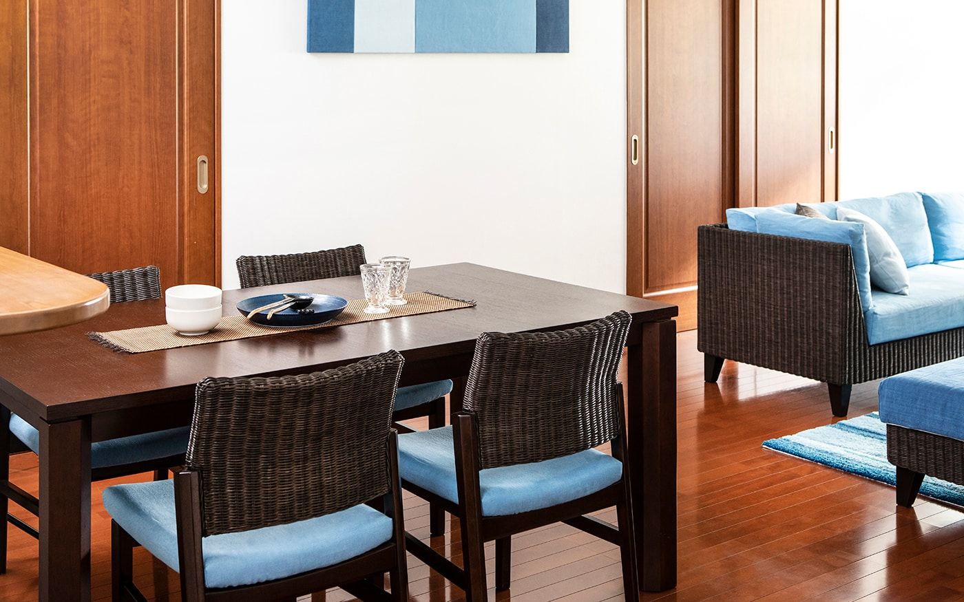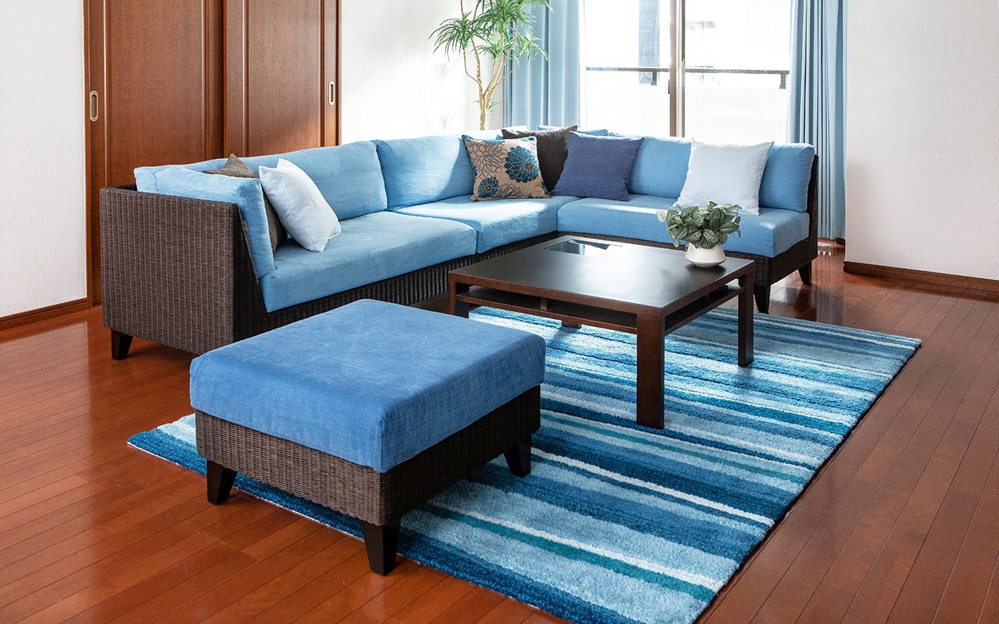 ブラウンとも相性の良いブルーでコーディネートされたお部屋は、落ち着きの中にも爽やかな印象を与えてくれます。ソファカバーとチェアカバーはCLウォーターブルーで、統一。明るめのブルーを使用して、ブラウンとのコントラストを演出しました。
