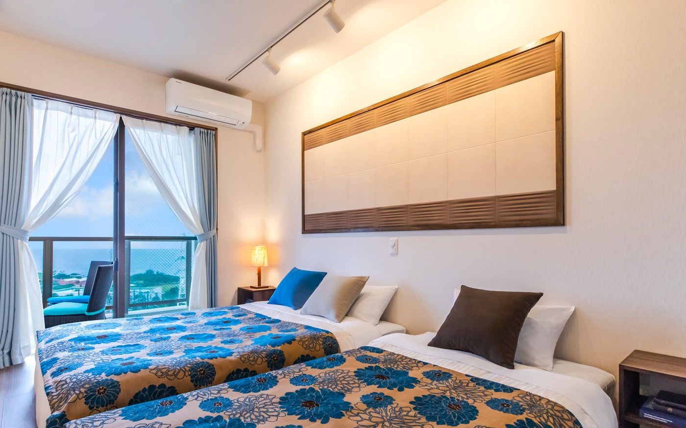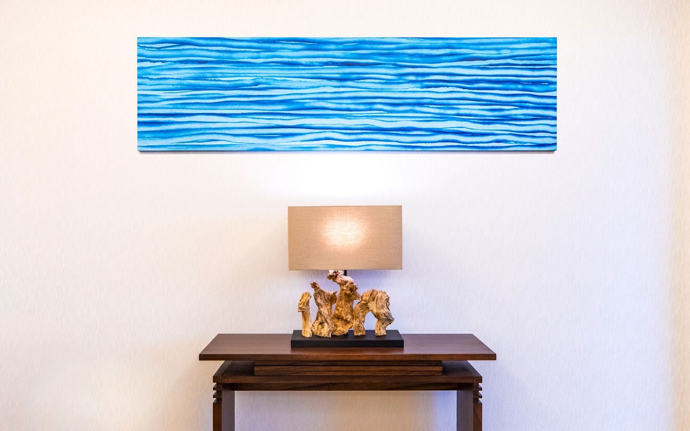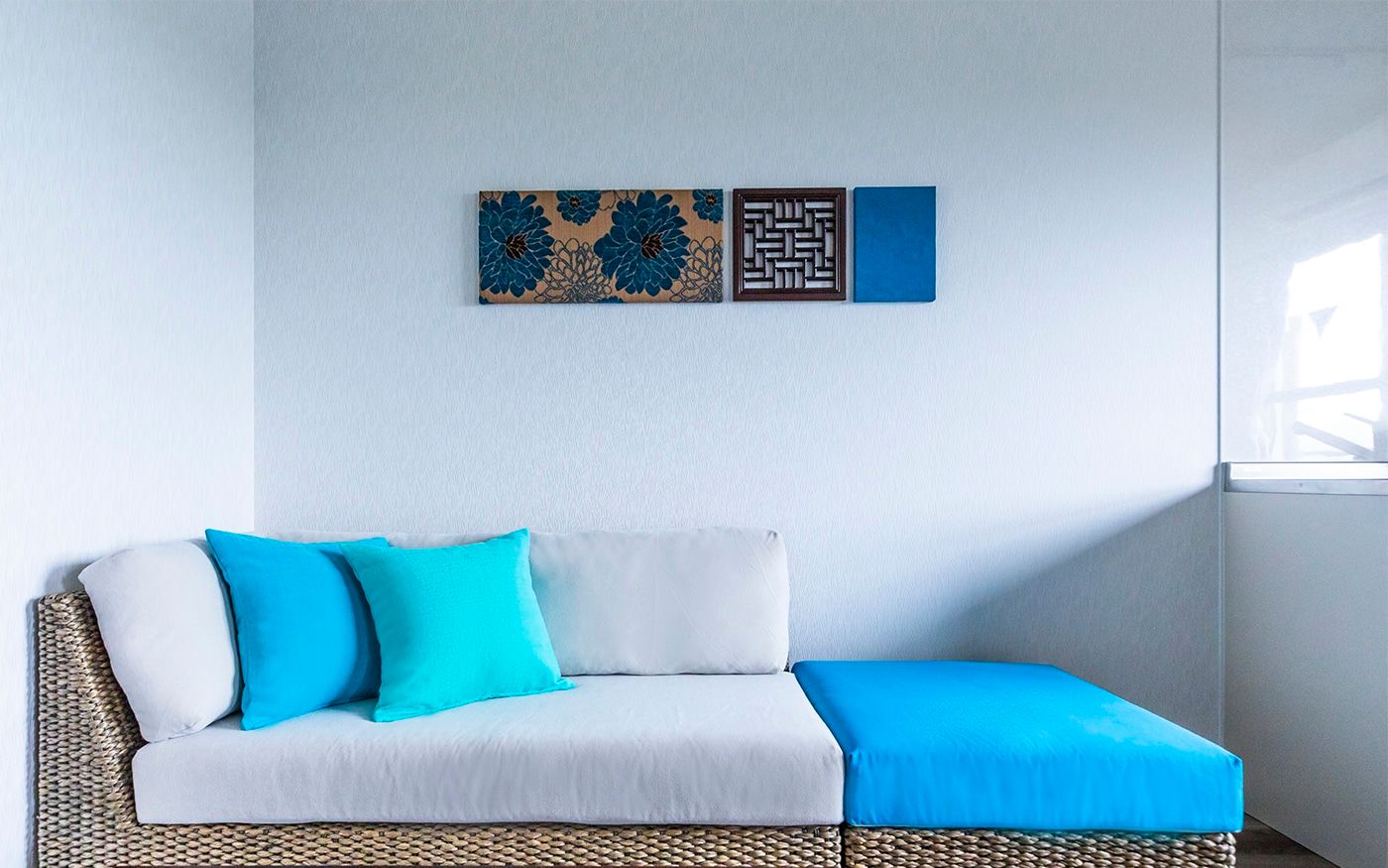 更に沖縄らしい部屋づくりを目指すのであれば、沖縄の空や海をイメージしたブルーの壁面装飾をプラスしてみましょう。どこまで続く青い海と空を彷彿させる色とりどりのファブリックパネルや、色鮮やかな青が際立つ縦長の花器などもおすすめです。白い壁面が多いほど、これらのブルーのアクセントが部屋に映えて沖縄リゾート風の部屋づくりを手助けしてくれるでしょう。