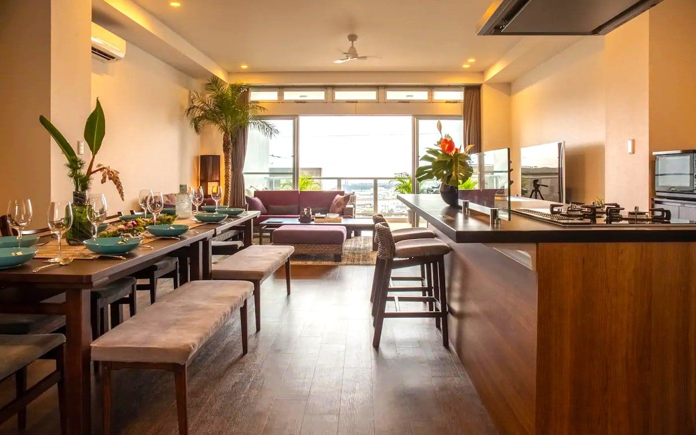 沖縄などの海に接したリゾートホテルは洋室中心ですが、こちらの民泊では日本のリゾートらしく和室を取り入れて座椅子を中心にコーディネートされました。日本人に馴染みが有り、海外の方も日本の気分を存分に味わえる床座の空間を設けたことで、沖縄らしい民泊ライフを送ることができます。