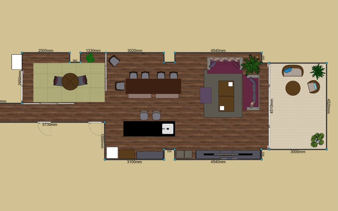 こちらの民泊では10名以上のゲストが来られることを想定したレイアウトを組まれています。そのため、ソファ2台を贅沢にL字に配置したり、4人掛けダイニングテーブルを二つ並べて幅3m弱の大きいテーブルとして組まれました。また、椅子を多く並べると圧迫感が出るため、片側に背無しベンチを2台置いて、開放感を意識されています。実際の自宅でも広さのあるLDに適用できるレイアウトパターンです。