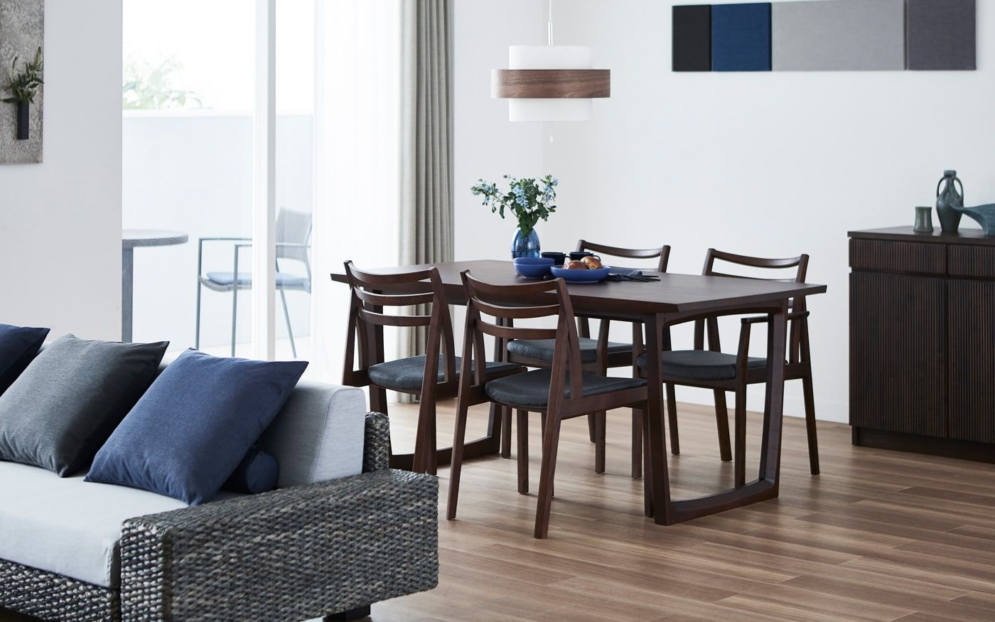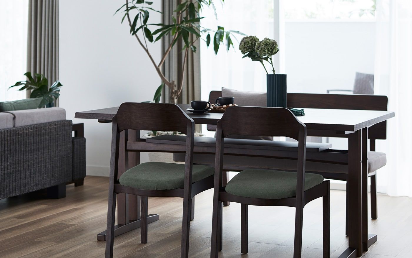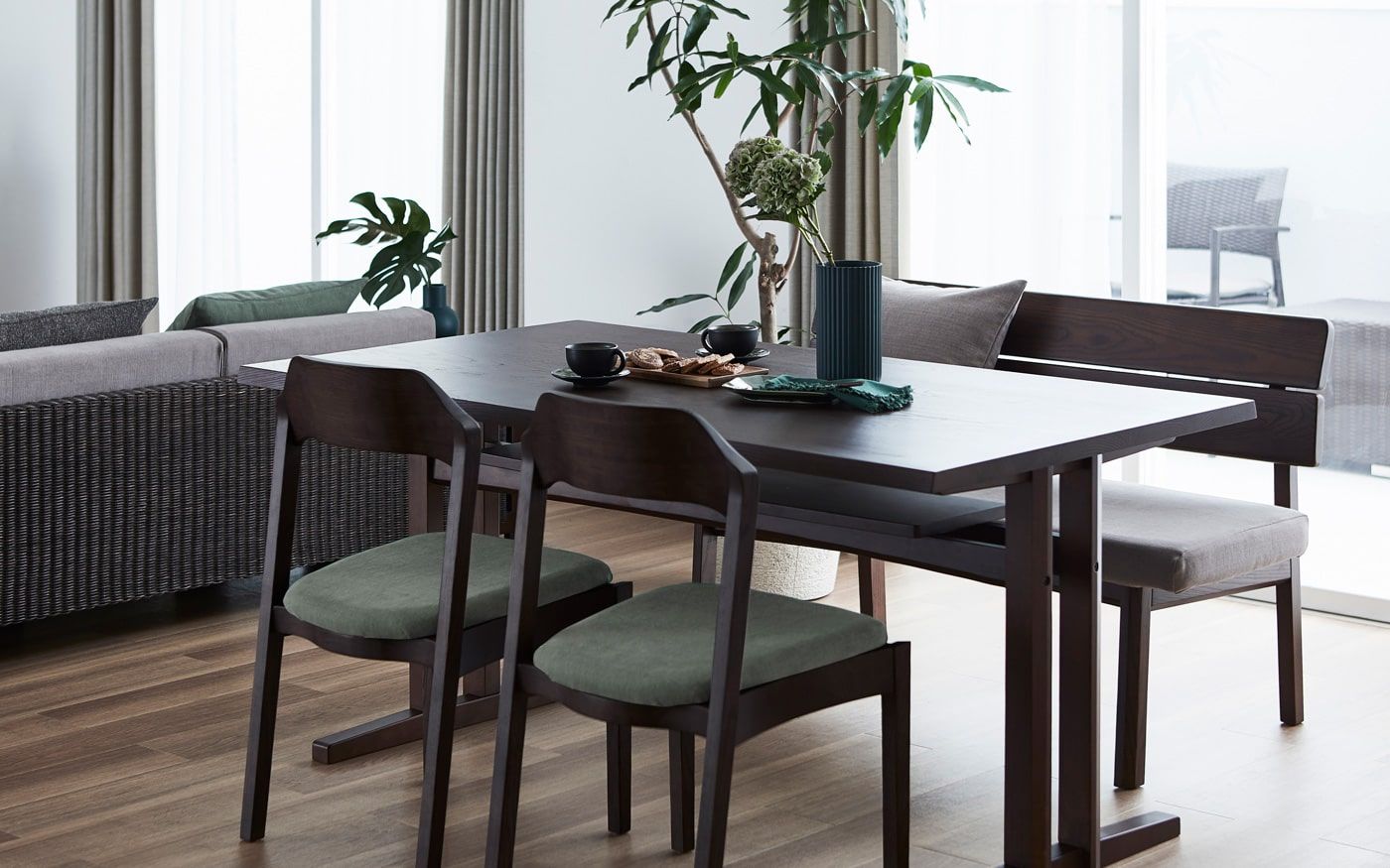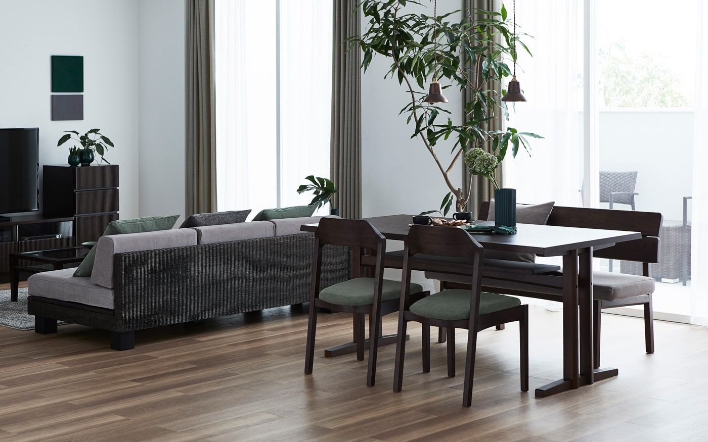 静かな朝方の森をイメージして色合わせを行ったカラーコーデ。グレーの中でも温もり感のあるCLグレージュをベンチカバーやソファカバーに選び、静寂さを感じる淡いグリーンのCLハーブをプラスして、静けさのある澄んだ雰囲気の食卓に仕上げています。