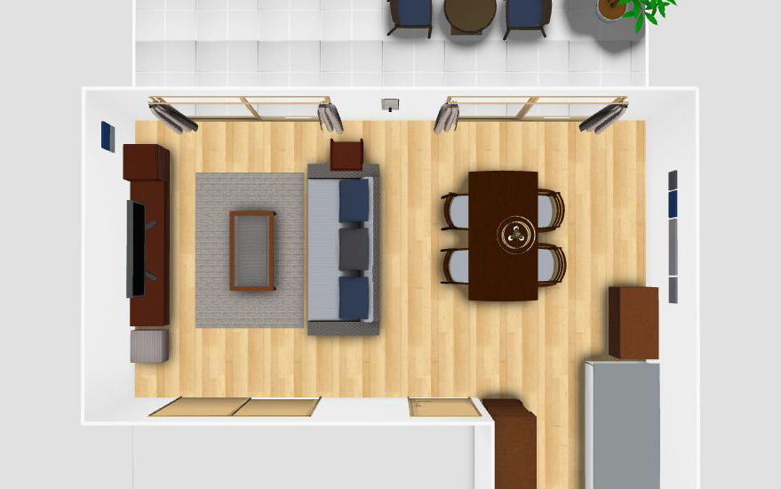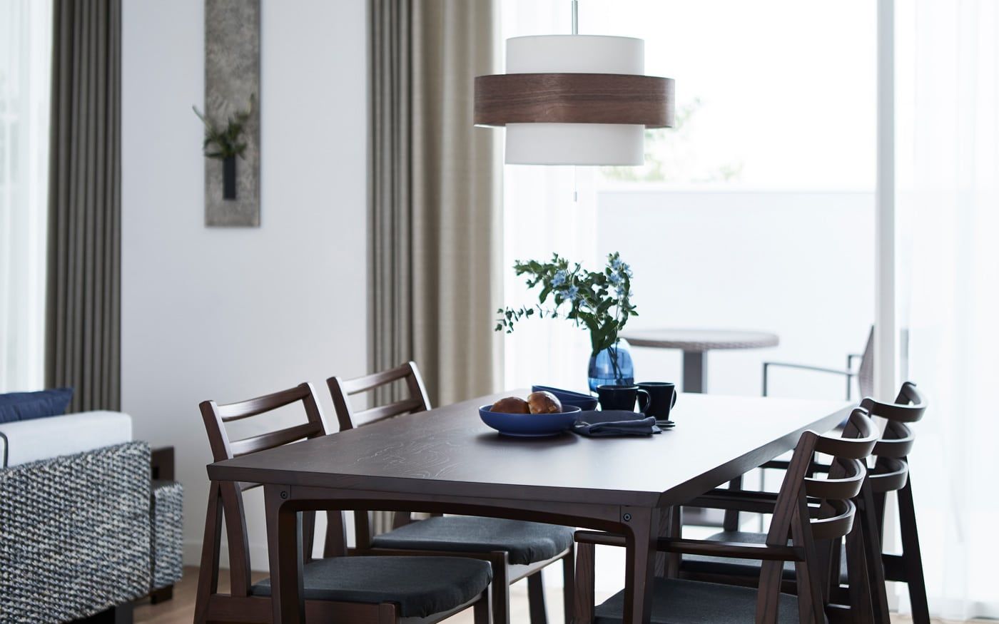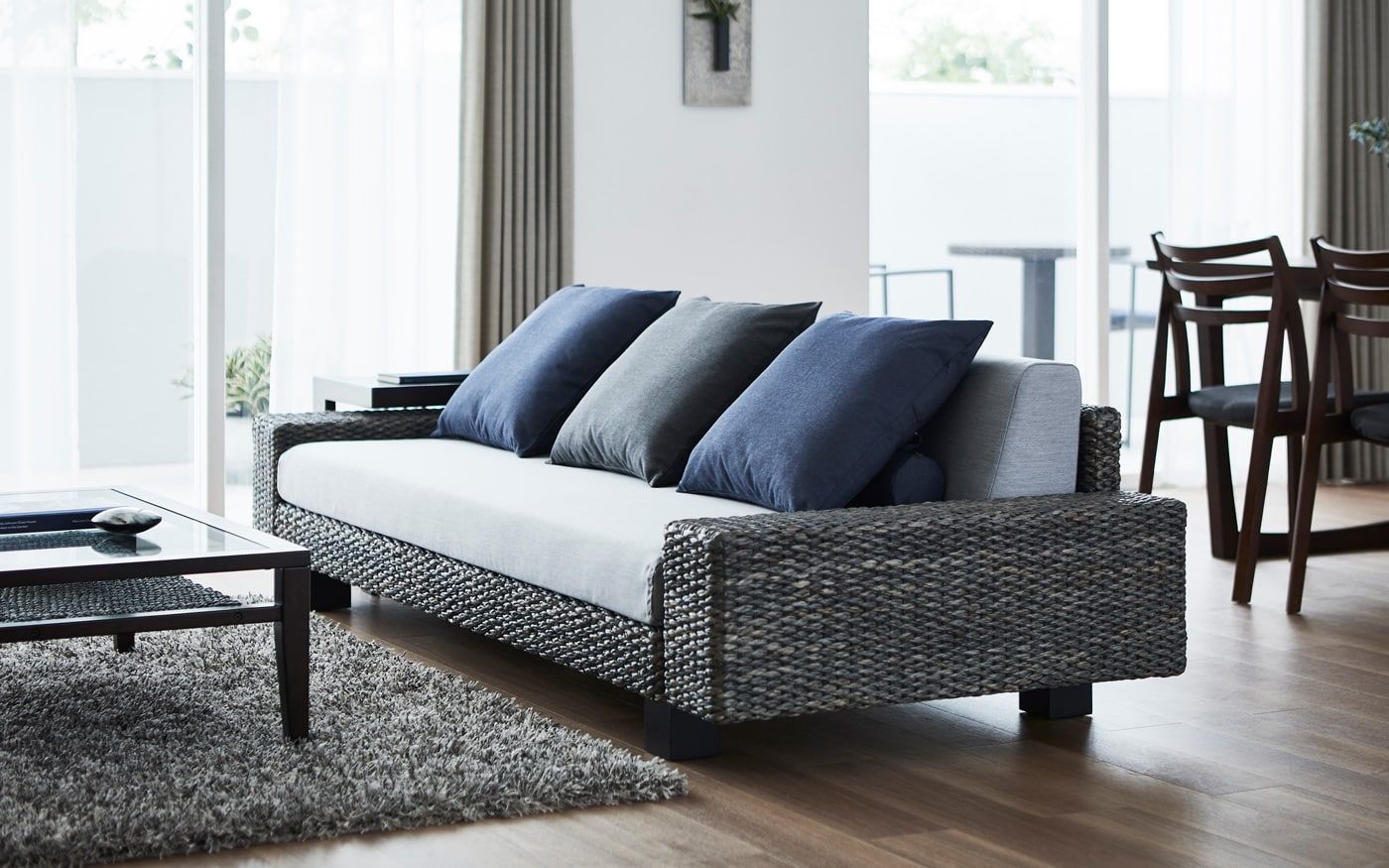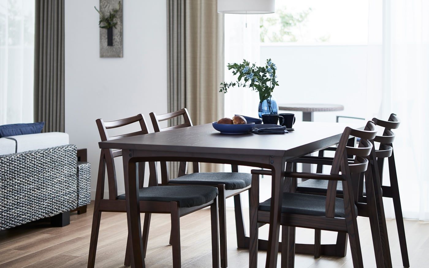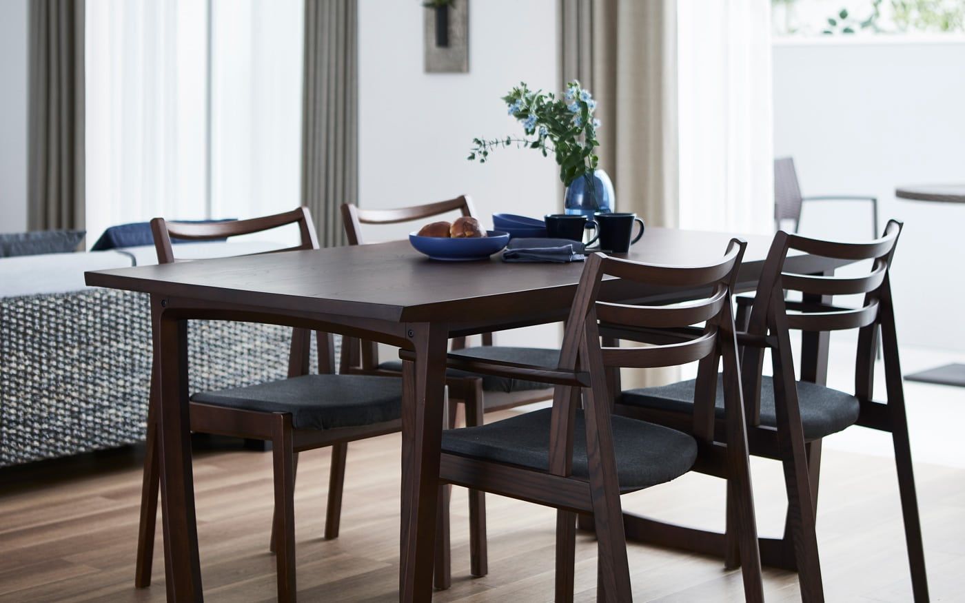 静かな朝方の森をイメージして色合わせを行ったカラーコーデ。グレーの中でも温もり感のあるCLグレージュをベンチカバーやソファカバーに選び、静寂さを感じる淡いグリーンのCLハーブをプラスして、静けさのある澄んだ雰囲気の食卓に仕上げています。
