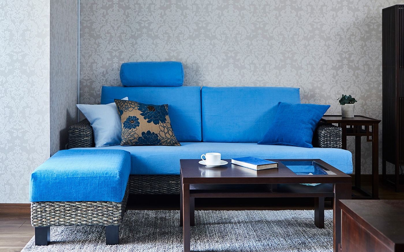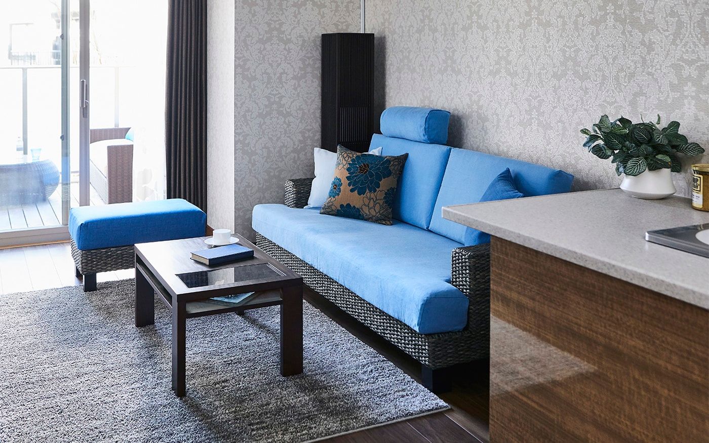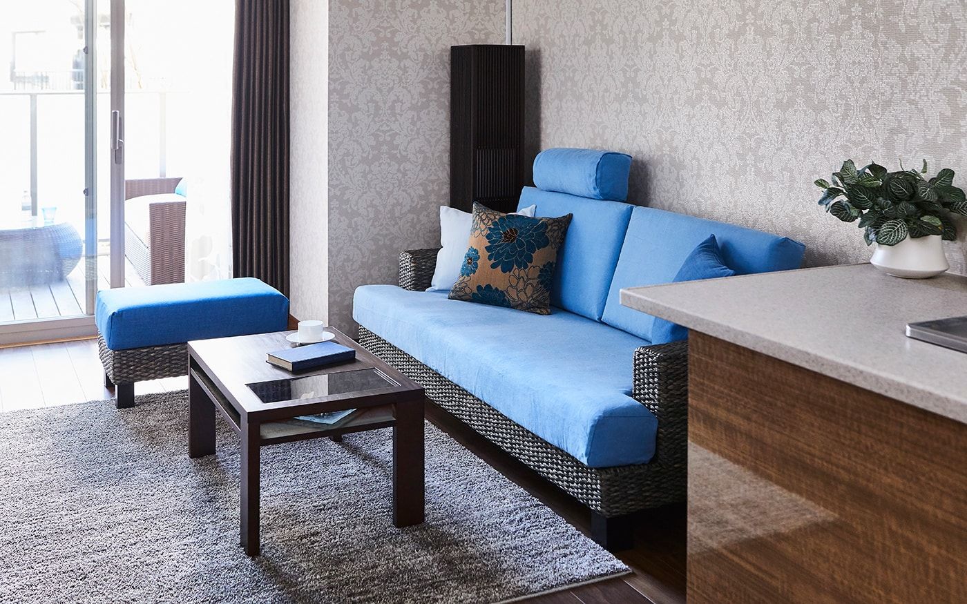 ソファカバーには、〈CLウォーターブルー〉を、オットマンカバーには〈CLインディゴ〉を使用して、トーンの違うブルーの組合せとなります。トーンが違うことで、ソファ周りに動きや立体感が生まれ、印象的なインテリアに。爽やかなリゾートの雰囲気を味わえる部屋が叶うでしょう。
