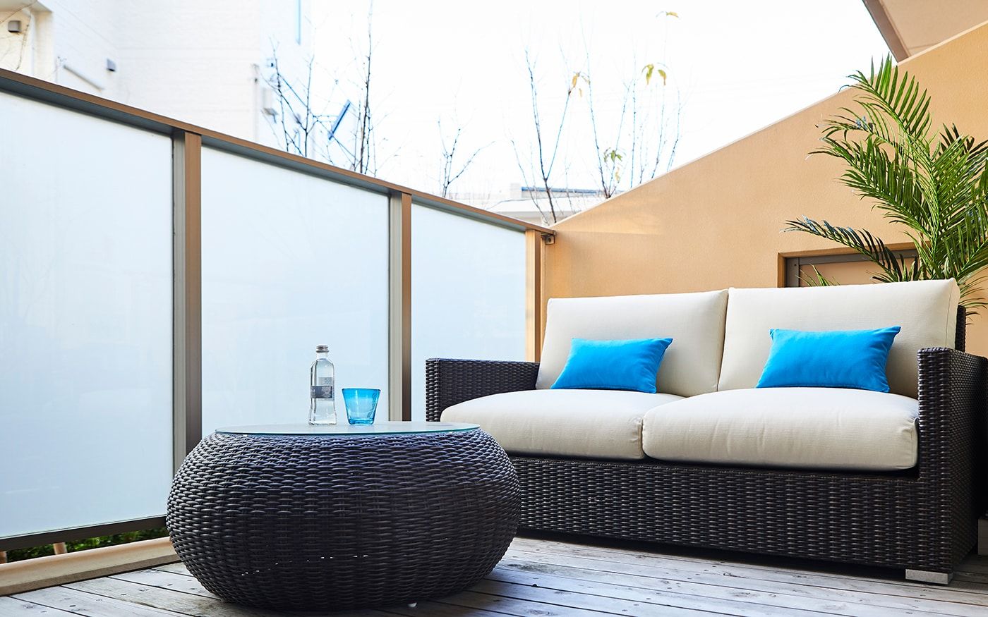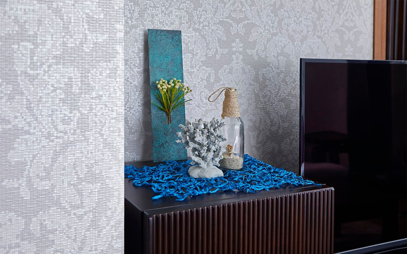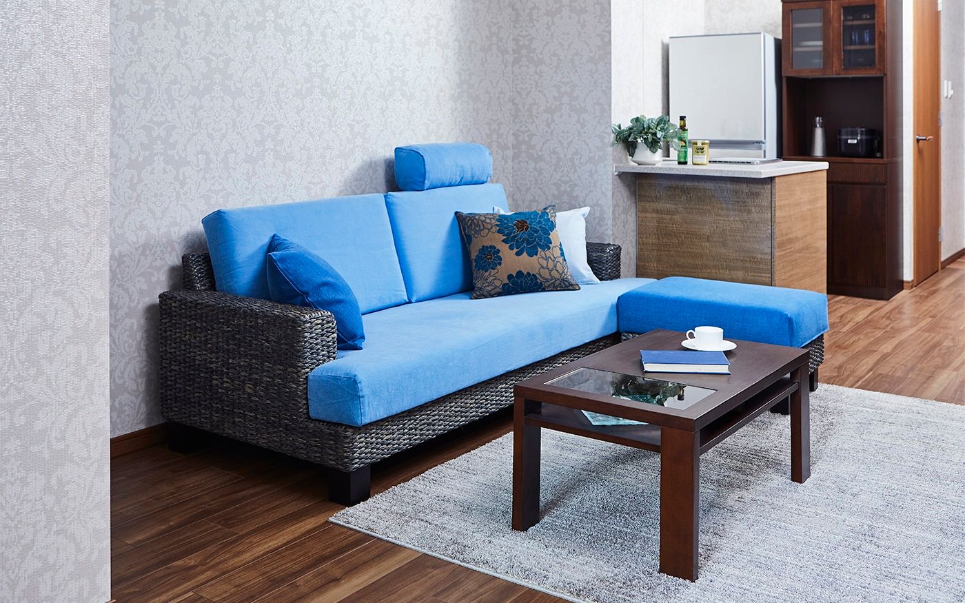 ソファカバーには、〈CLウォーターブルー〉を、オットマンカバーには〈CLインディゴ〉を使用して、トーンの違うブルーの組合せとなります。トーンが違うことで、ソファ周りに動きや立体感が生まれ、印象的なインテリアに。爽やかなリゾートの雰囲気を味わえる部屋が叶うでしょう。