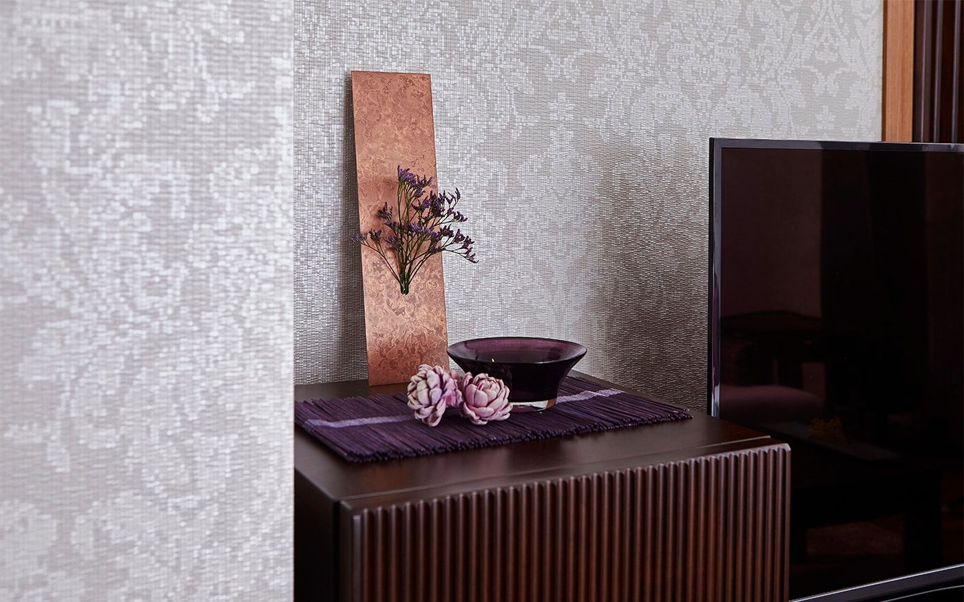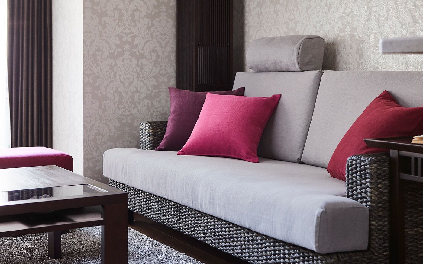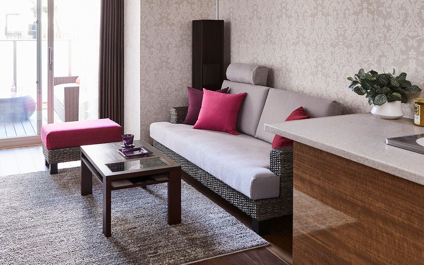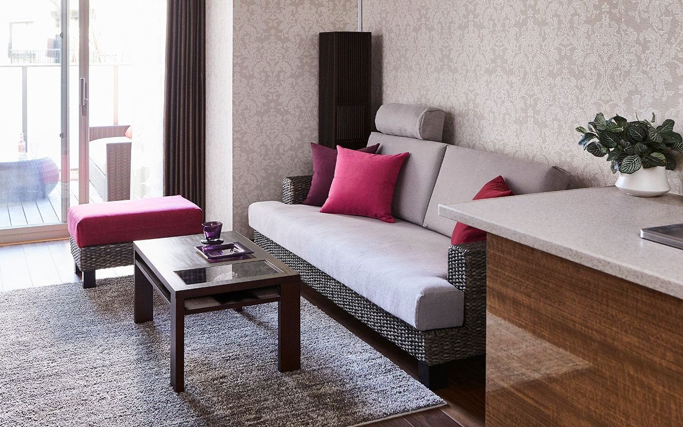 ソファカバーに使用した〈CLクラウド〉が醸し出す上品で高貴な落ち着いた雰囲気をベースに、濃いピンクの〈CLプラム〉を加えて、女性らしいラグジュアリーなインテリアを演出。空間全体が華やかで温かみのあるインテリアに仕上がるでしょう。
