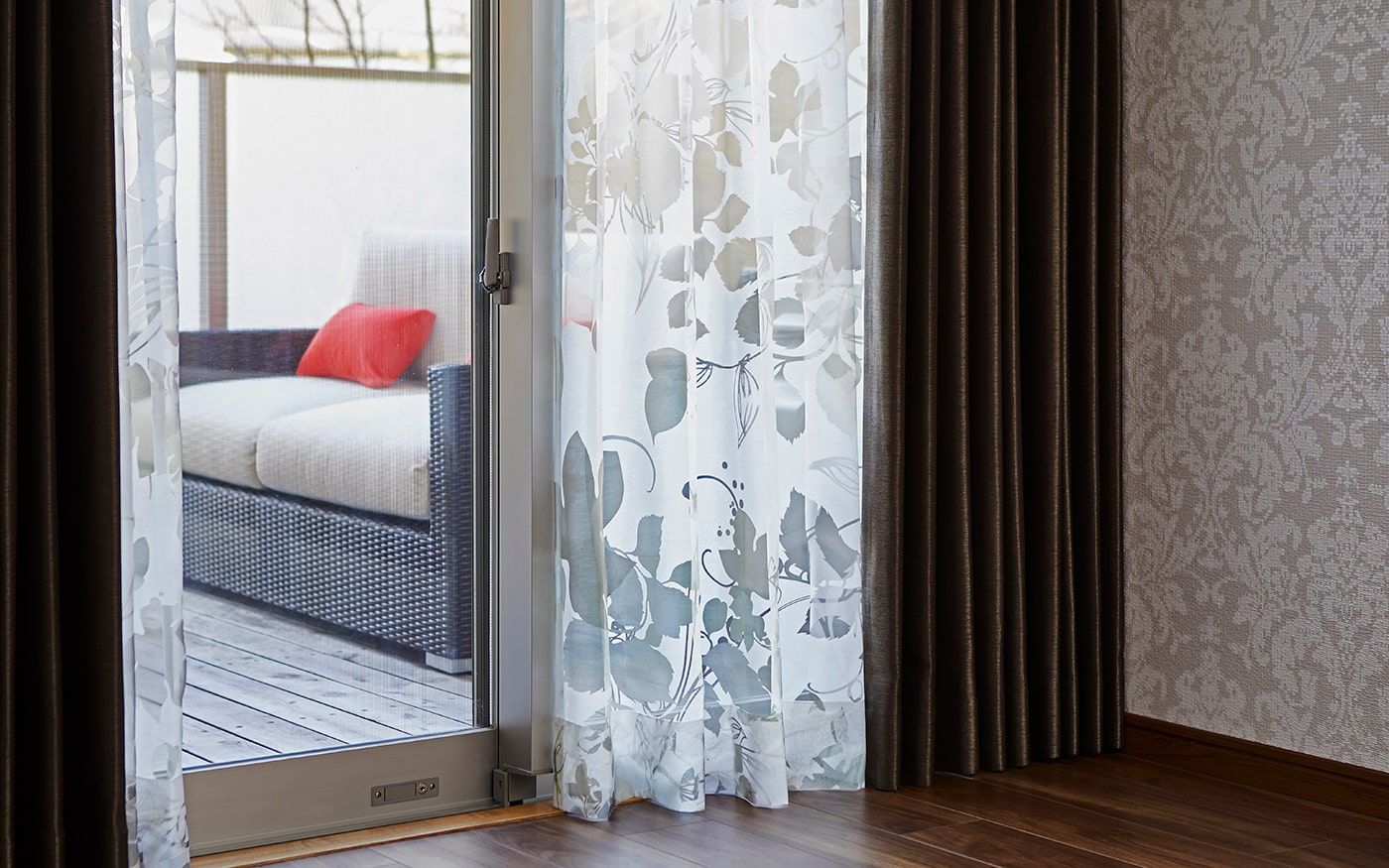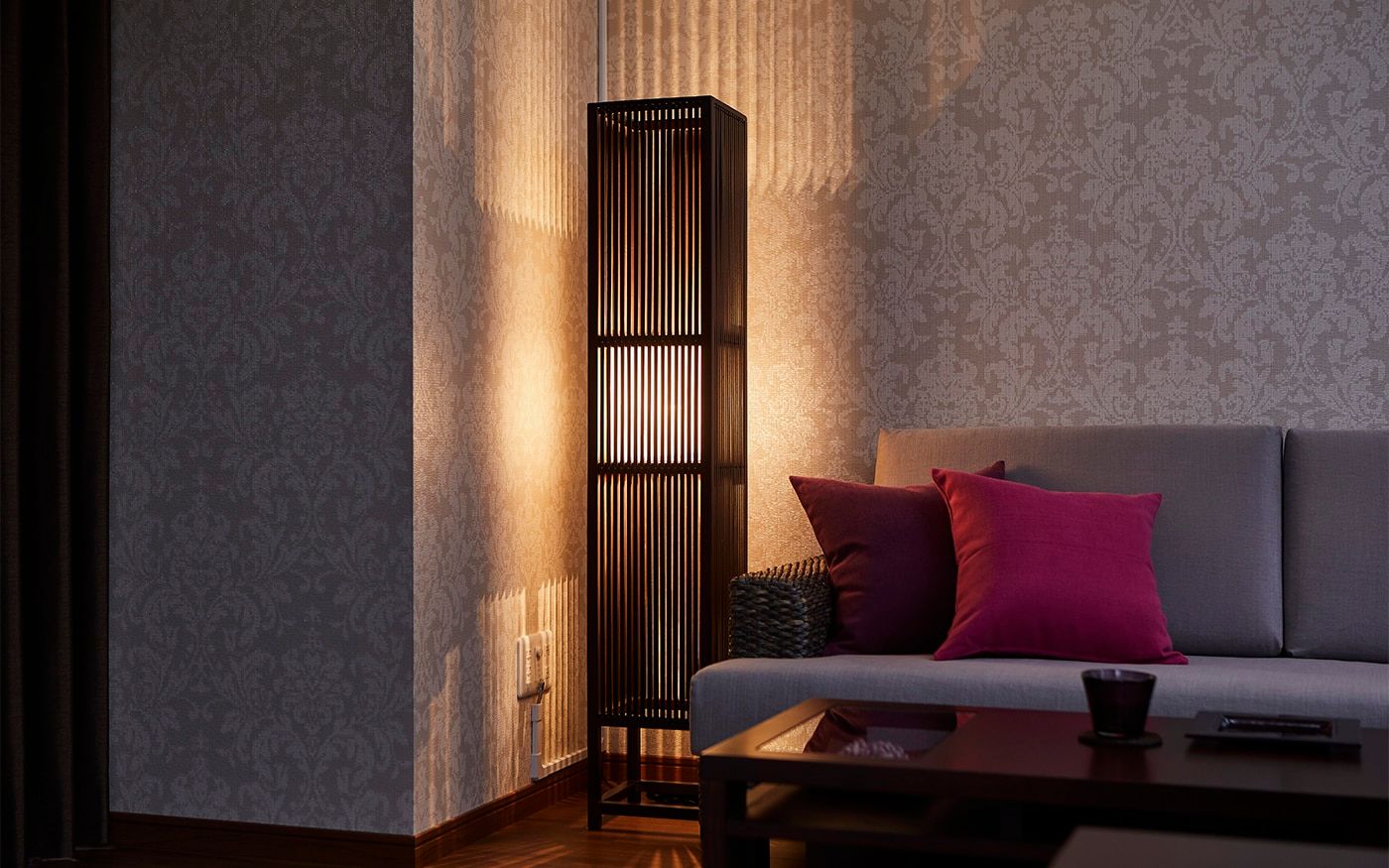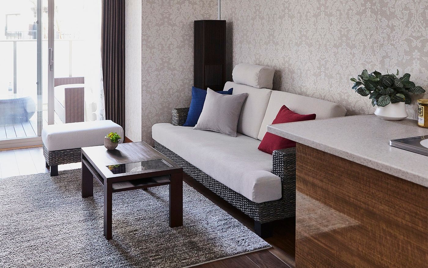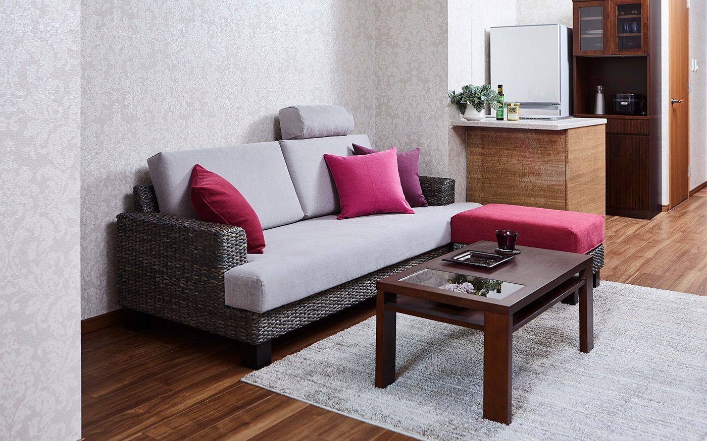 ソファカバーに使用した〈CLクラウド〉が醸し出す上品で高貴な落ち着いた雰囲気をベースに、濃いピンクの〈CLプラム〉を加えて、女性らしいラグジュアリーなインテリアを演出。空間全体が華やかで温かみのあるインテリアに仕上がるでしょう。