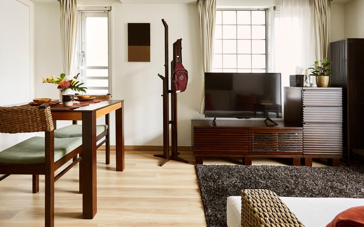 ダイナミックで荒々しい自然の美しさを感じるハワイの連なる山並みや、山越しに見える水平線をなどをイメージしてルーバーデザインのテレビボードやキャビネットをチョイス。片山のセットで組むことで自然なアシンメトリーが生まれ、また木々を連想させるコートハンガーやファブリックパネルを壁面に飾って高低差も演出し、空間に山々の自然感を表現しました。