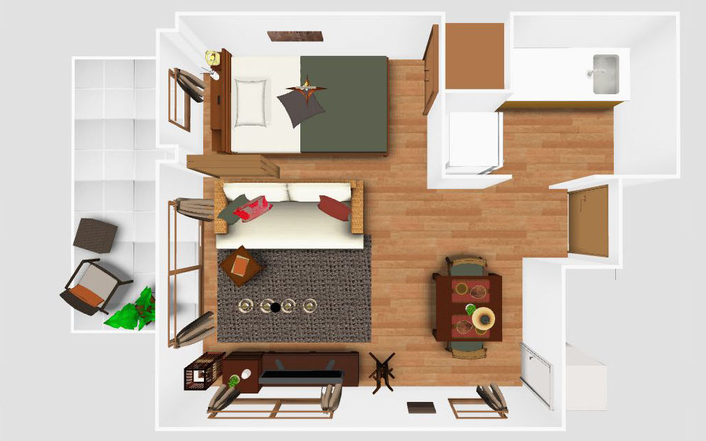火山活動から生まれたハワイの山々は緑の美しさもあれば、黒々とした岩肌が露出した荒々しさも有ります。また、その広大なロケーションに夕日が落ちれば幻想的な風景も生み出してくれます。そんなハワイの自然を部屋で楽しむため、クッションカバーやラグ、壁面装飾などで表現しました。グリーン、レッド、ブラウンの3色をベースに夕日のような温もりを生む照明を加えて、楽園ハワイのような部屋が完成しています。