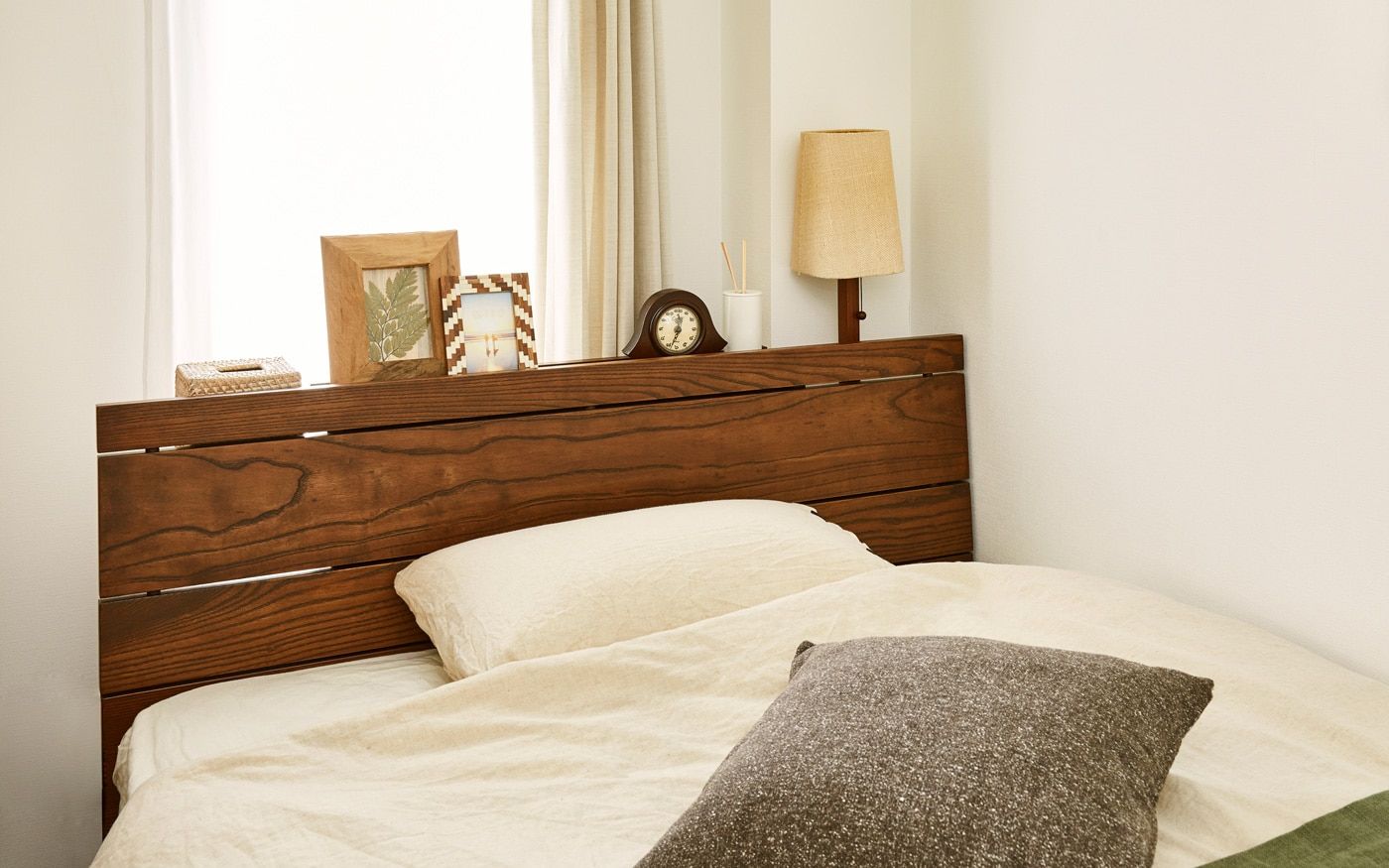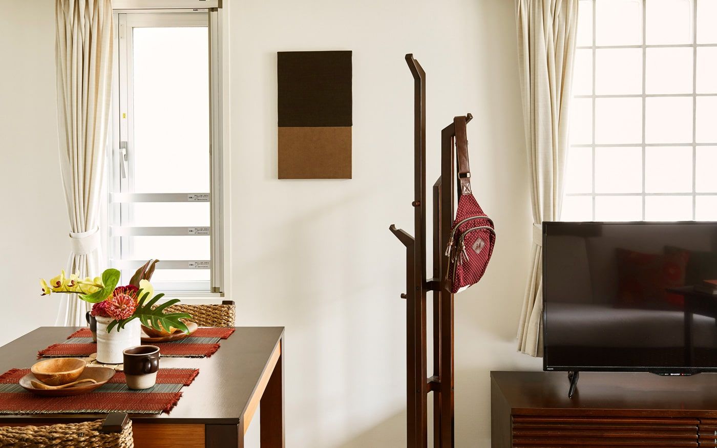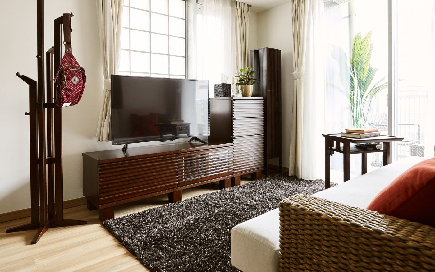 ダイナミックで荒々しい自然の美しさを感じるハワイの連なる山並みや、山越しに見える水平線をなどをイメージしてルーバーデザインのテレビボードやキャビネットをチョイス。片山のセットで組むことで自然なアシンメトリーが生まれ、また木々を連想させるコートハンガーやファブリックパネルを壁面に飾って高低差も演出し、空間に山々の自然感を表現しました。