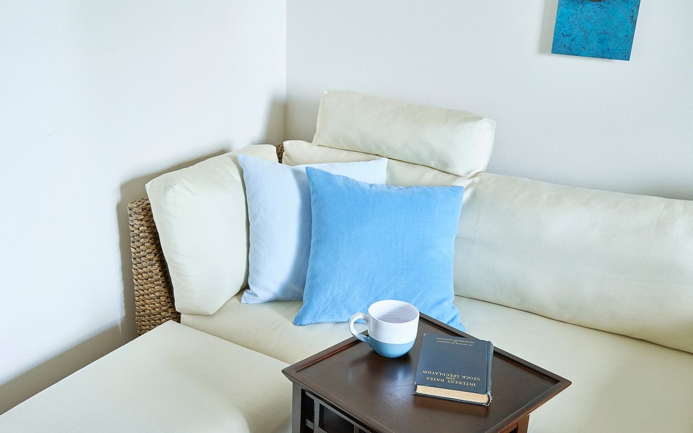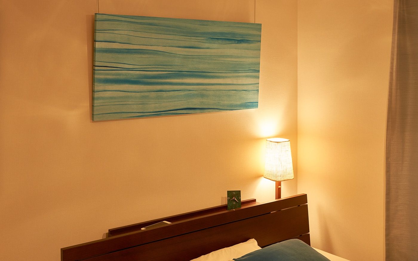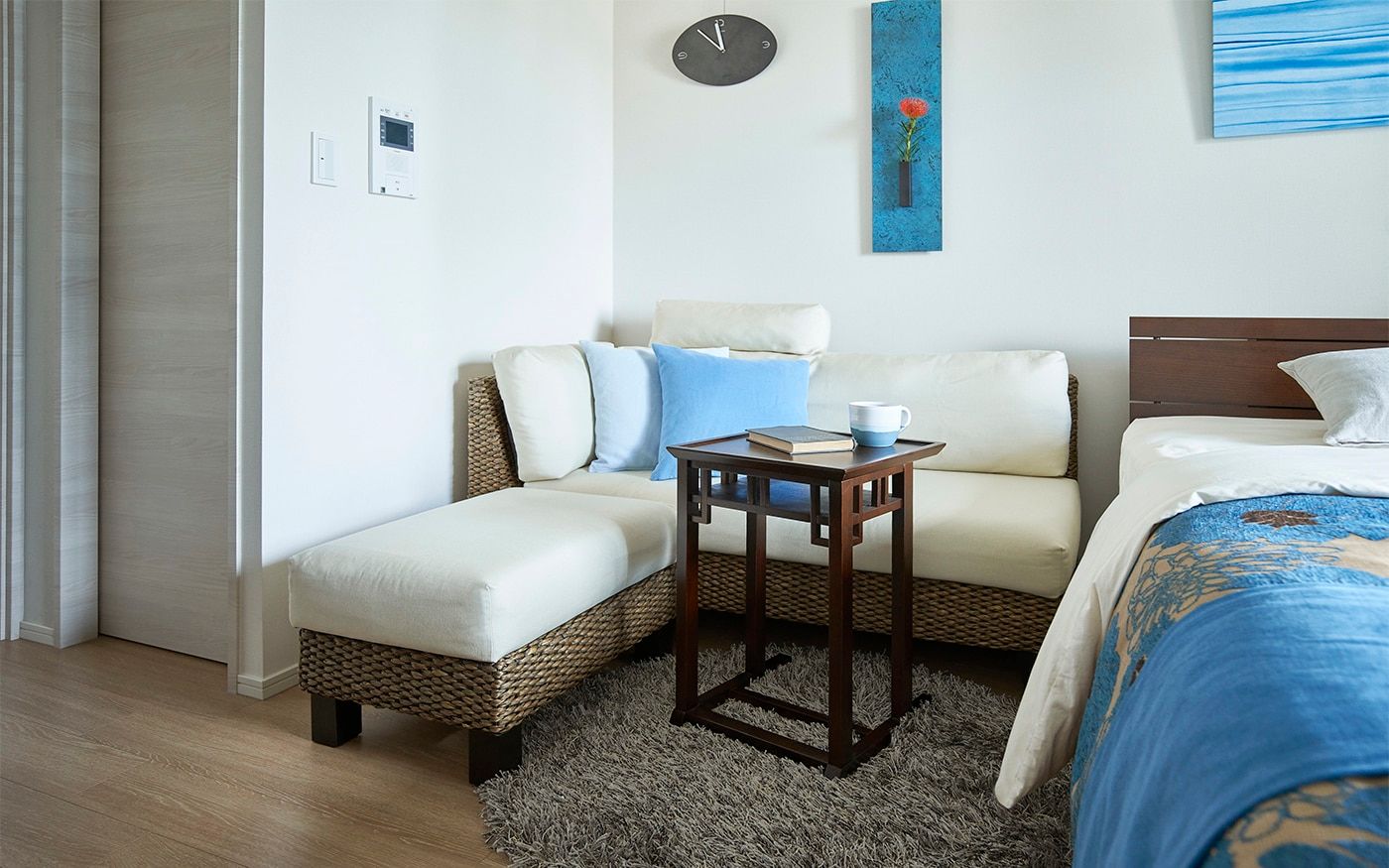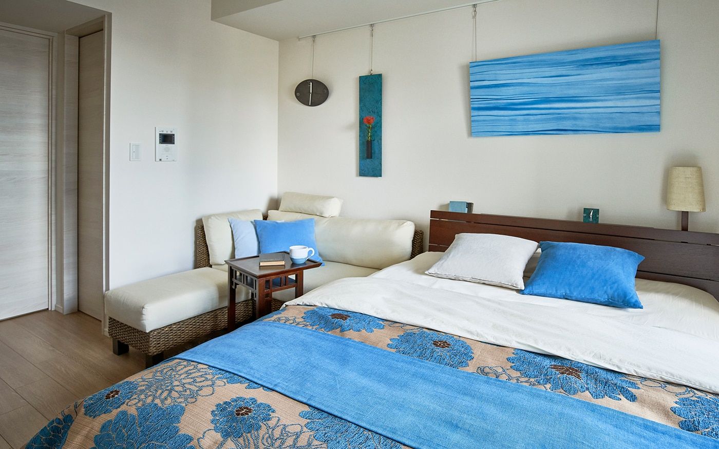 リゾートの雰囲気を演出しやすいヒヤシンス素材を使用したソファを採用して、ホテルライクな空間に。コンパクト設計のためワンルームでも配置しやすく、くつろぎ方のバリエーションを増やしてくれます。また、主要な家具の他にも、インテリア小物で空間にアクセントを入れました。壁を鮮やかにしてくれる壁面装飾には、波打ち際を連想させるブルーのアートパネルと、日本の伝統工芸を用いた美しい発色の一輪挿しを使用。