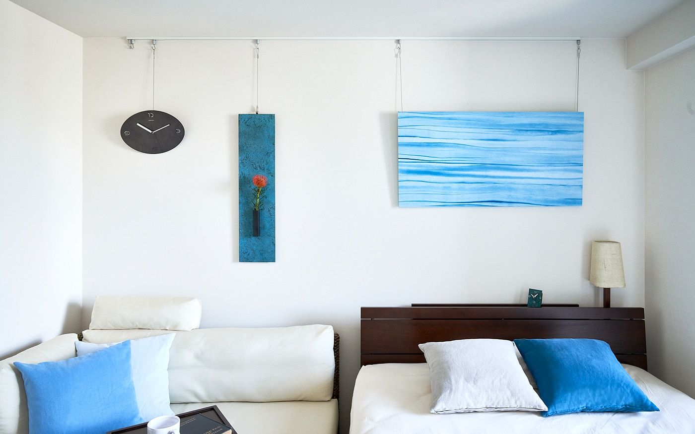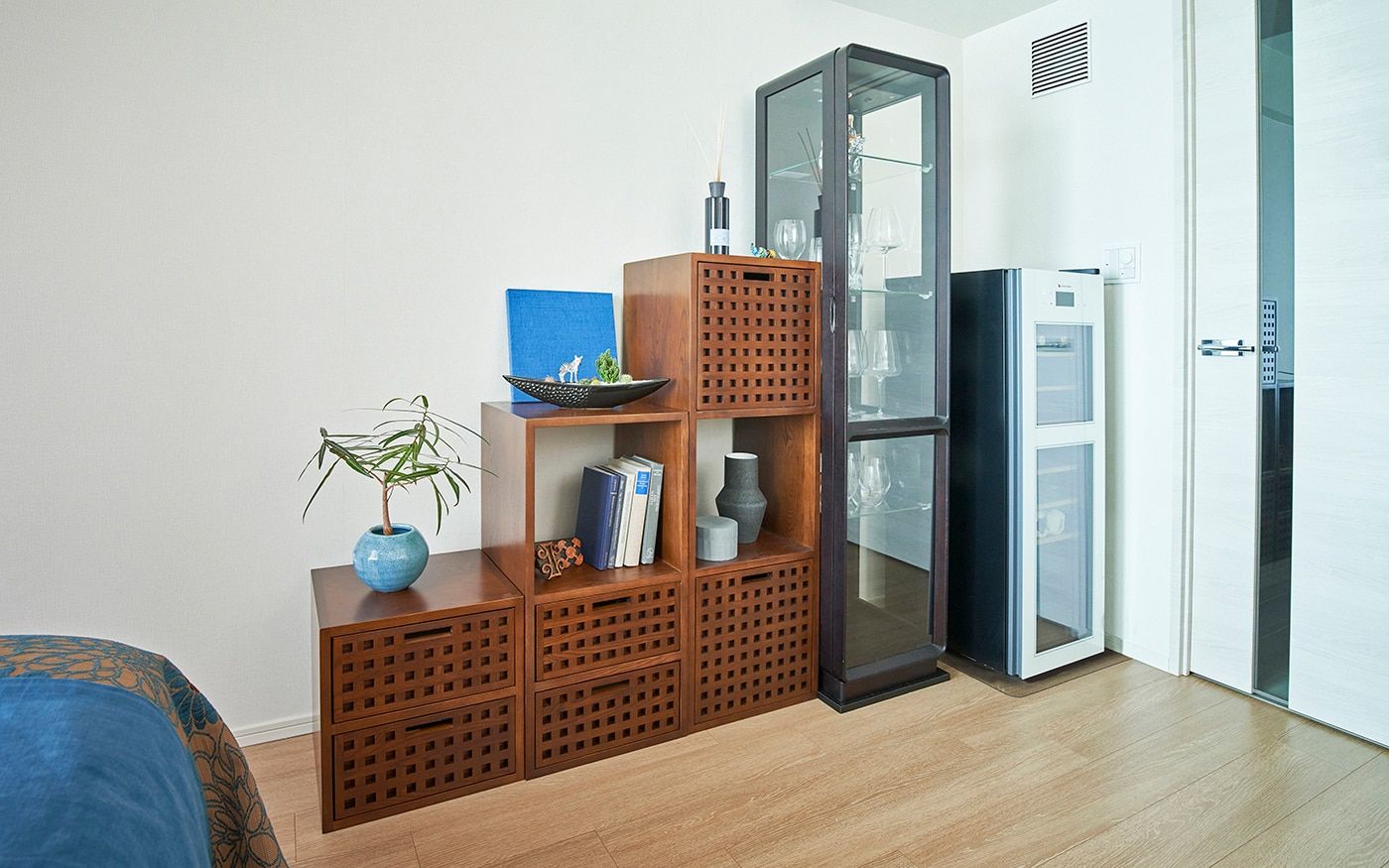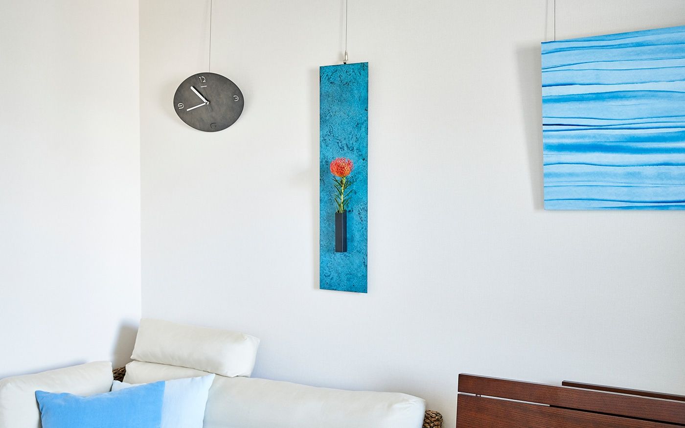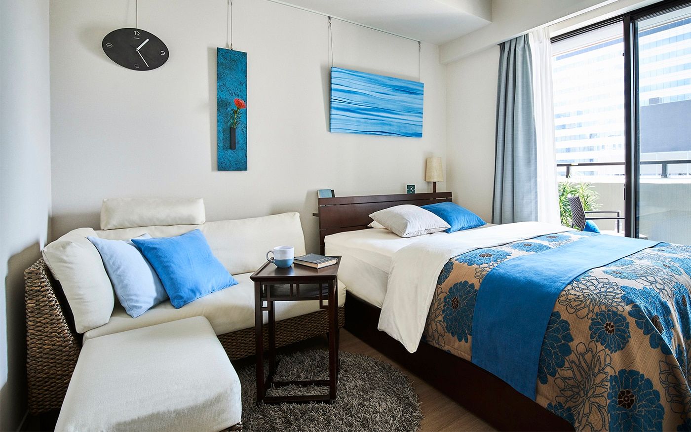 リゾートの雰囲気を演出しやすいヒヤシンス素材を使用したソファを採用して、ホテルライクな空間に。コンパクト設計のためワンルームでも配置しやすく、くつろぎ方のバリエーションを増やしてくれます。また、主要な家具の他にも、インテリア小物で空間にアクセントを入れました。壁を鮮やかにしてくれる壁面装飾には、波打ち際を連想させるブルーのアートパネルと、日本の伝統工芸を用いた美しい発色の一輪挿しを使用。